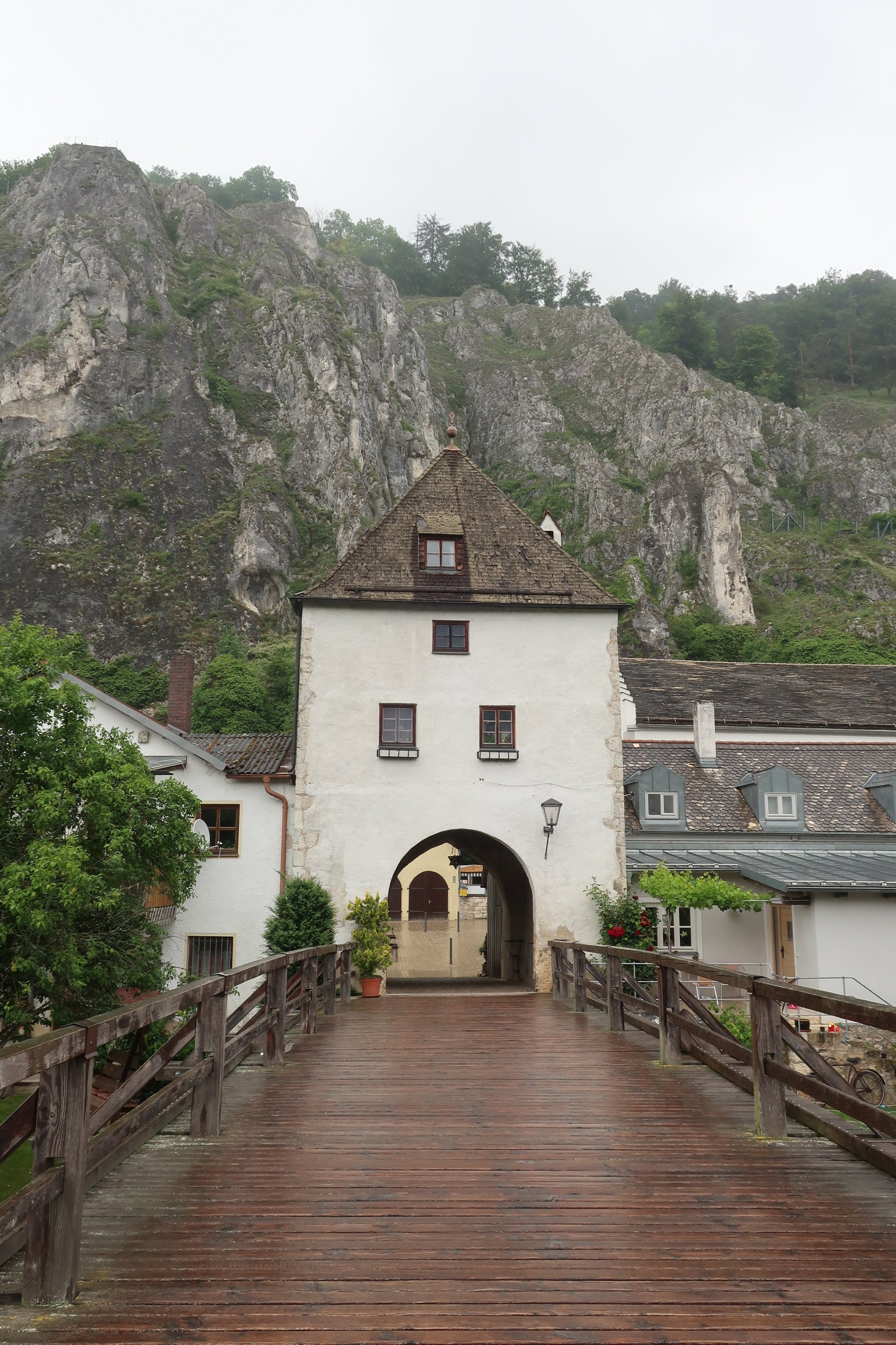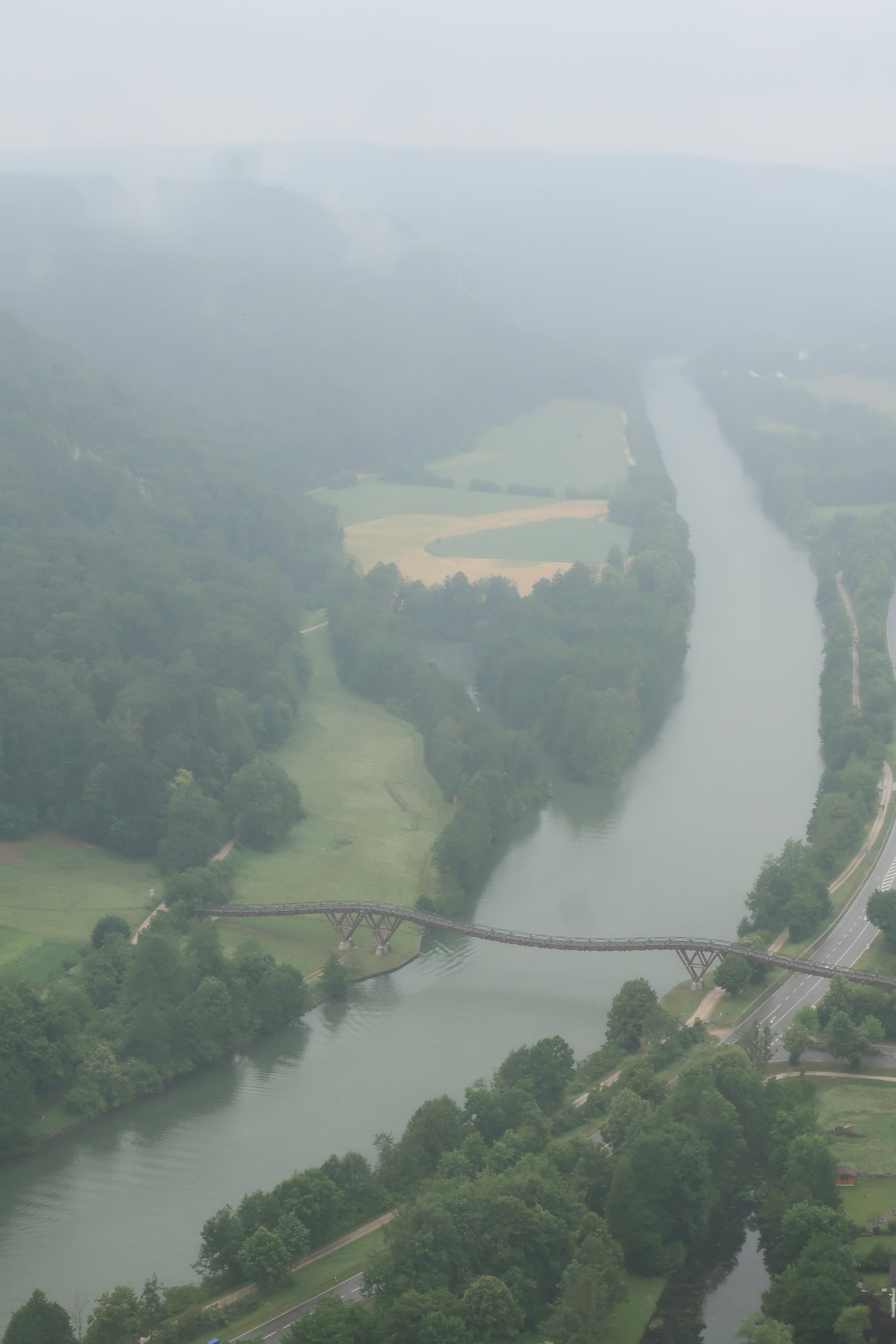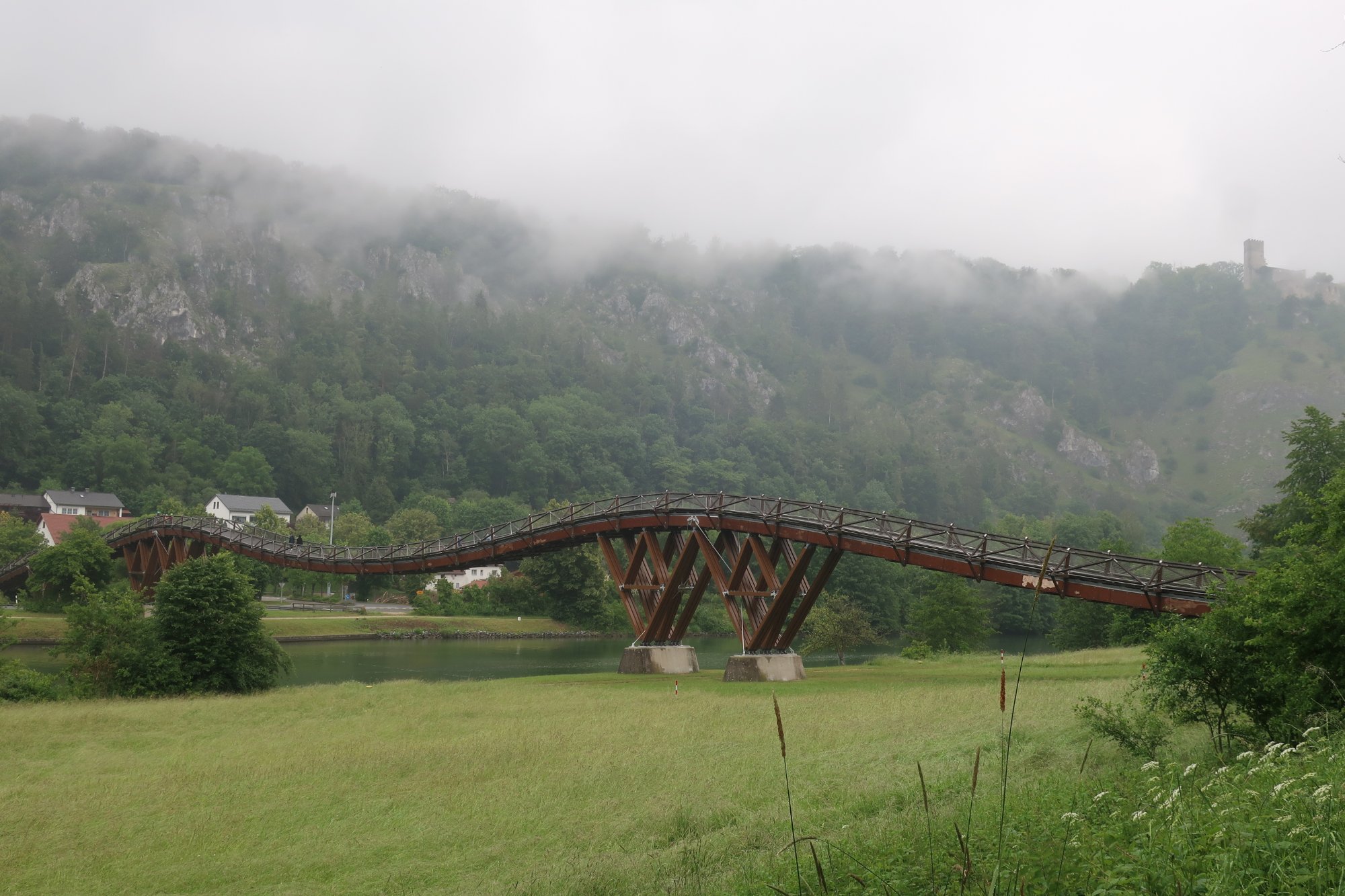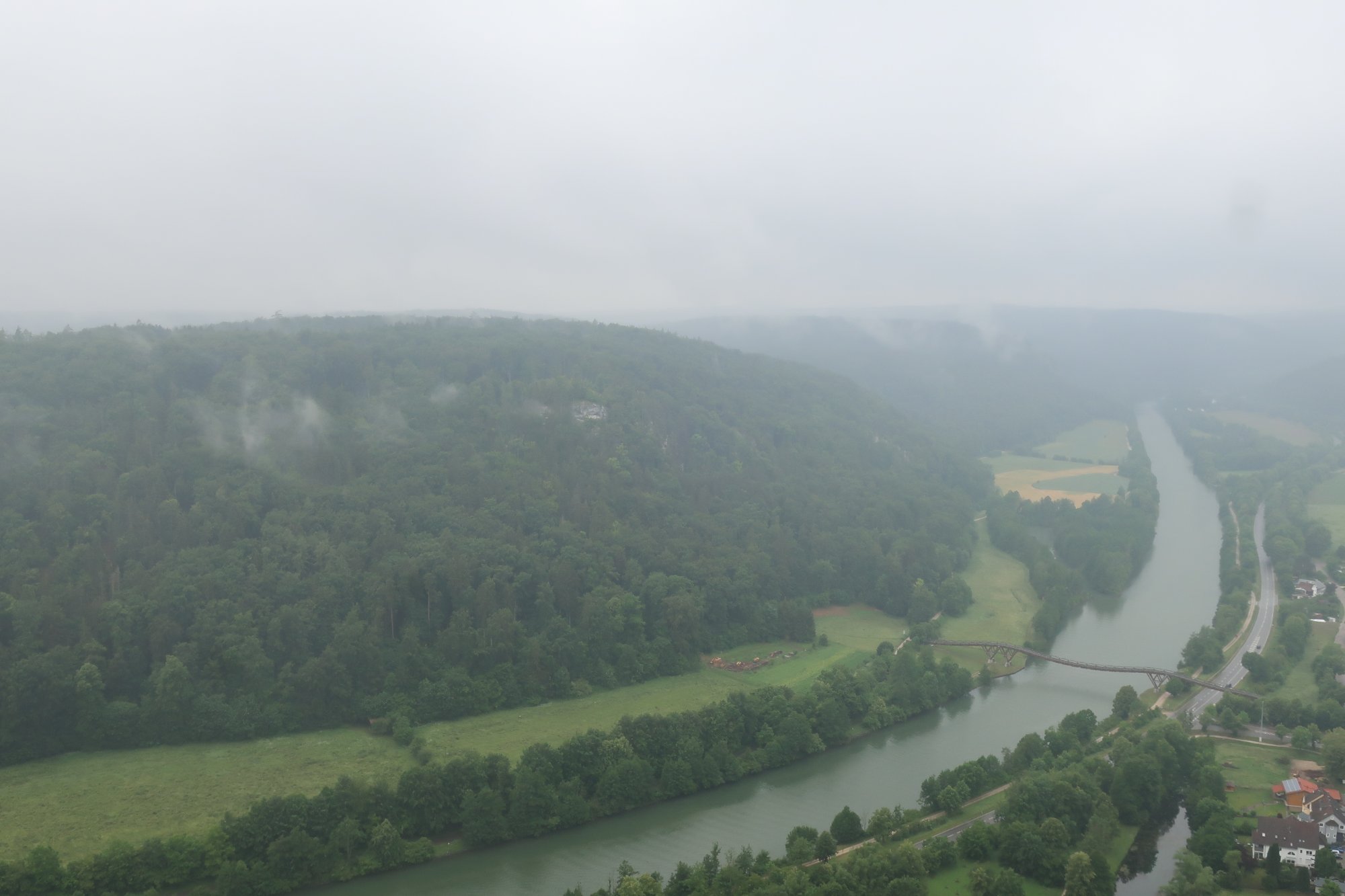 Von der Burg Randeck hoch über Essing hat man einen schönen Ausblick. Heute mit etwas tief hängenden Regenwolken. Der “Tatzelwurm”, die Holzbrücke über die Altmühl und den Main-Donau-Kanal soll angeblich die längste ihrer Art in Europa sein.