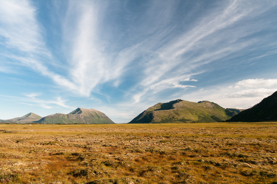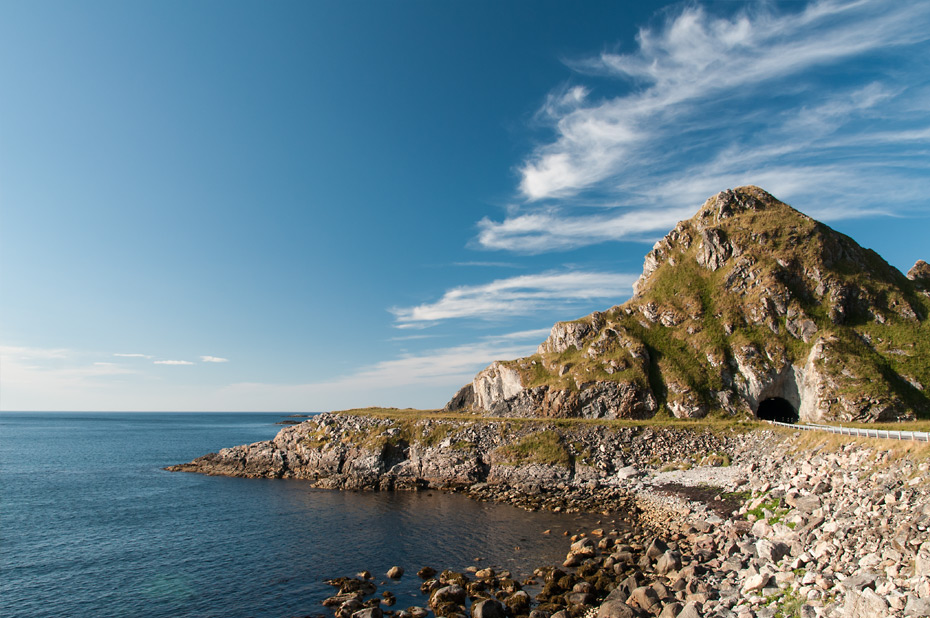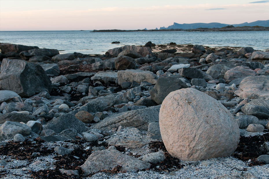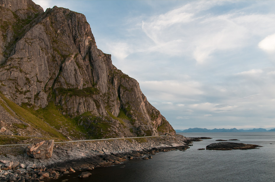 Als wir noch ein Stück weiter fahren, sehen wir draußen auf den Klippen einen Fotografen mit einem Stativ stehen. Der wird wohl nicht zufällig dort stehen. Also halten wir an und gehen in seine Richtung. Er kommt gerade zurück, wir fangen ein Gespräch über Landschaftsfotografie an und er zeigt uns noch einige schöne Stellen zum Fotografieren hier in der Gegend. In einigen Tagen wird er zu einem Fotoprojekt in die Finnmark aufbrechen. Unser Urlaub wird dann leider schon zu Ende sein.