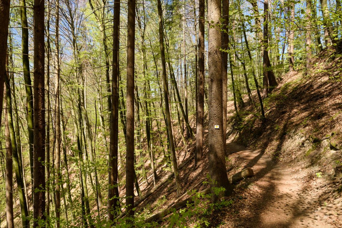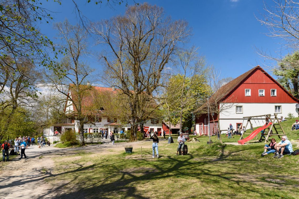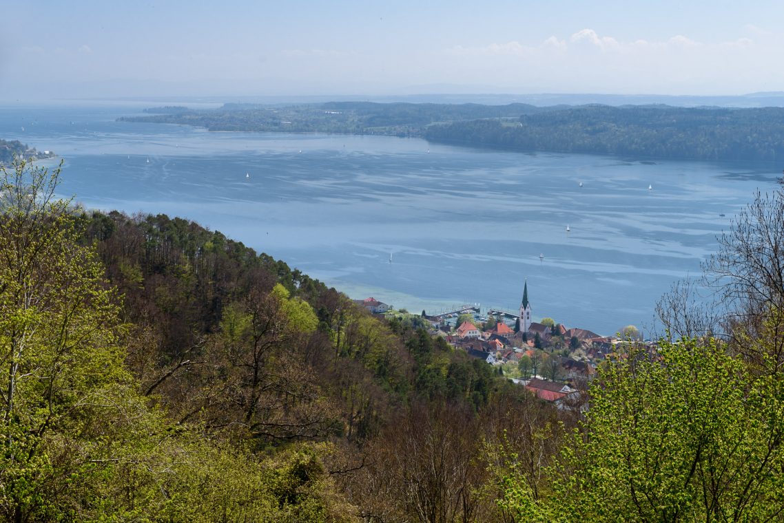 Bei Ludwigshafen biegt der Weg ab und es geht in den Wald hinein. Im Sommer bei heißen Temperaturen sicherlich eine willkommene Abwechslung. Im April ist das Blätterdach noch sehr licht, die wenigen Blätter der Laubbäume leuchten in frühlingshaftem Hellgrün in der Sonne. War der Blütenweg vorne am Ufer noch recht stark frequentiert, wird es nun bedeutend ruhiger. Der Weg steigt stetig an, bis wir nach gut 20 Minuten auf einer Wiese wieder aus dem Wald heraus kommen. In der Ferne sehen wir einen Bauernhof ein Stück dahinter ein Gasthaus. Der Haldenhof scheint ein beliebtes Ausflugsziel zu sein. Auch wenn er heute aufgrund der aktuellen Lage geschlossen hat und seine Speisen nur To Go anbieten kann, ist hier einiges los. Bei der Lage und dem Ausblick wundert es uns aber auch nicht.