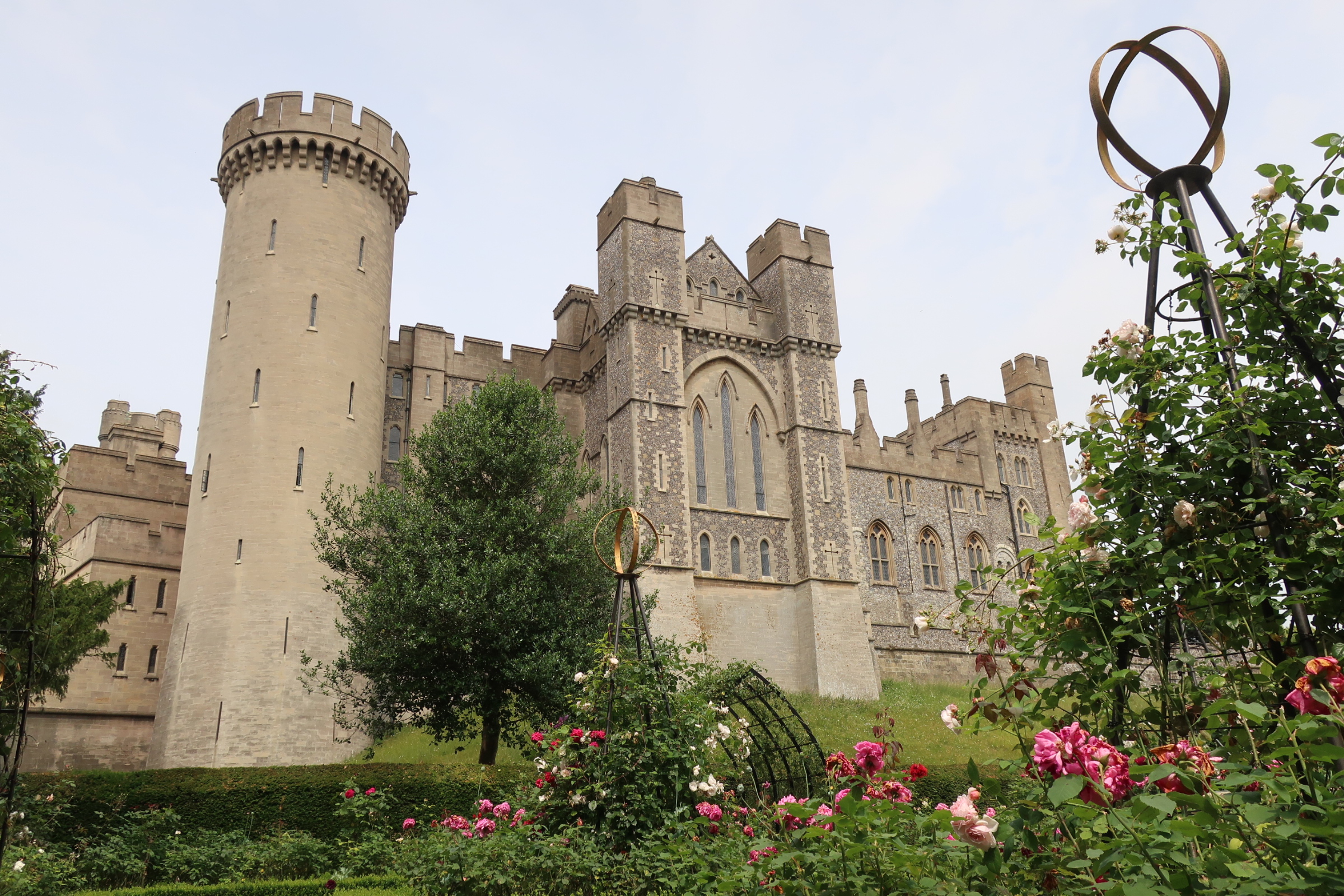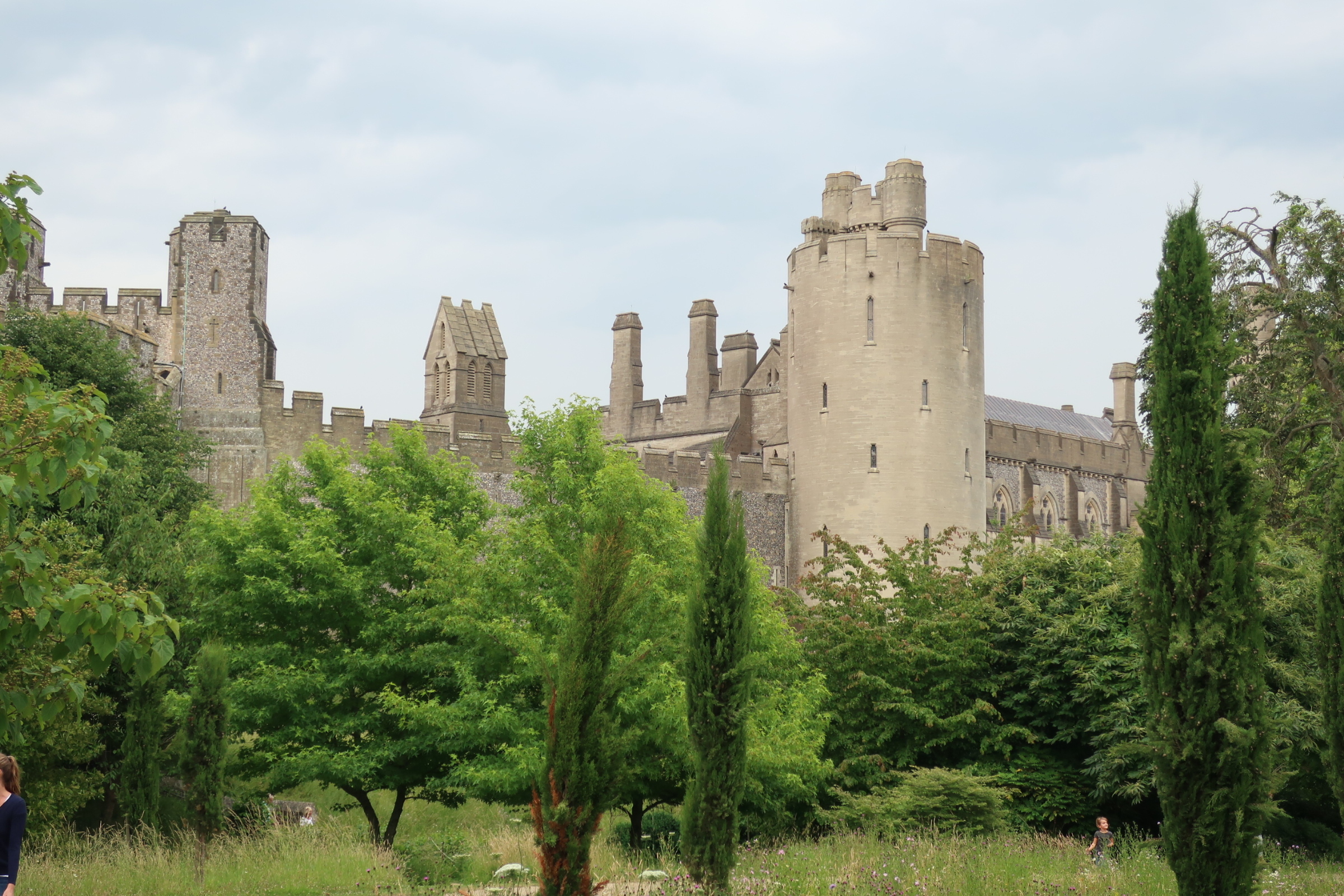 Arundel Castle. Die Schlossanlagen sind riesig. Das verwinkelte Gebäude kommt mächtig daher. Viele Türme, unterschiedliche Formen. Eine alte Burganlage aus dunklem Stein, daran anschließend ein neuerer Teil – eher ein Schloss – aus helleren Gestein. Alles super erhalten und gepflegt.