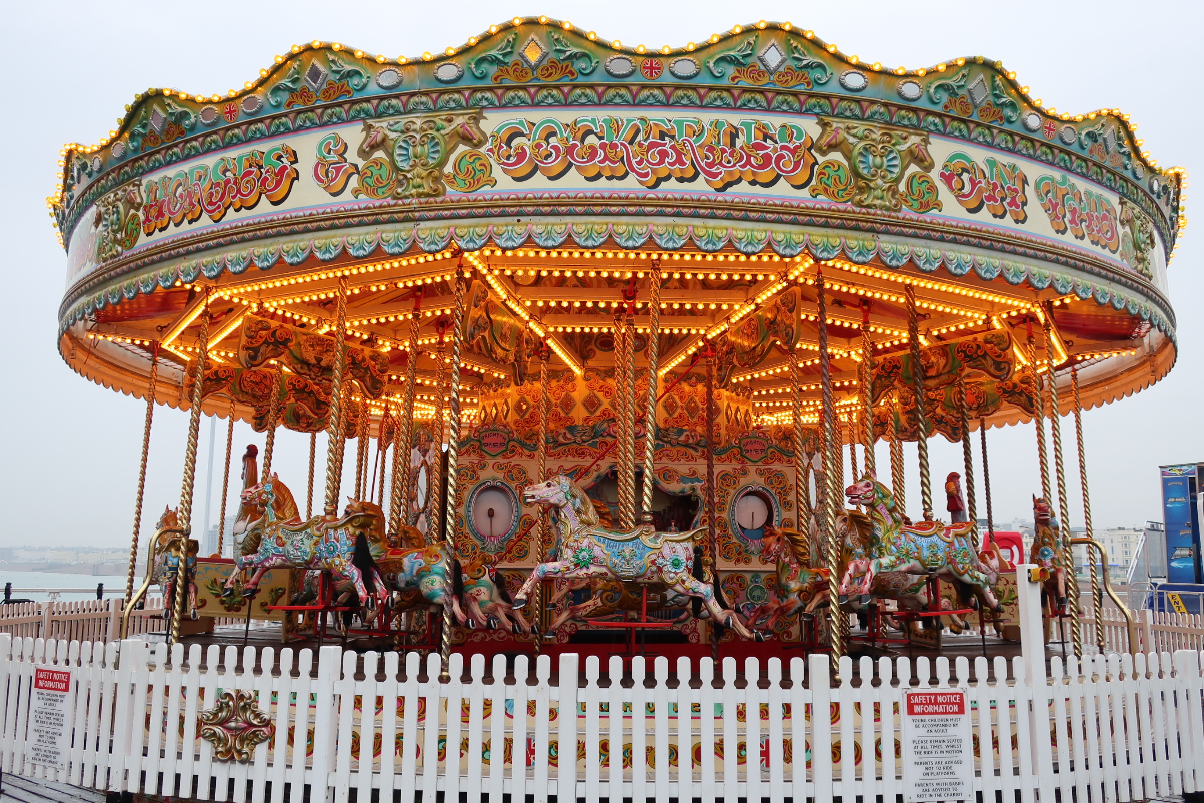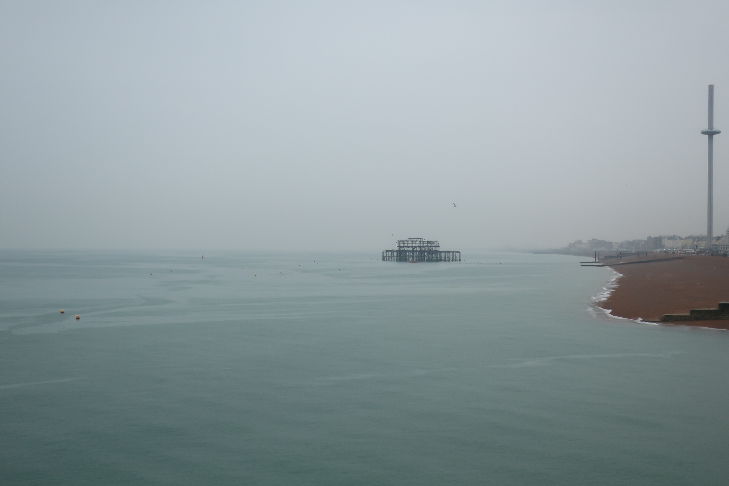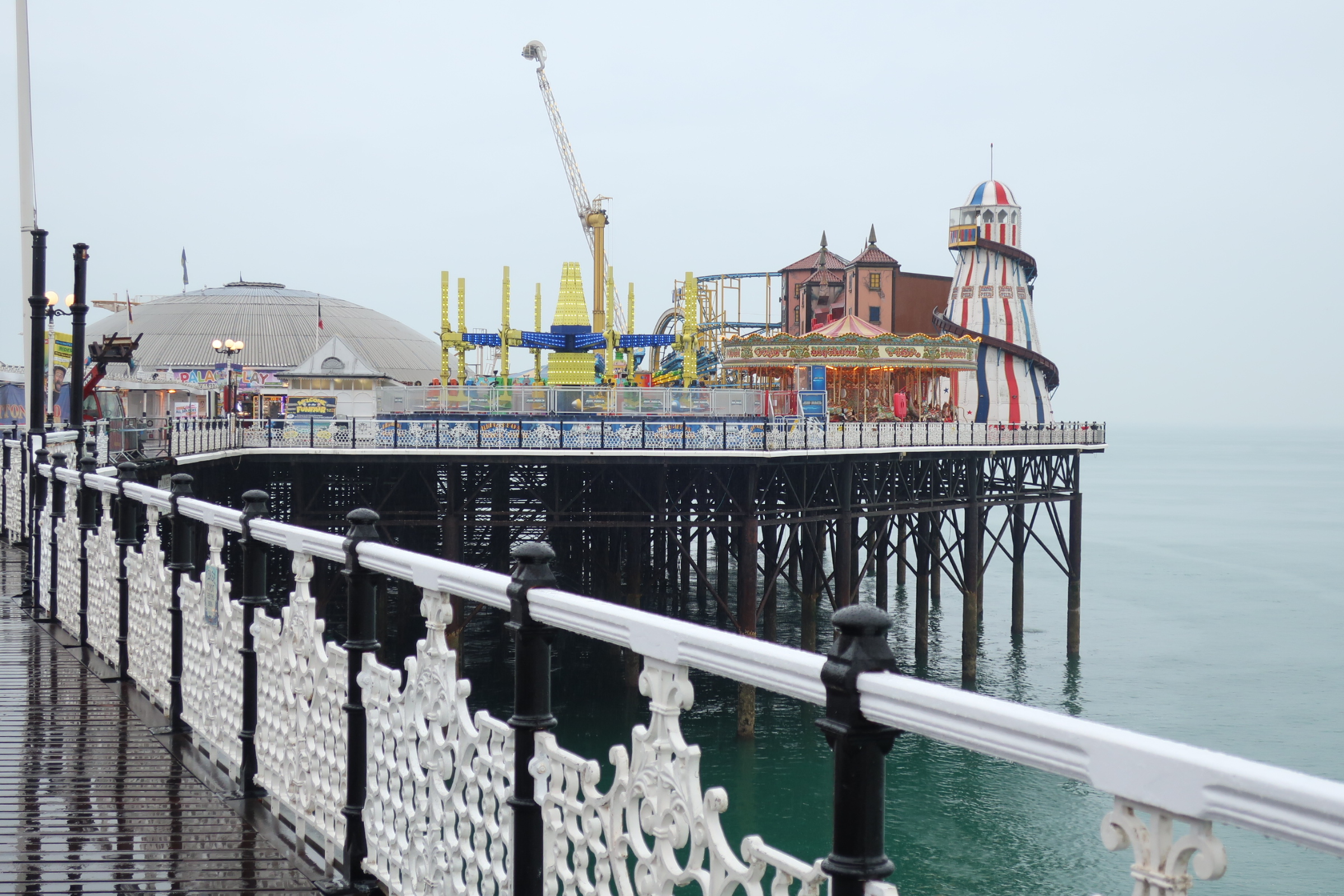 Und dann vorne am Wasser das “Wahrzeichen” von Brighton: Der Brighton Pier. Er ragt weit ins Meer hinein und ist heute eine Vergnügungsmeile mit Fahrgeschäften, Musik und Essen. Ein kleiner Jahrmarkt. Die bunten Lichter funkeln. Der ein oder andere trotzt auch hier dem Regen und lässt sich duchschaukeln.