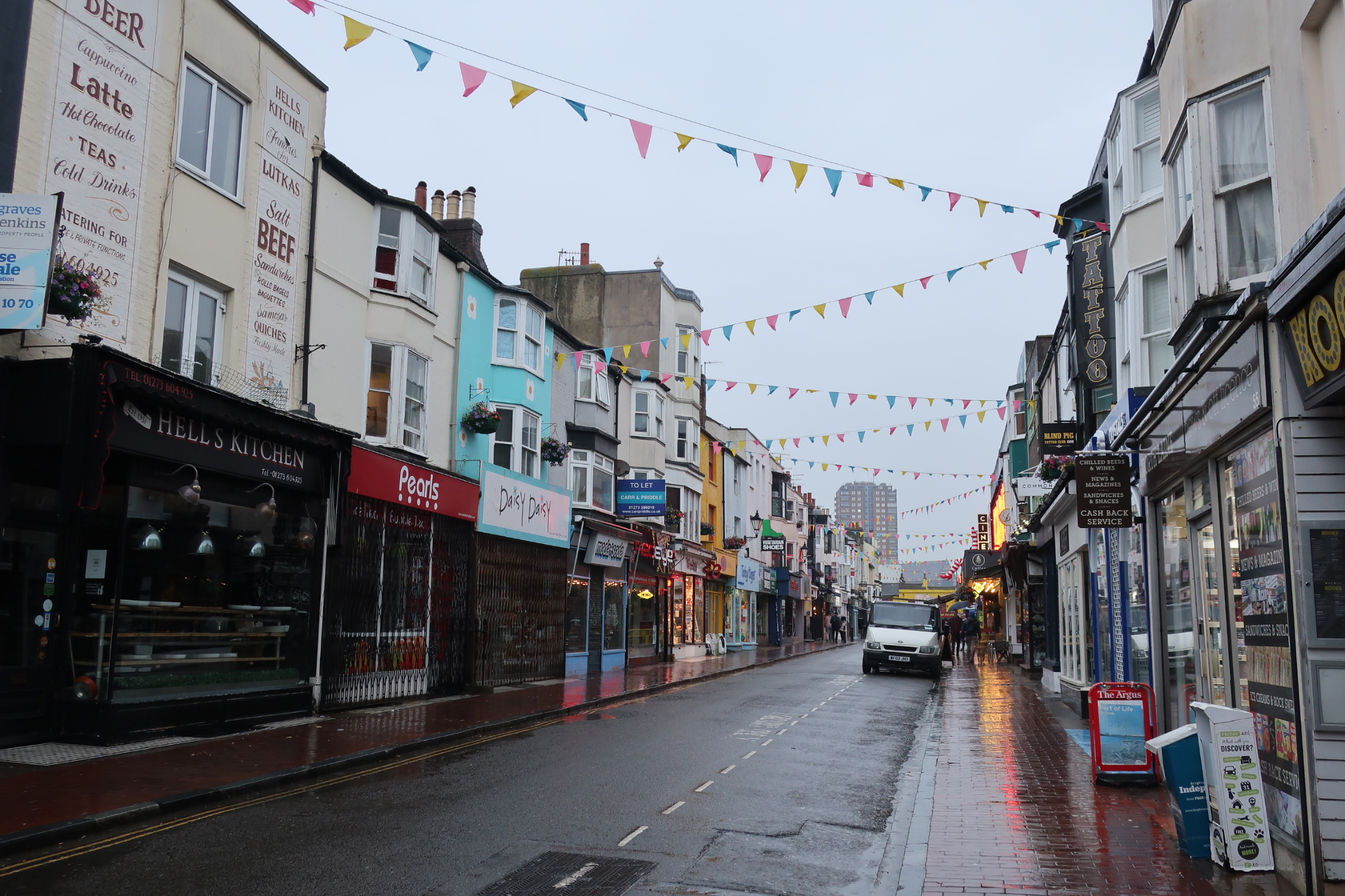 Wir fallen irgendwie auf in unseren leuchten Regenjacken. Aber wir machen’s wie die Engländer, lassen uns nicht beirren und schlendern durch Brighton. Ein nettes Städtchen. Viele kleine Läden. Manche Gassen bunt, andere Häuserfronten wieder traditionell und weiß.