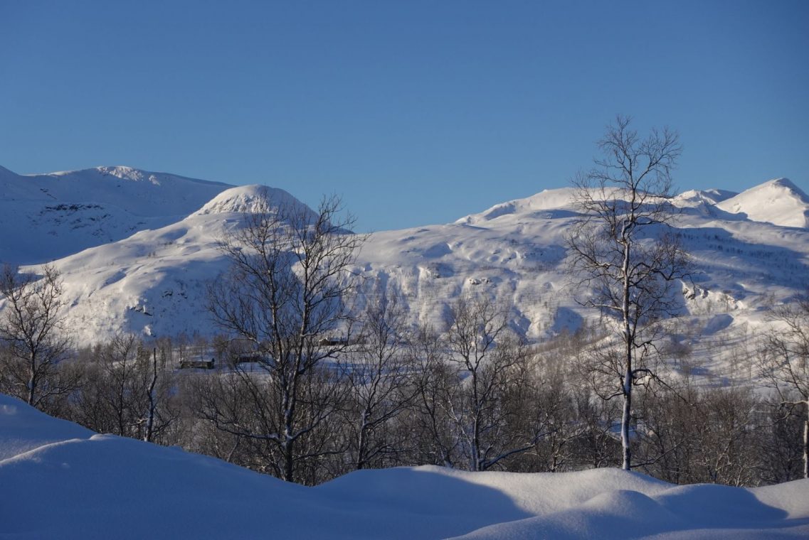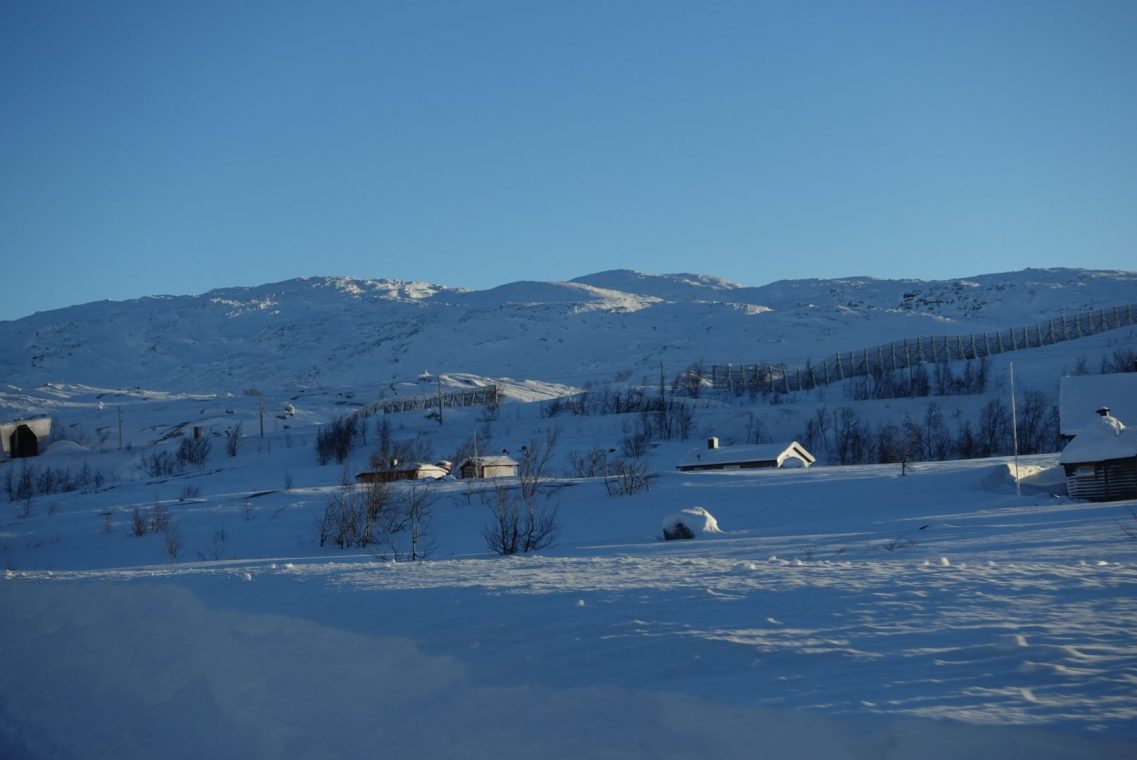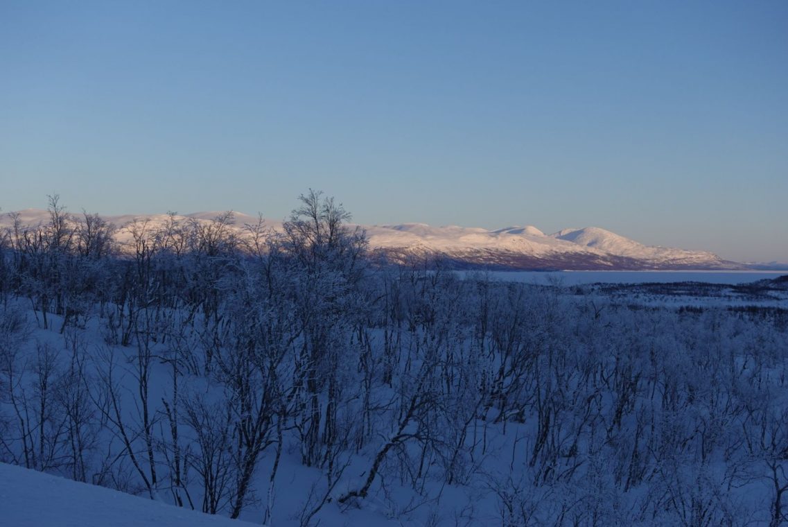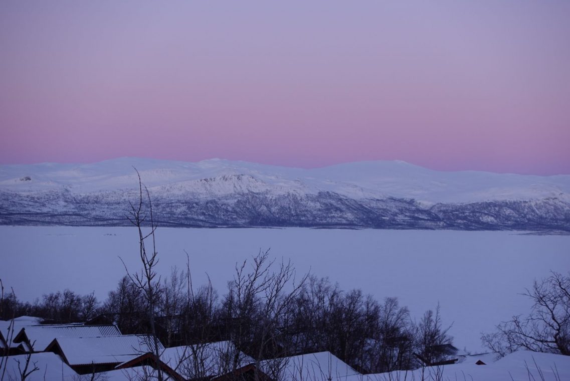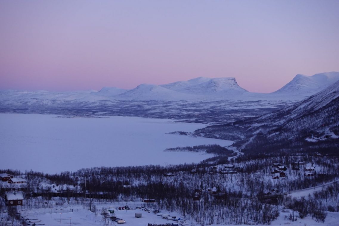 Kurz vor Abisko erreichen wir unser heutiges Ziel. Ein Hotel mitten an der hiesigen Skipiste. Leicht oben am Berg gelegen, hat man von hier einen wunderbaren Ausblick über den nahegelegenen (natürlich zugefrorenen) See und die umliegenden Berge. Wir kommen pünktlich zum Sonnenuntergang an. Der Himmel hinter den Bergen ist rosarot.