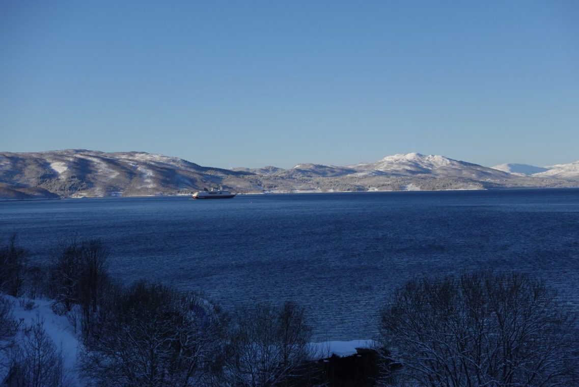 Immer wieder rieselt der feine pulvrige Schnee von den Bäumen. In Finnsnes sehen wir noch von weitem die Hurtigrute, die gegen 11 Uhr in Hafen einläuft.
