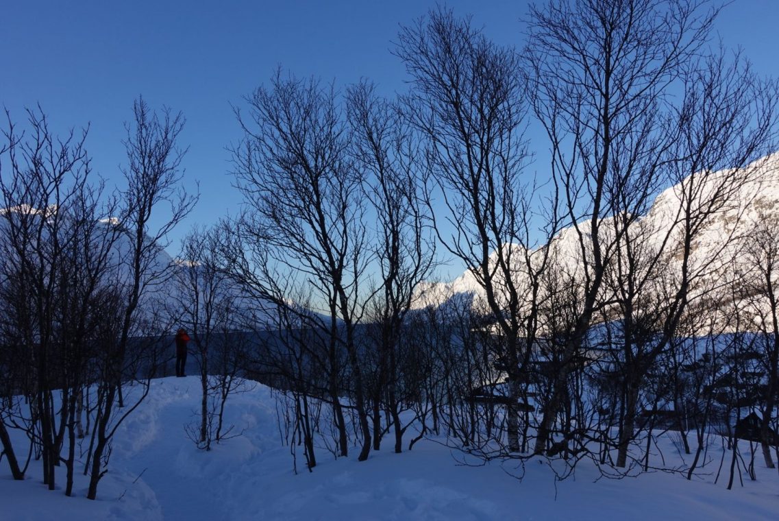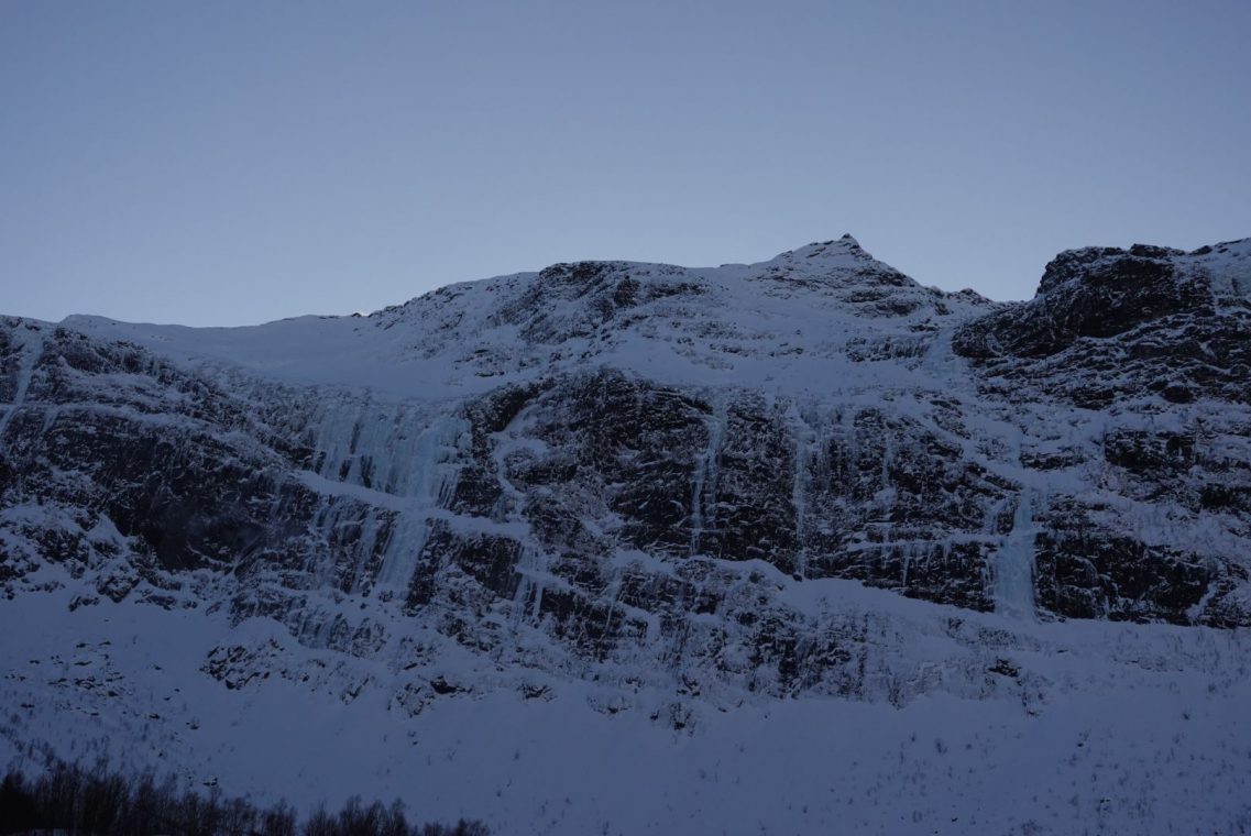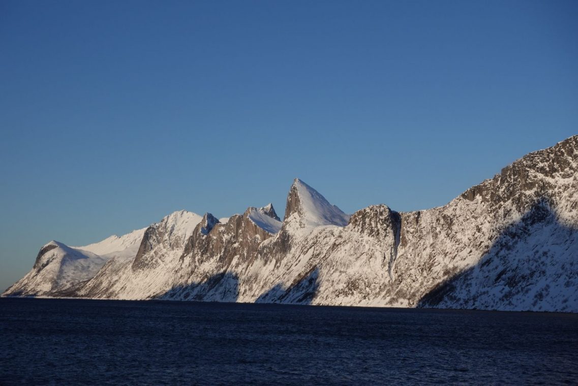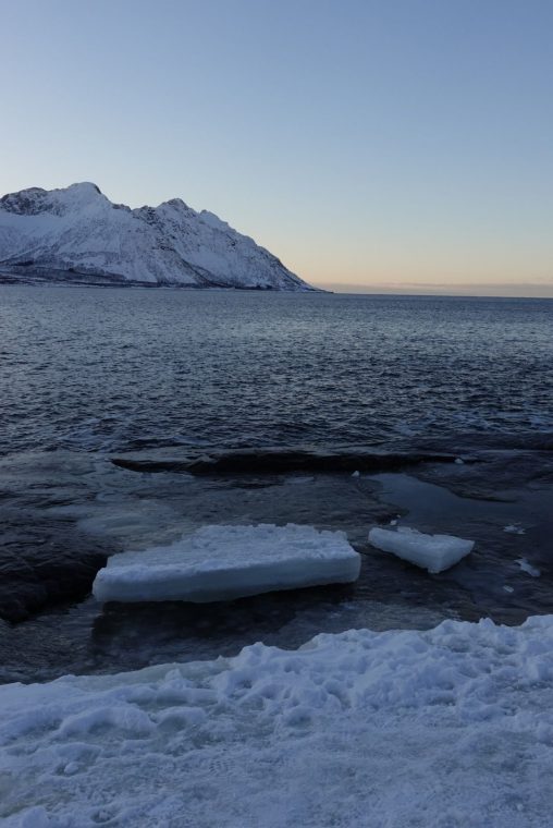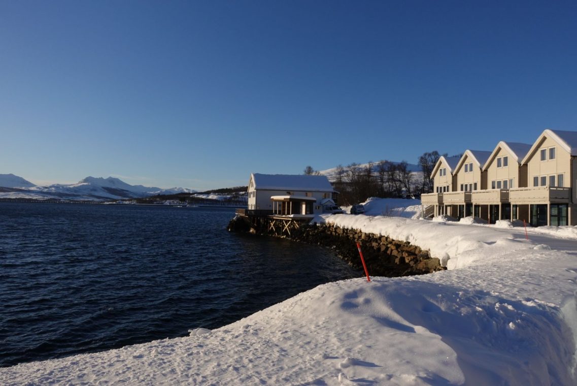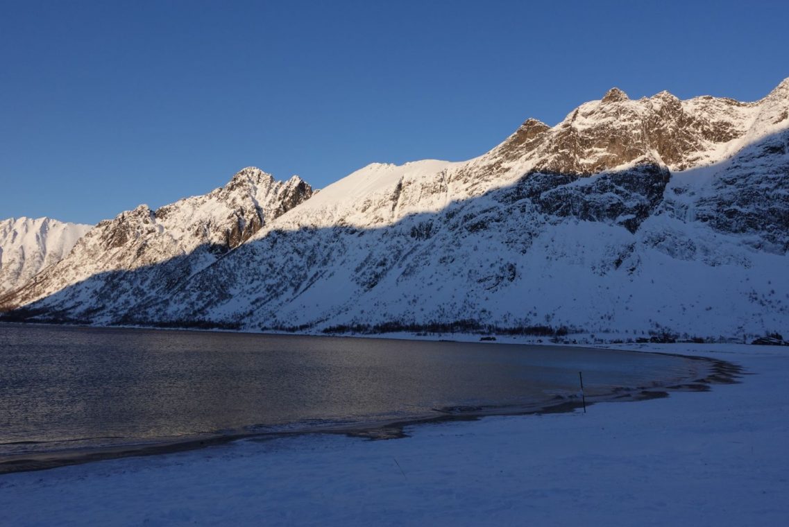 Wir übernachten im Nordwesten in Hamn. Die Anlage liegt schön am Meer, relativ im Dunkeln. Wunderbare Bilder mit schneebedeckten Felsen im Vordergrund.