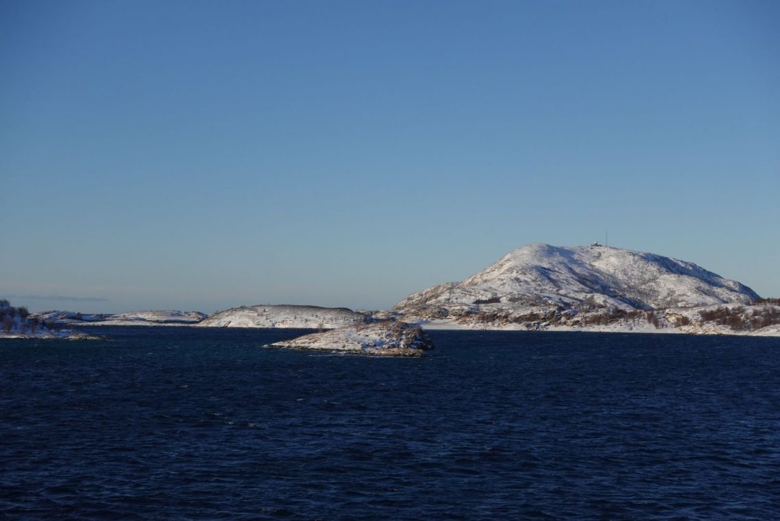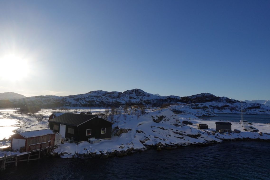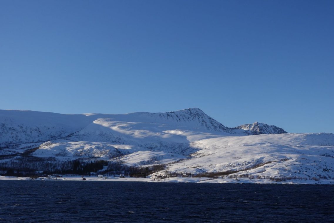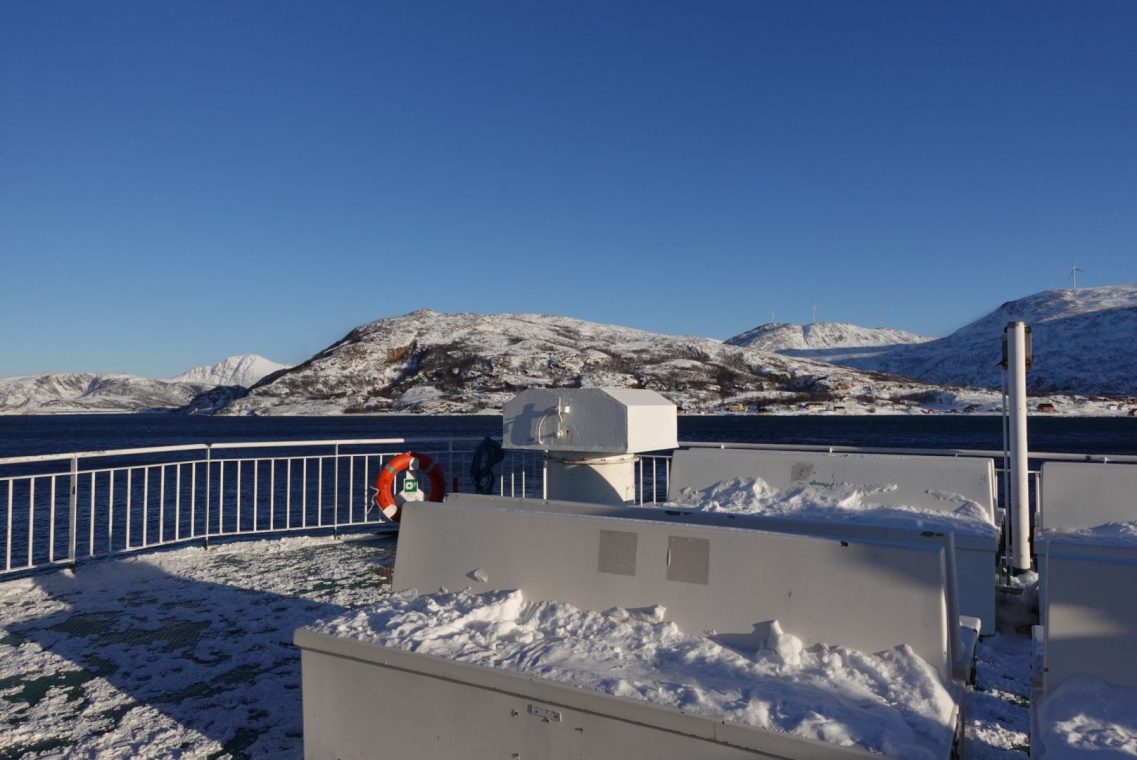 Bei starkem Wind fahren wir in Richtung Senja. Auf dem Weg zum Fähranleger stoppen wir das ein oder andere Mal, um den entgegen kommenden Schneepflug vorbei zu lassen. Es ist eng auf den Straßen und nicht jeder kennt die Ausmaße seines (Miet)Auto. Dazu kommen starke Schneeverwehungen auf den Straßen, der Räumdienst kommt kaum hinterher. Da stellt sich die Frage, ob Allrad oder Spikes die bessere Ausstattung sind. Wir kommen jedenfalls gut durch und stehen eine Stunde vor Abfahrt am Fähranleger in der Warteschlange.
