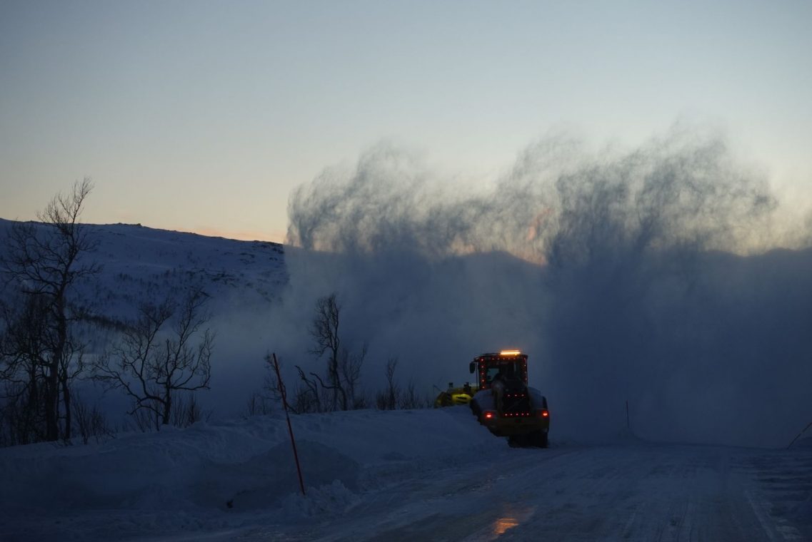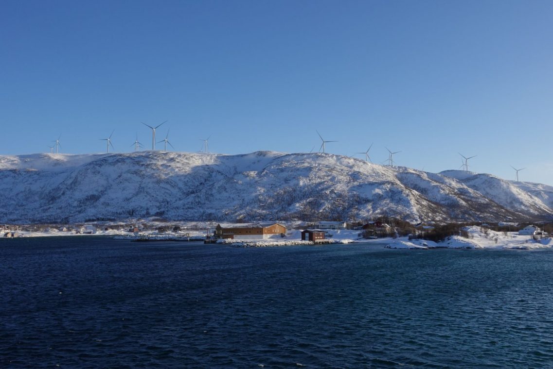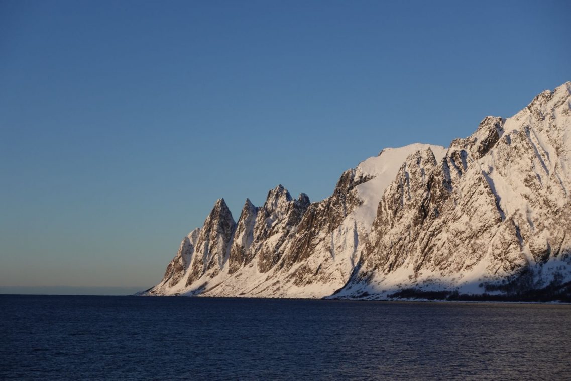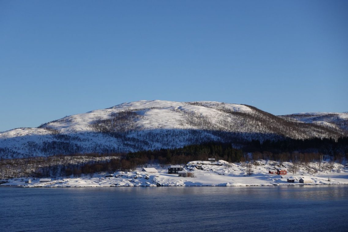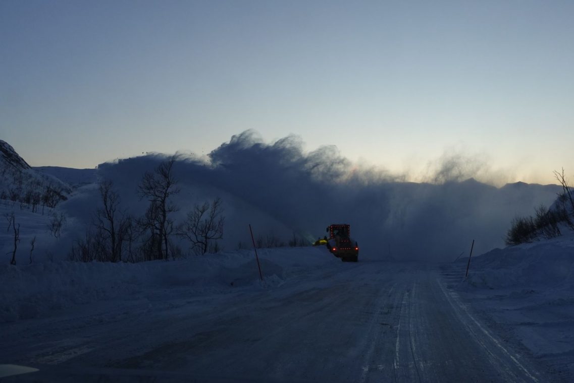 Bei starkem Wind fahren wir in Richtung Senja. Auf dem Weg zum Fähranleger stoppen wir das ein oder andere Mal, um den entgegen kommenden Schneepflug vorbei zu lassen. Es ist eng auf den Straßen und nicht jeder kennt die Ausmaße seines (Miet)Auto. Dazu kommen starke Schneeverwehungen auf den Straßen, der Räumdienst kommt kaum hinterher. Da stellt sich die Frage, ob Allrad oder Spikes die bessere Ausstattung sind. Wir kommen jedenfalls gut durch und stehen eine Stunde vor Abfahrt am Fähranleger in der Warteschlange.