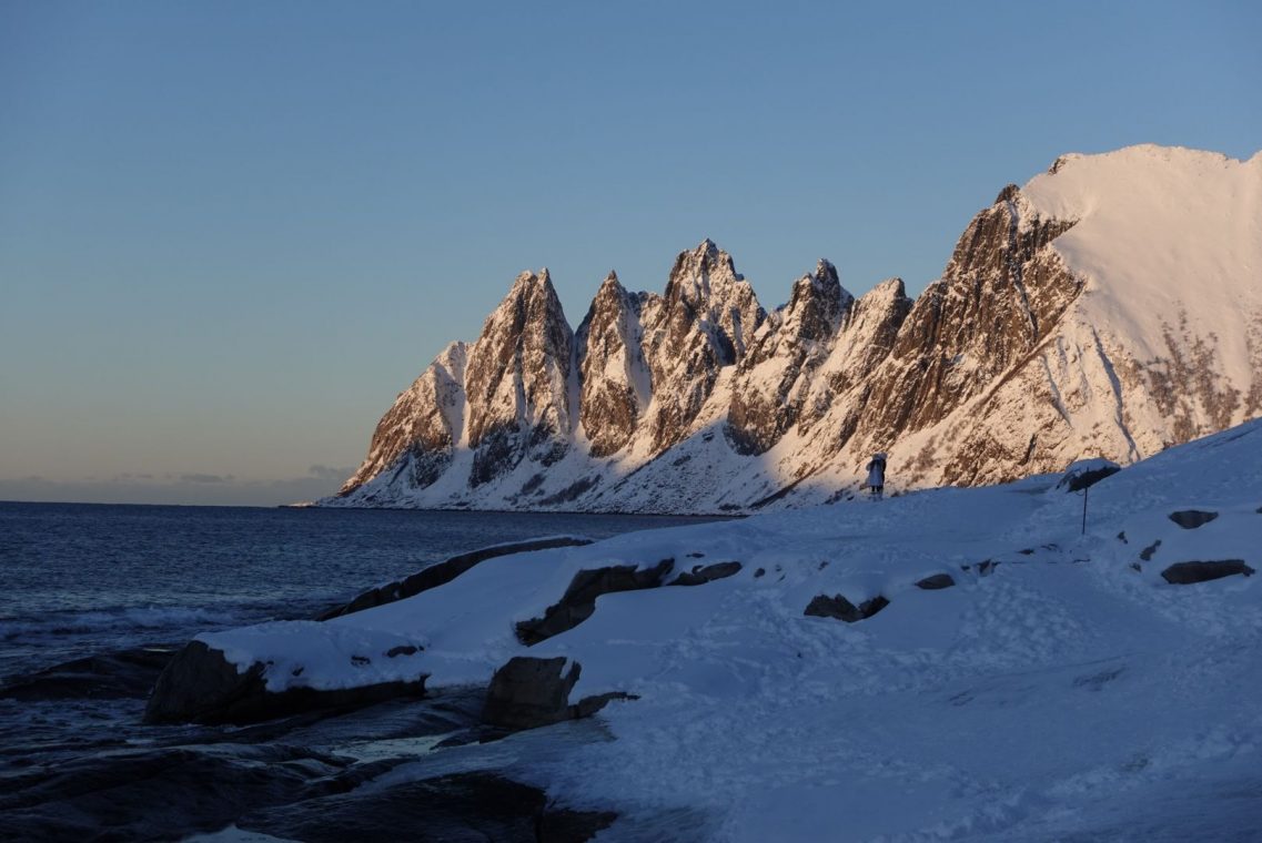 Auf Senja folgen wir dem “Touristvegen” (der Straße 862) weiter in Richtung Westen. Immer wieder gibt es schöne Aussichtspunkte. Am Tungeneset sind die Felsen rot gefärbt im Sonnenuntergang. Ein beliebtes Fotomotiv, was schon am Gerangel um die wenigen Parkplätze sichtbar wird.