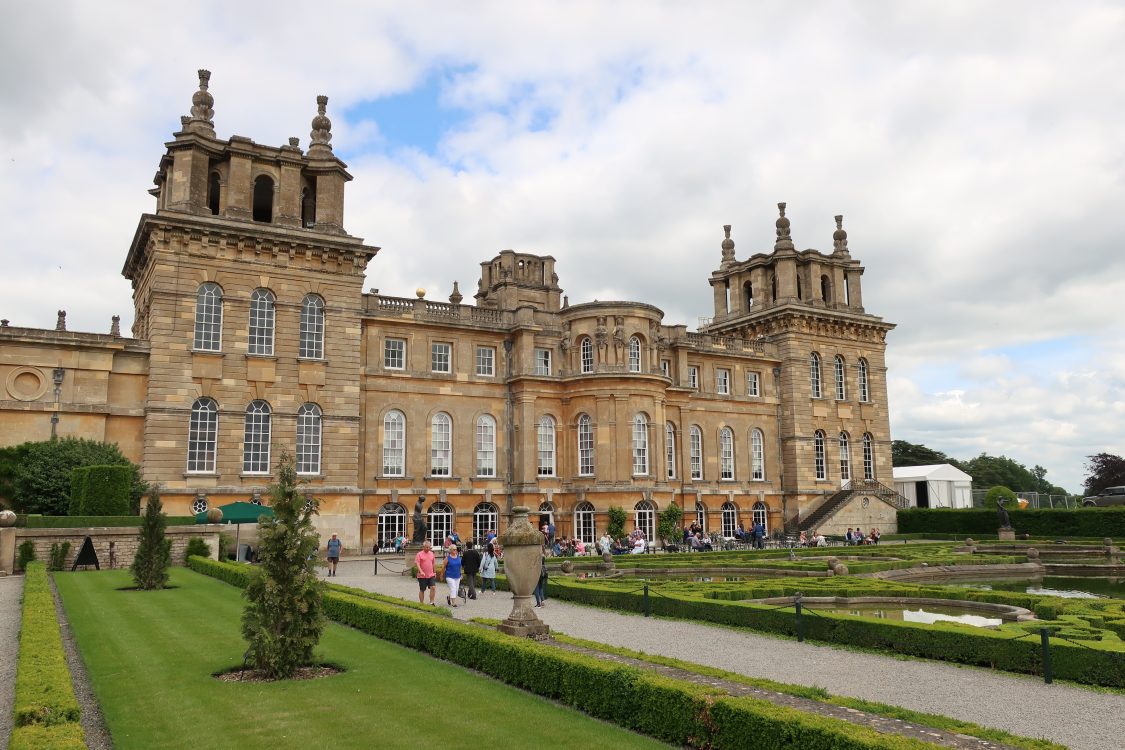 Nachmittags fahren wir zum Blenheim Palace. Durch ein Tor fahren wir über eine große Auffahrt zum Parkplatz. Über breite Alleen kommt man zum Schloss und den Gärten. Die Sonne scheint, also schauen wir uns erst die Außenanlagen an. Hinter dem Schloss zuerst die Wasserterrassen. Von Gras und Buchsbäumchen eingewachsene Brunnen und Wasserspiele. Alles symmetrisch. Die Gärtner sind gerade dabei, die Buchshecken zu schneiden. Schlaue Idee: sie haben Schnüre gespannt, um überall gleich hoch zu sein.