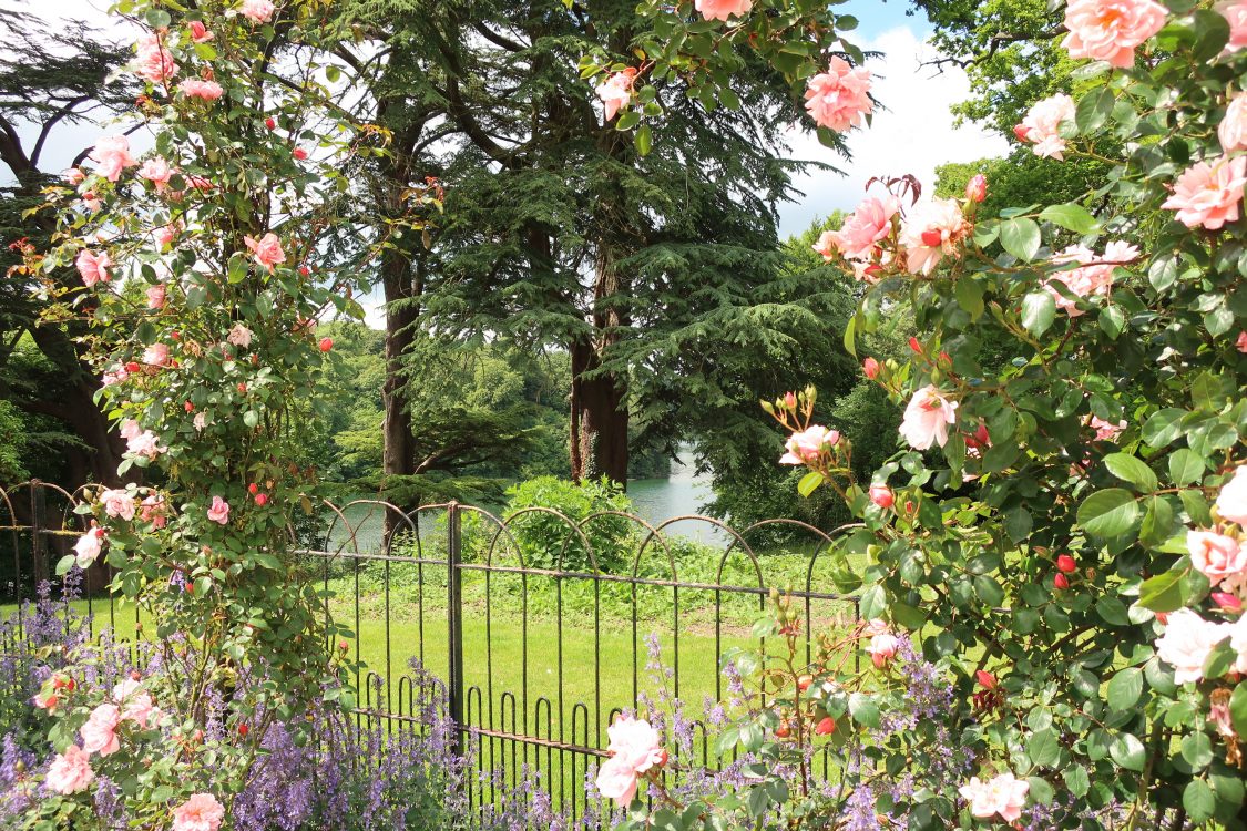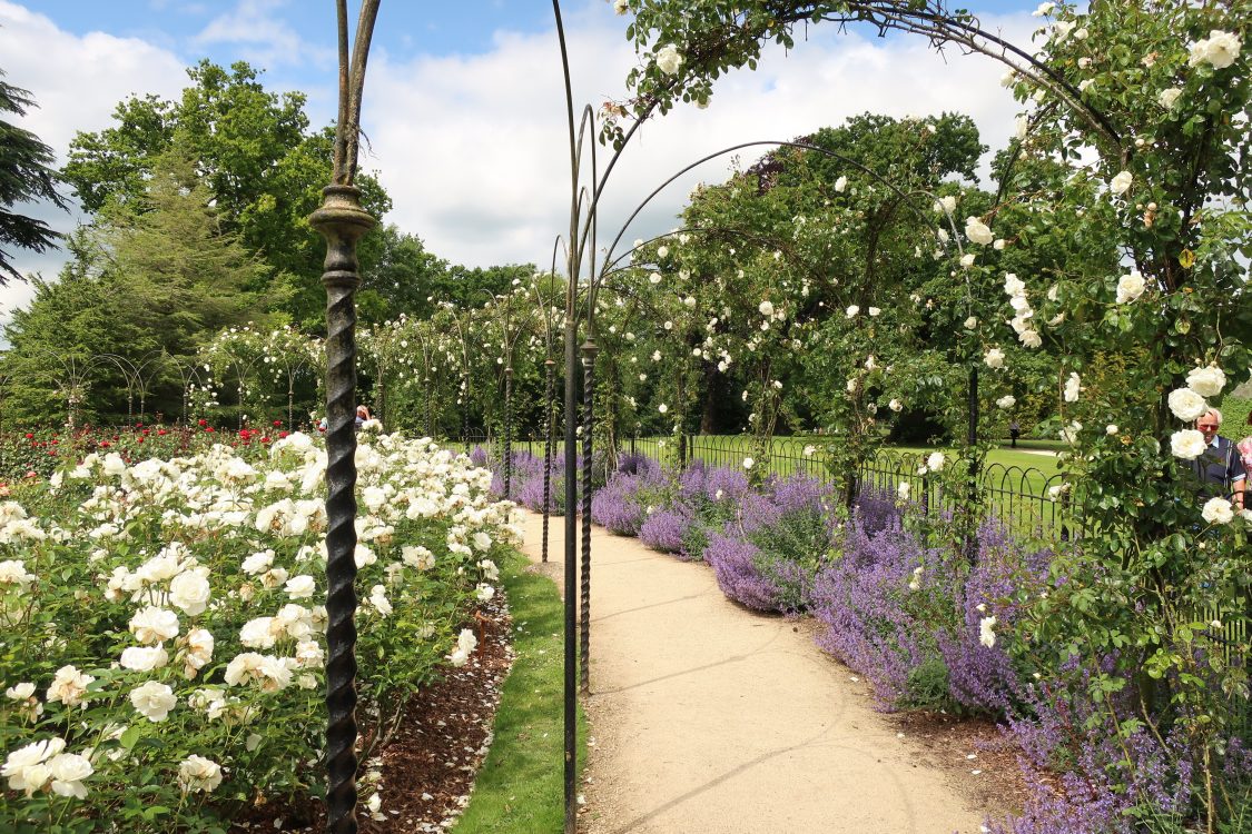 Weiter unten ein großer See. Etwas oberhalb ein Weg durch den weitläufigen Park. Auch hier entdecken wir einen kreisrund angelegten Rosengarten. Wunderschön leuchtende und duftende Rosen.
