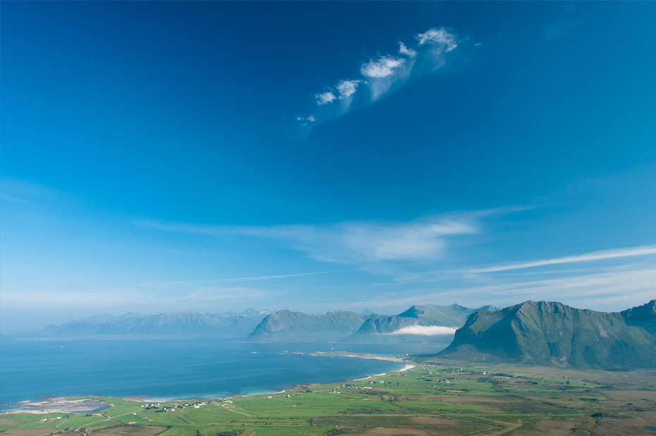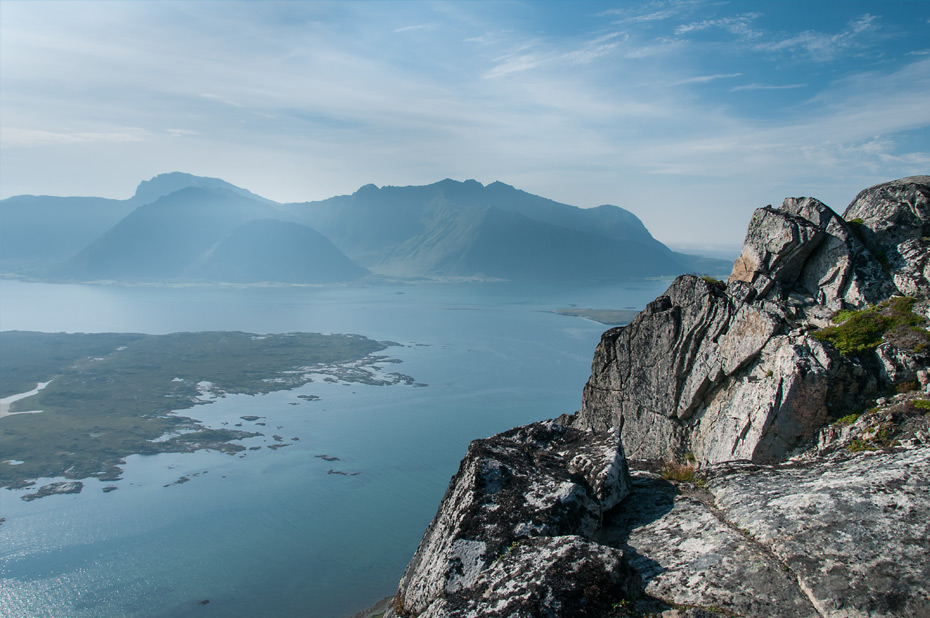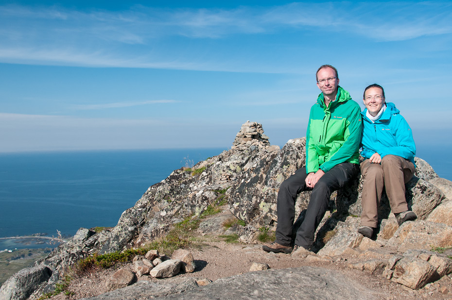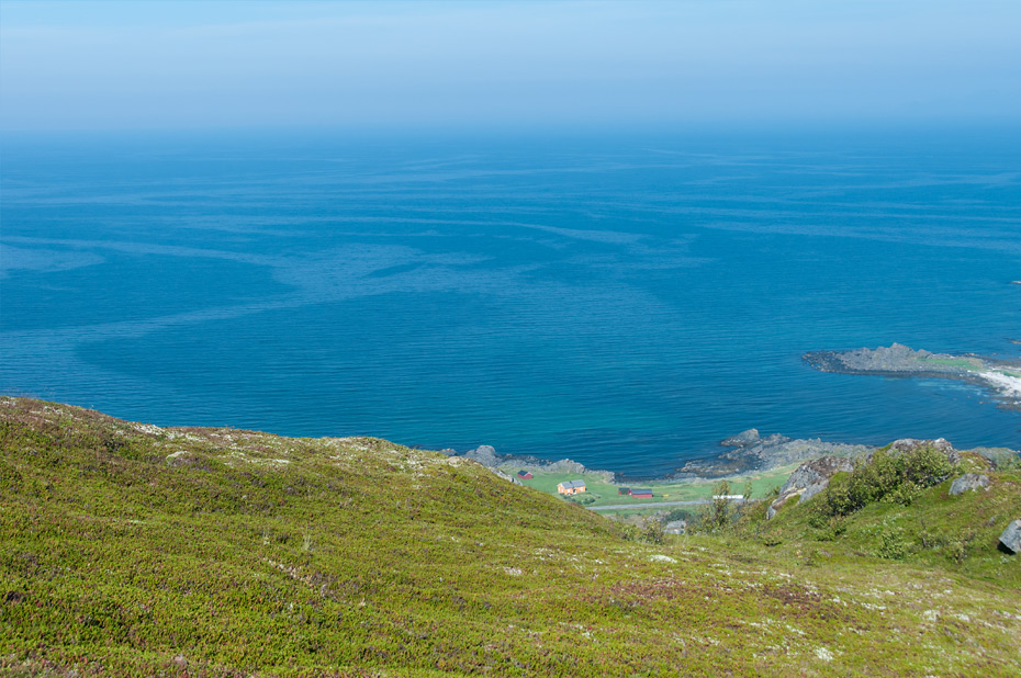 Der Einstieg liegt direkt neben dem Golfplatz, an dem wir gestern vorbei gekommen sind. Der Weg ist gut ausgetreten und man kann ihn nicht übersehen. Über den Bergrücken geht es stets bergauf, mal flacher, dann wieder steiler. Unterwegs gibt es bereits immer wieder schöne Ausblicke auf die nördliche Küste der Insel Gimsøy.