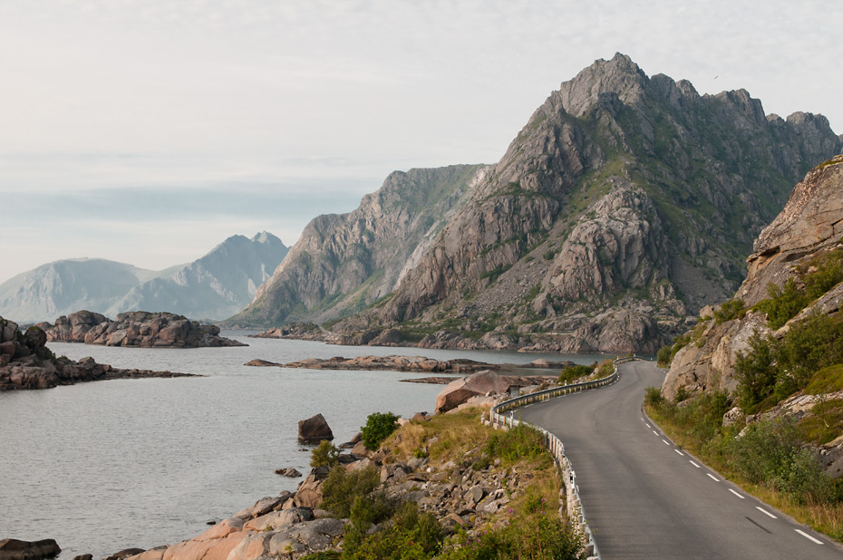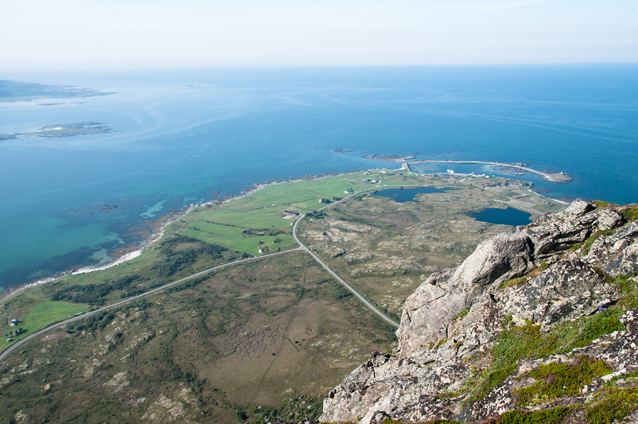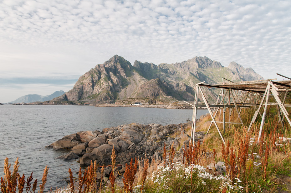 Auf der Insel Gimsøy gibt es direkt an der Küste einen einzelnen, allein stehenden Berg – den Hoven.
