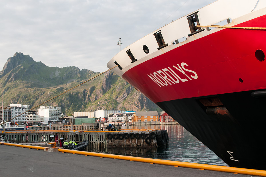 Abends nochmal ein kurzer Abstecher nach Svolvaer – heute liegt die Nordlys Hurtigrute am Ufer.