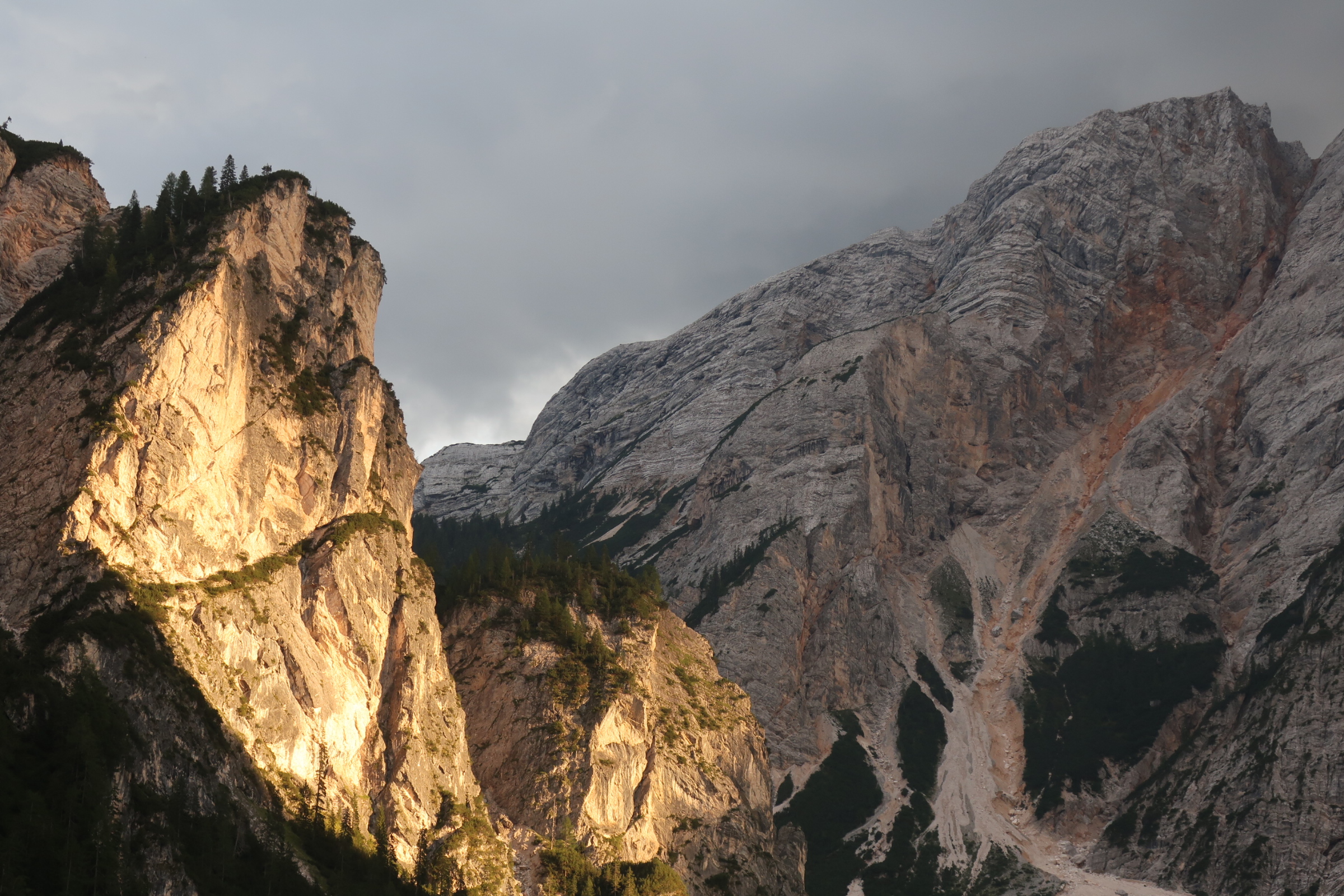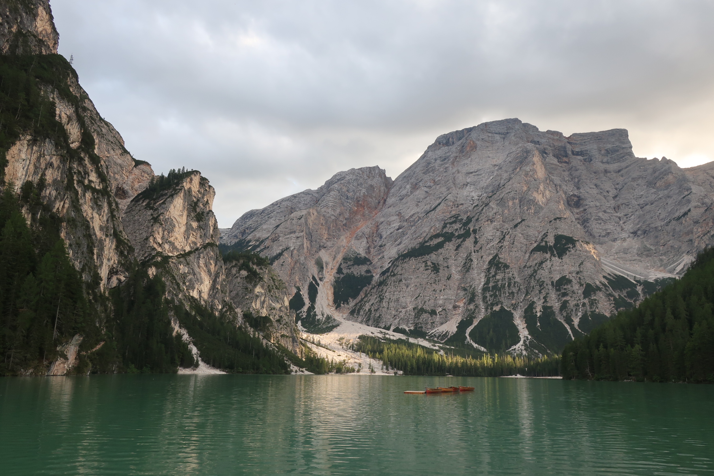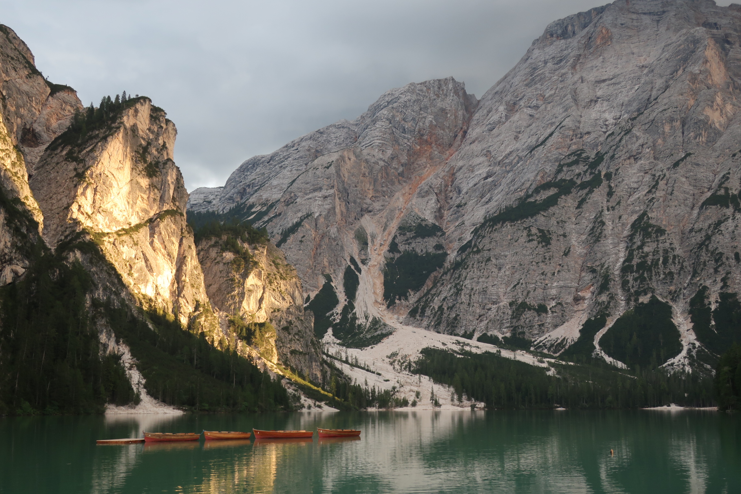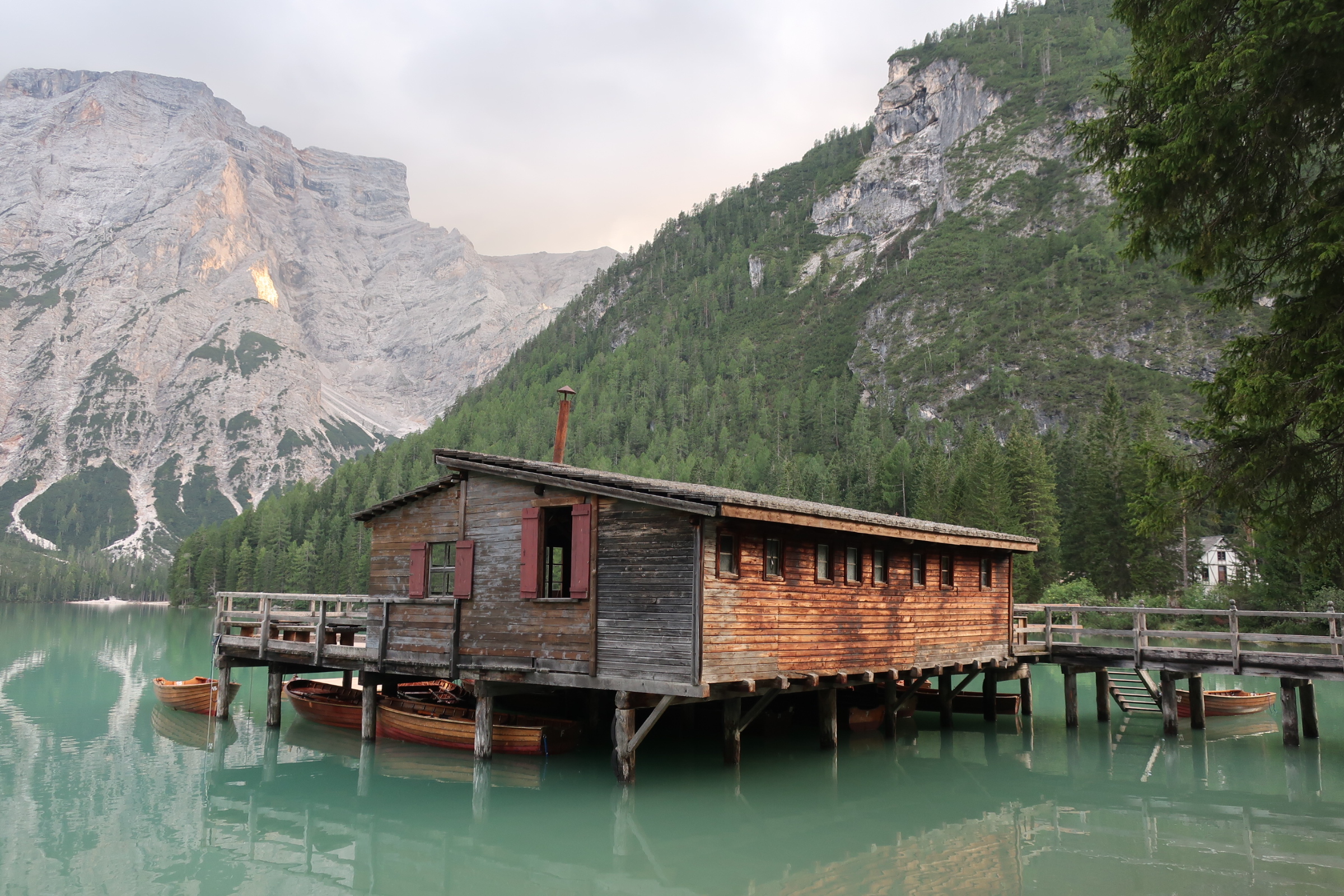 Nach einem ruhigen Tag haben wir gestern abend noch einen Ausflug zum Pragser Wildsee gemacht. Der See liegt schön umgeben von mächtigen Felsen am Talende. Das kleine Bootshaus im Vordergrund, der türkis schimmernde See, die von der Sonne angestrahlten Berge – wohl eine der meist fotografierten Szenen hier.