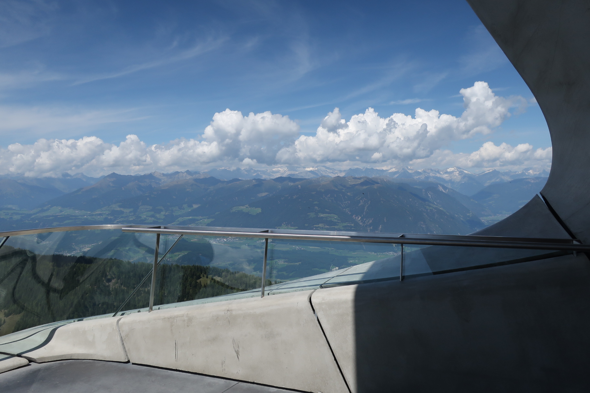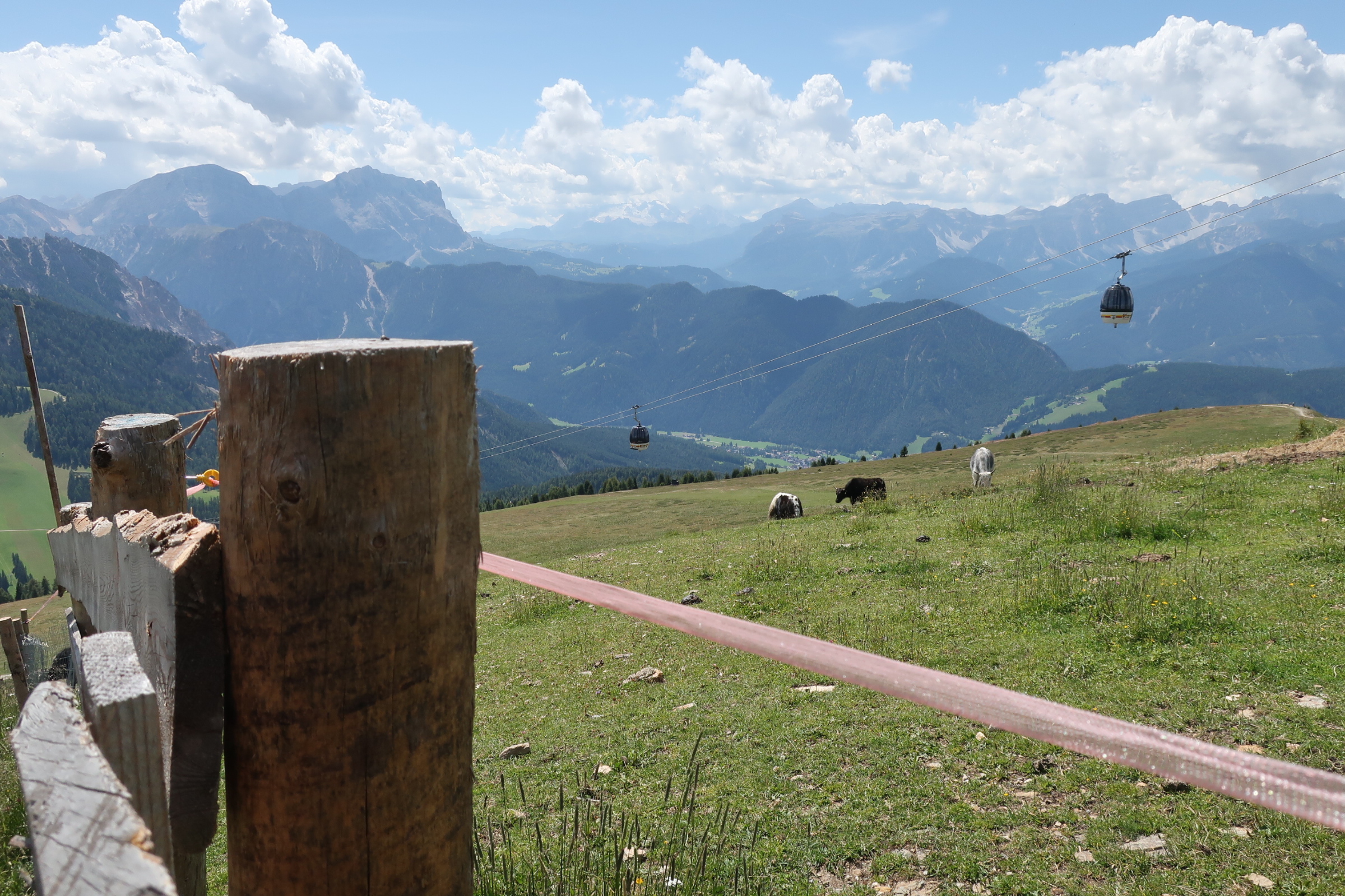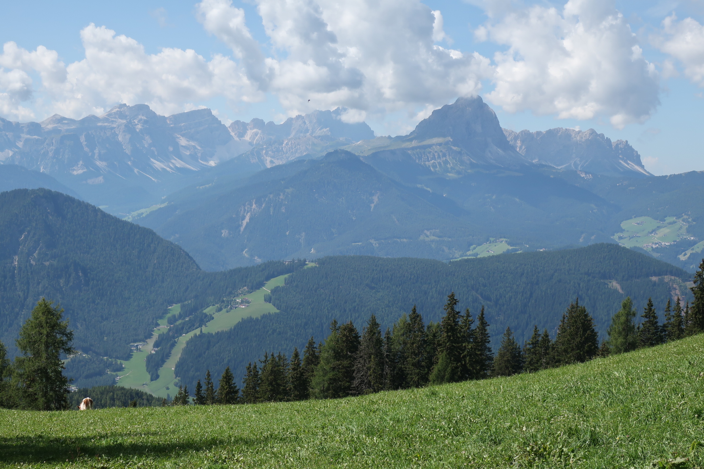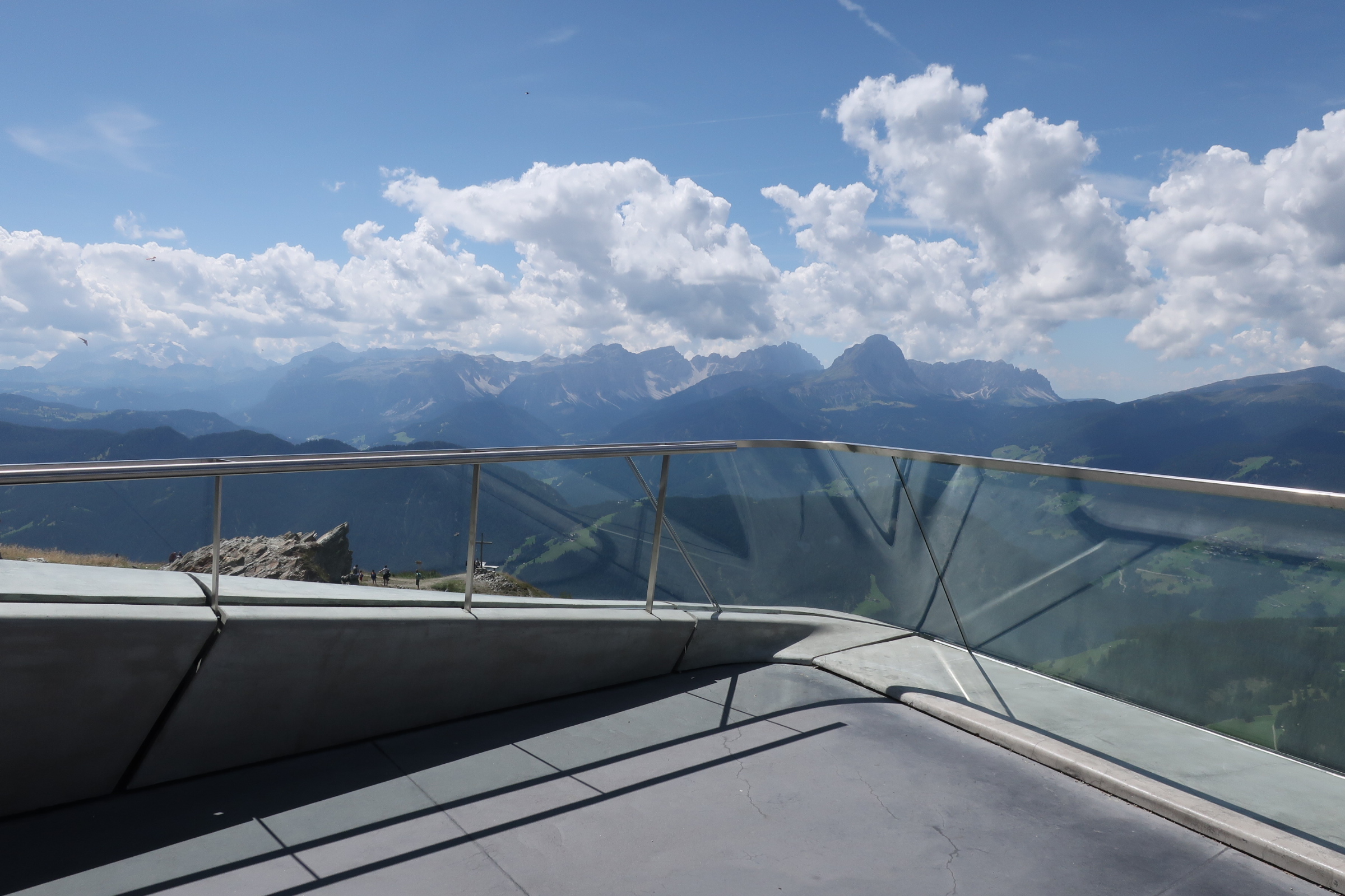 Die Ausblicke vom Kronplatz sind beeindruckend. Ringsherum Bergpanorama vom feinsten. Ein Gipfel reiht sich an den anderen. Fast schon kitschig bekront von weißen Wolken.