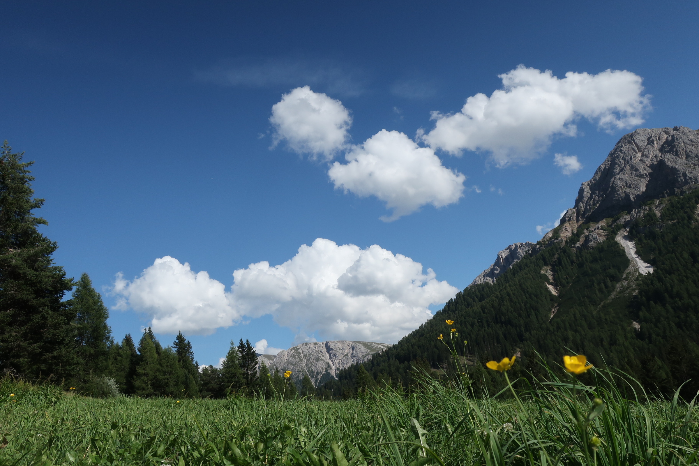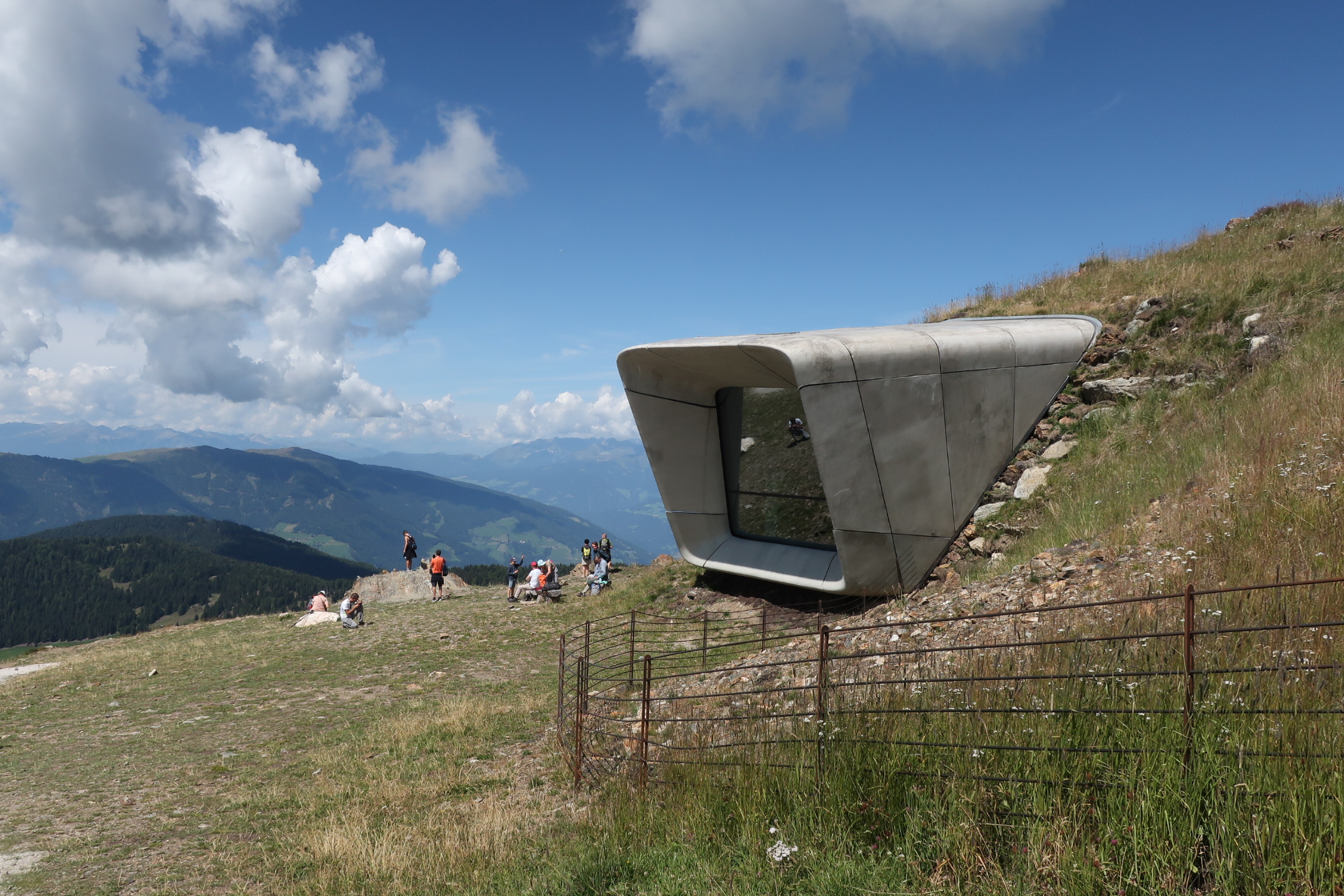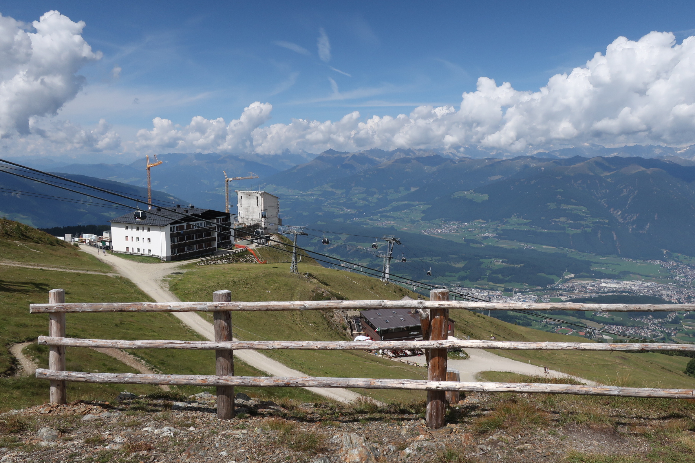 Wir fahren den Furkelpass hoch. Auffallend war die hohe dichte an E-Mountainbikes, mit denen es die ambitionierten Sportler selbst manchen Autofahrern schwer machten, sie auf der steilen Passstraße zu überholen. Von der Furkelpass Höhe aus laufen wir den Wanderweg 1 hinauf zum Kronplatz. Der Weg geht durch den Wald, später über eine Wiese hinauf zum Gipfel. Stellenweise etwas steilerer Anstiege. Aber gut machbar. In einer guten Stunde erreichen wir unser Ziel.