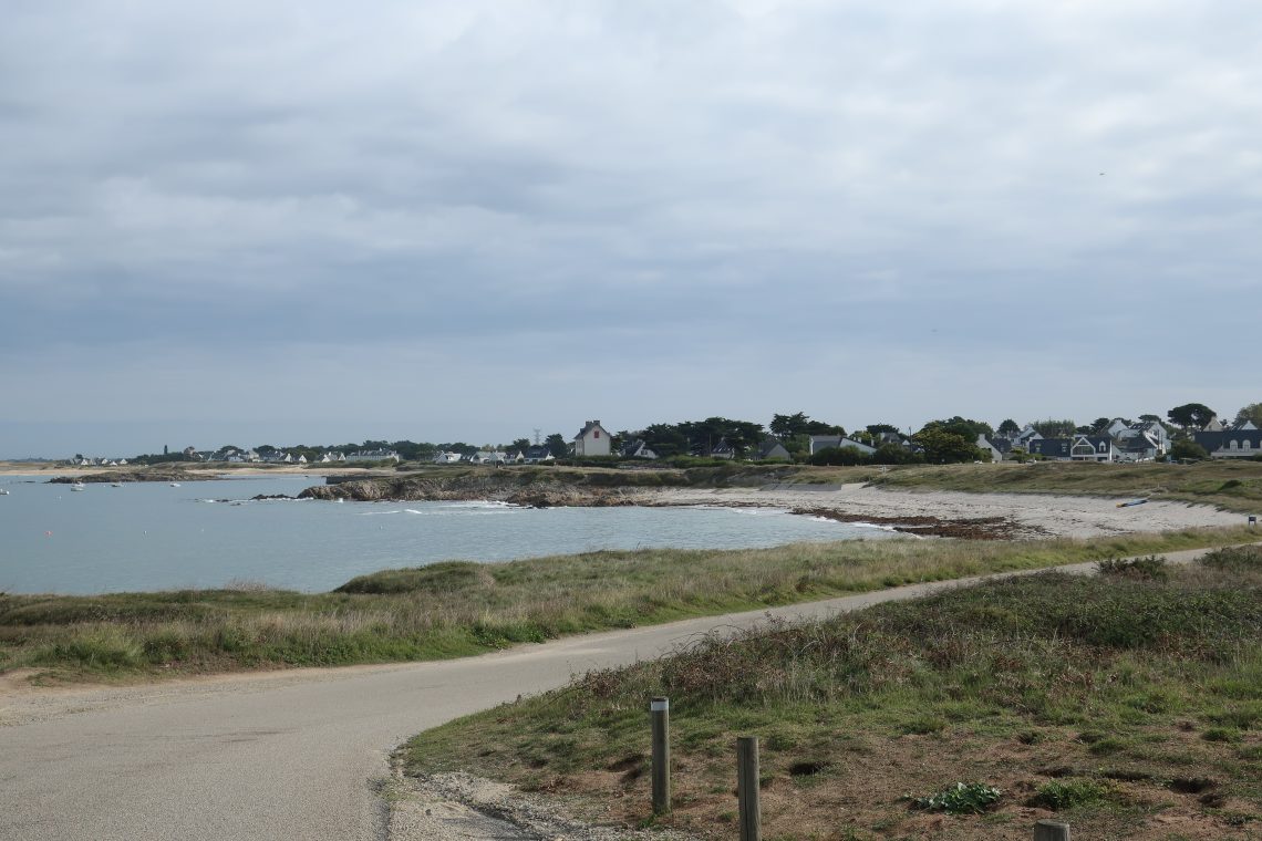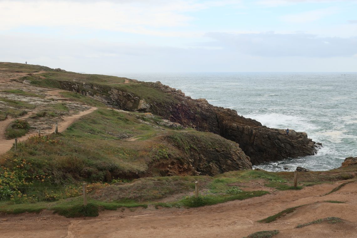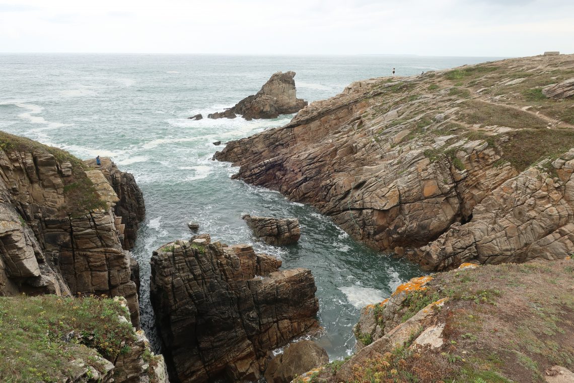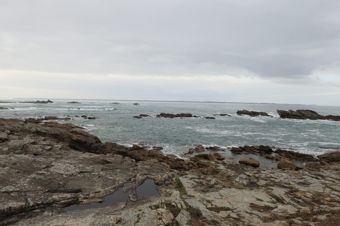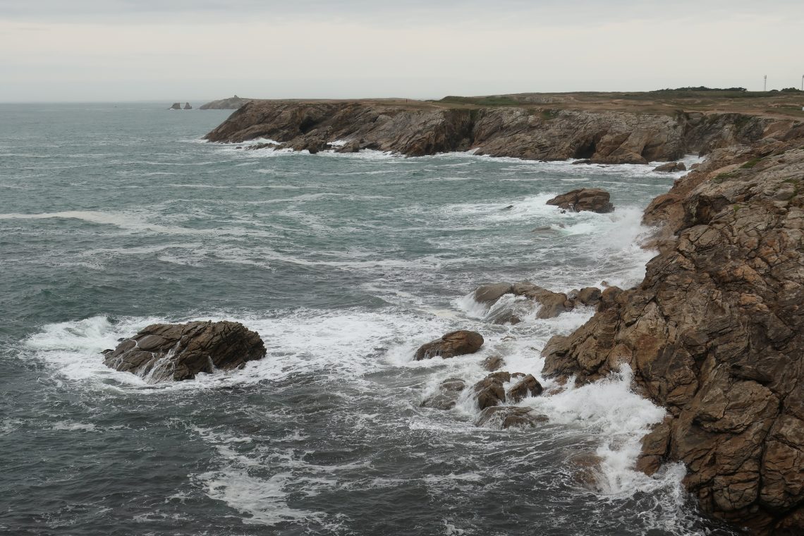 Die Côte Sauvage – die westliche Küste von der Quiberon Halbinsel – zeigt sich rau. Viel hohe Wellen, ein Tosen und Treiben. Noch ist der Himmel wolkenverhangen, die Stimmung passt zum Seegang. Immer wieder brechen Wellen an Felsen vor dem Ufer und versprühen eine weiße Gischt. Um die Halbinsel führt ein Fußweg (parallel zur Straße die wir fahren). Ein beliebter Weg bei Joggern und Spaziergängern gleichermaßen.