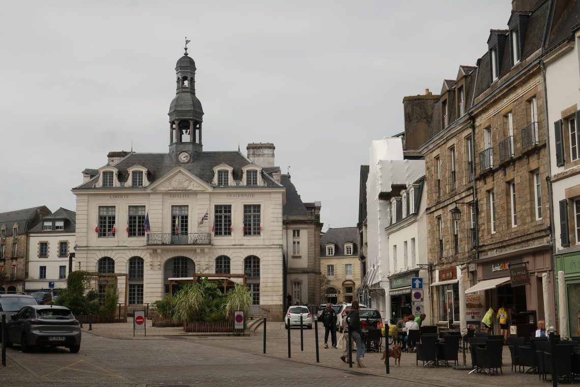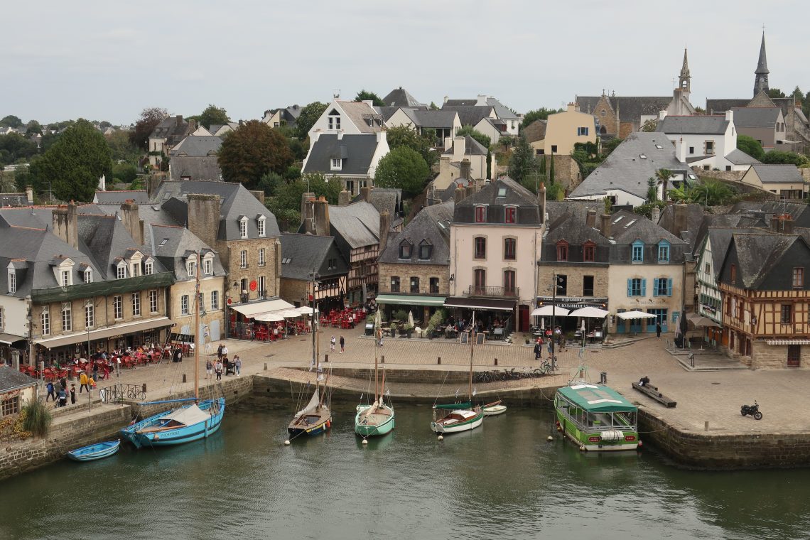 Der Ort Auray liegt schön am Fluss. Wir stoppen für einen kurzen Ausblick von oben auf den Hafen. Es ist Mittagszeit und die Restaurants sind gut besucht. Trotz leichtem Wind sitzen die meisten draußen und genießen die schöne Hafengegend.