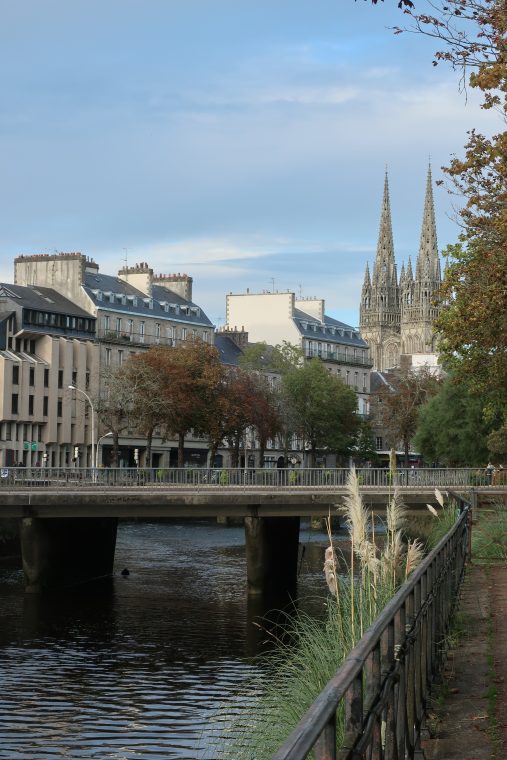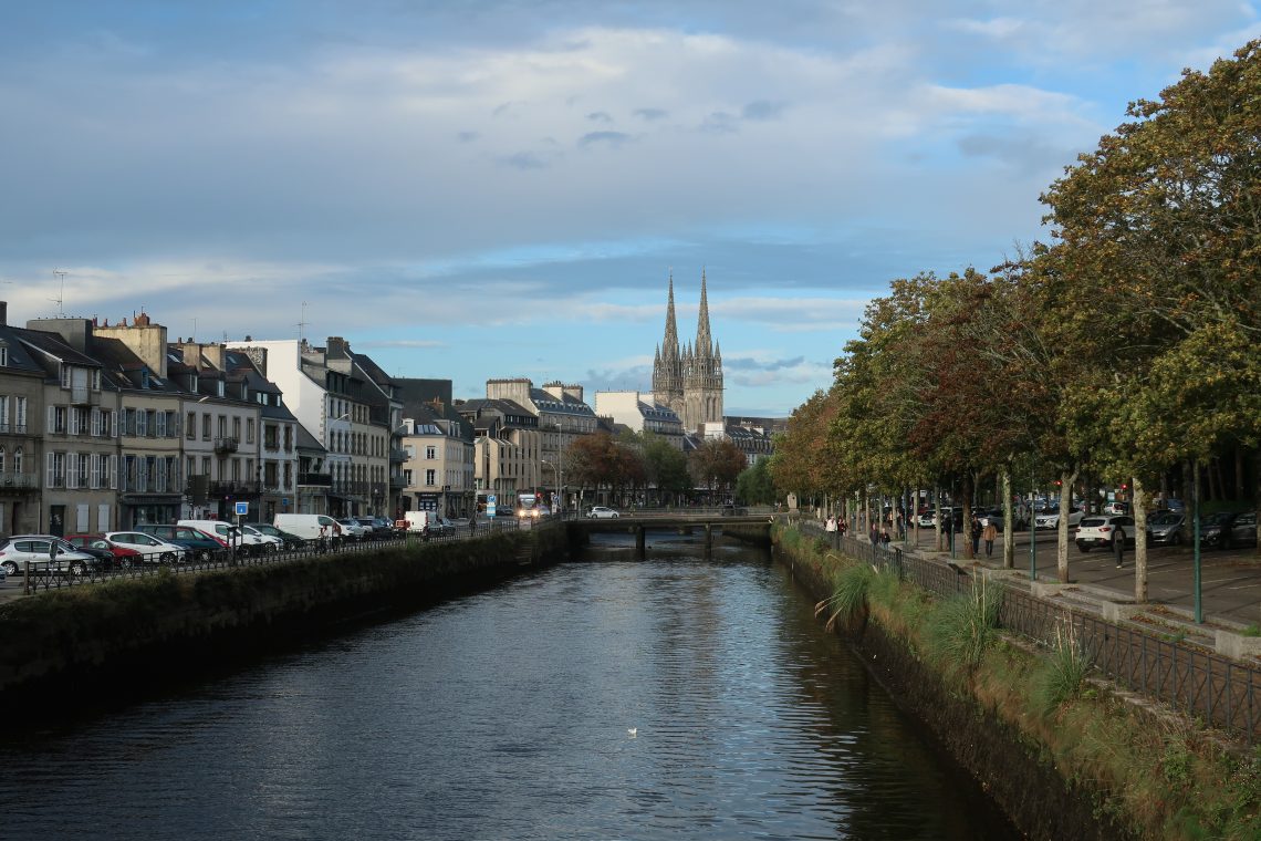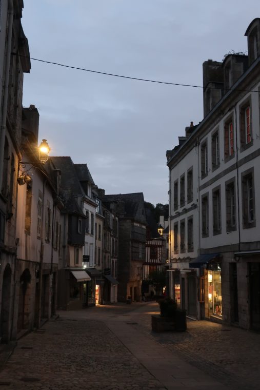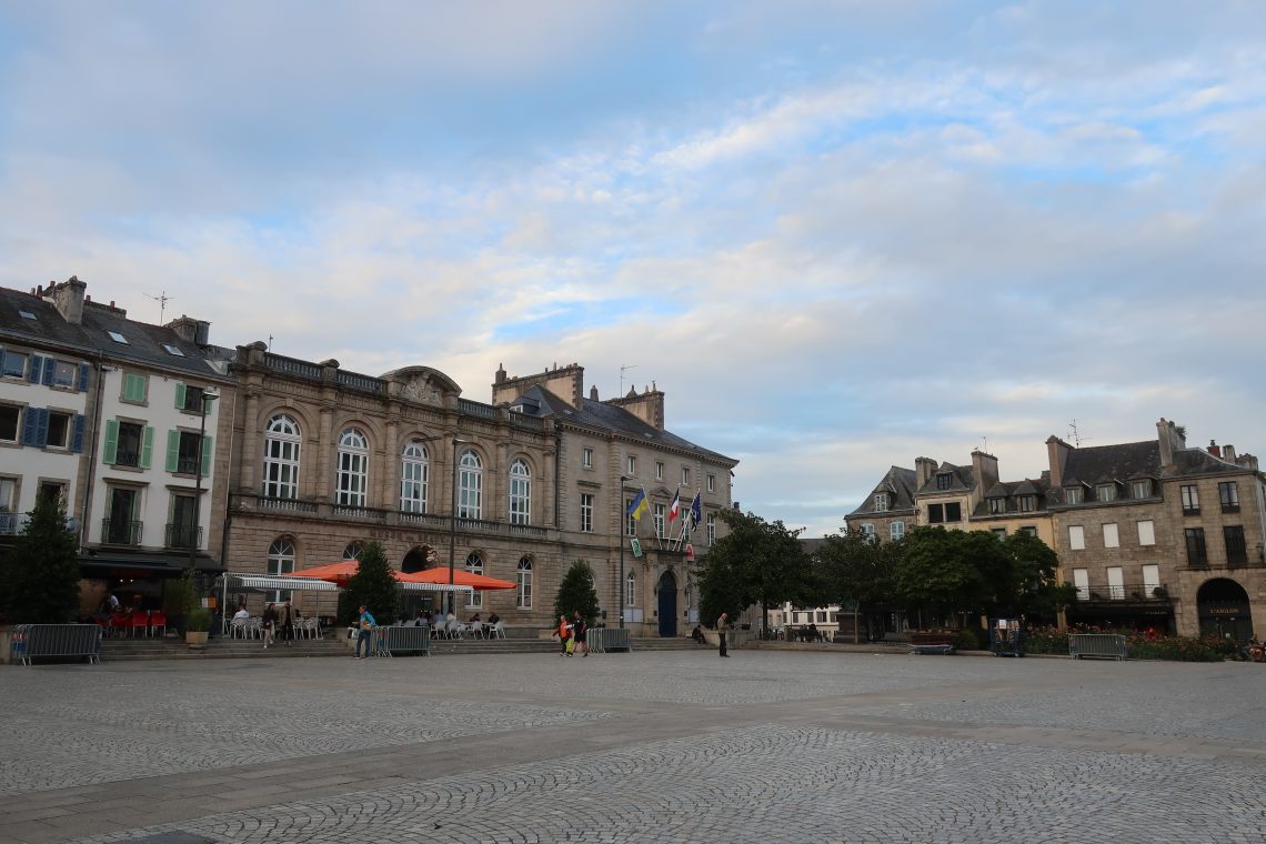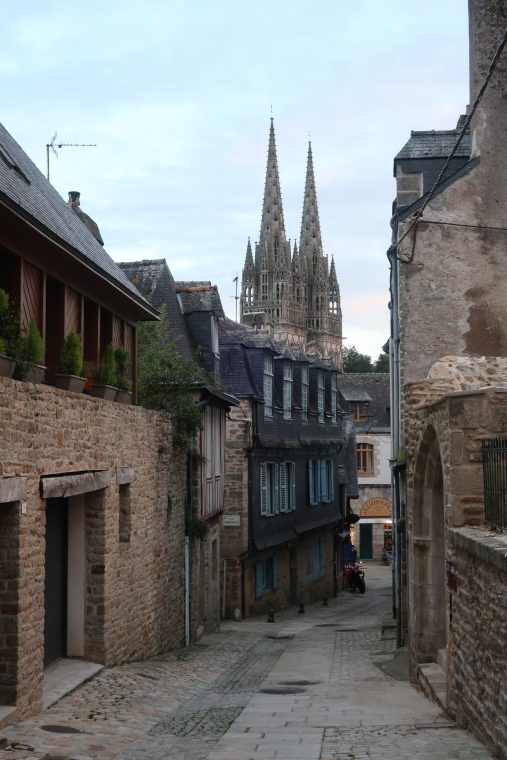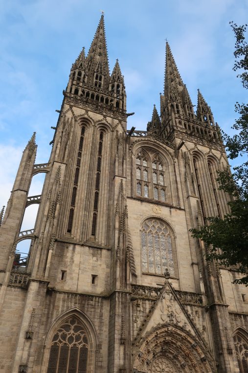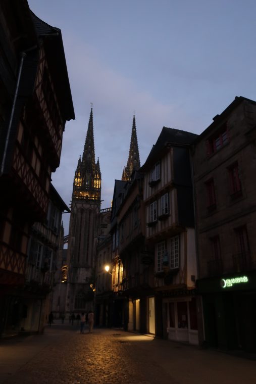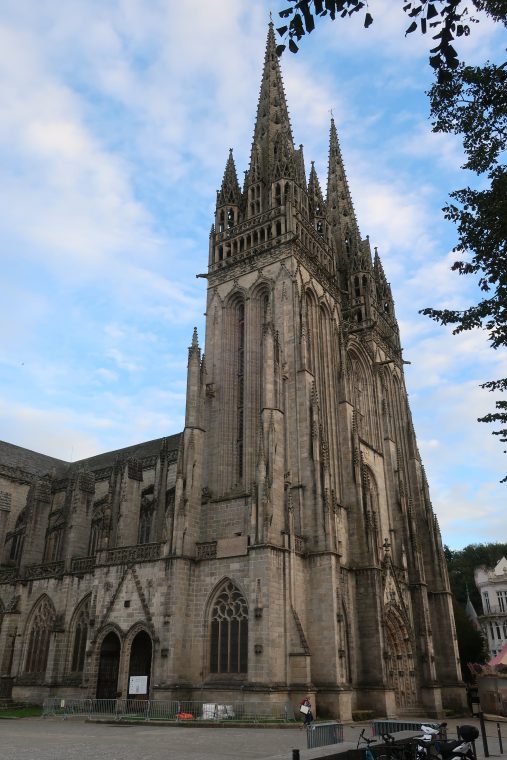 Abends sind wir in Quimper. Die Kathedrale beeindruckt mit ihrer Größe. Hier war früher einmal ein Bischofssitz. Es ist Messe als wir kommen, festlich mit Fahnen. Am Ende der Messe stellen sich Pfarrer – und ein Bischof – vor der Tür auf und verabschieden die Kirchgänger mit Handschlag. Zudem spielt ein Dudelsack auf. Die Glocken läuten. Die meisten Kirchenbesucher sind passend dem Anlass schick gekleidet.