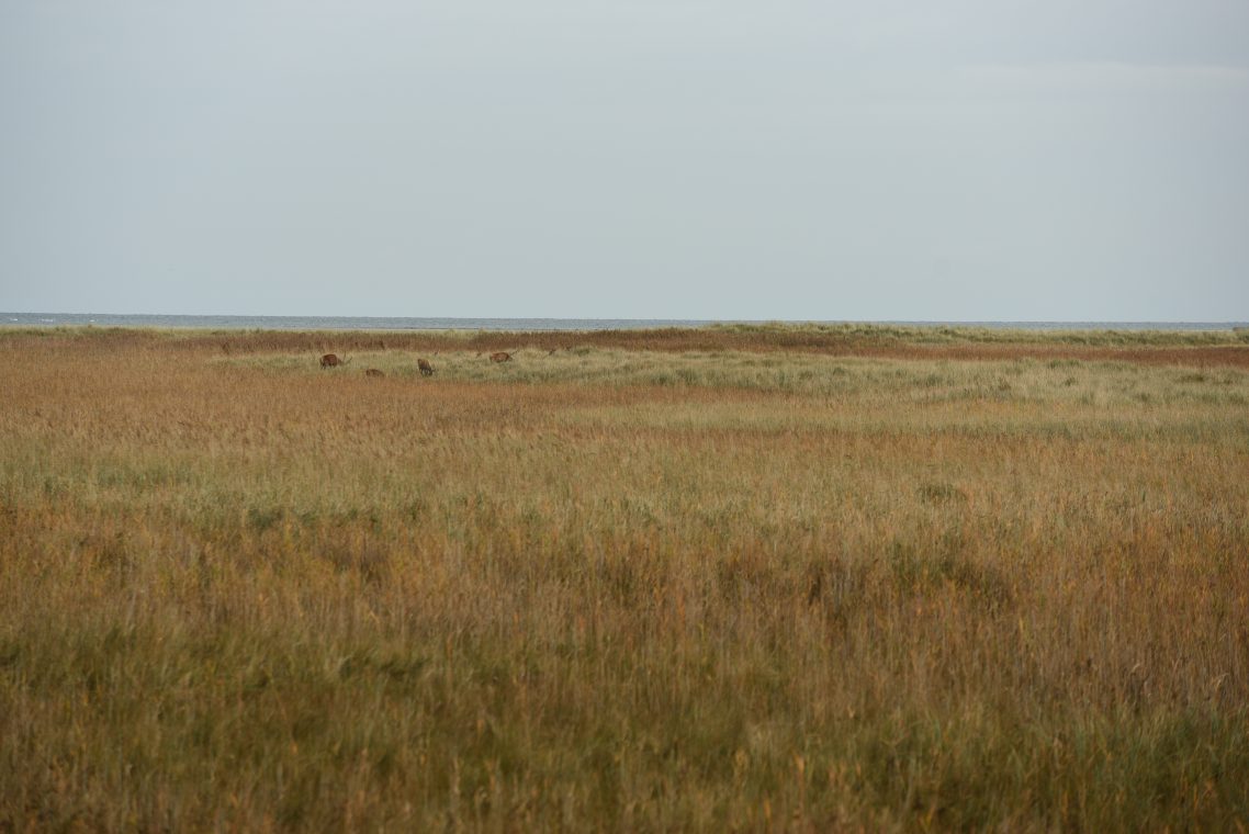 Nach einer knappen Stunde kommen wir über diverse Umwege und Fotostopps am Darßer Ort mit seinem Leuchtturm an. Das besteigen des Turms ersparen wir uns in Zeiten von Corona. Statt dessen biegen wir gleich auf einen Rundweg durch die nördliche Spitze des Nationalparks ab. Zum Teil auf Planken, zum Teil auf sandigen Wegen führt der Weg durch eine wunderschöne Landschaft mit viel Wasser, Schilf und knorrigen Bäumen. Kraniche sollen hier auf ihrem Weg Gen Süden Rast einlegen. Aber dieses Jahr waren die Winde wohl ungünstig für den Kranichzug in die Winterquartiere. Aber eine Herde Hirsche sehen wir in der Ferne grasen. Die Geweihe sehen durch das Fernglas schon sehr beeindruckend aus. Das letzte Stück des Rundweges laufen wir am Strand. Der Wind frischt auf und bläst die Wolken weg. Der fast einsame Strände von vorhin ist nun gut bevölkert. Kinder lassen Drachen steigen, vereinzelt suchen Menschen nach Bernstein im Kies und vermutlich alle genießen die Sonne.