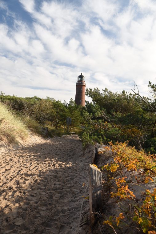 Wir radeln nun also mit unseren Leibrädern zum Darßer Ort. Es ist noch Recht früh am Morgen und so ist noch nicht viel los auf den Wegen durch den Darßer Urwald. Einen Urwald mag man an der Ostsee nicht direkt vermuten, jedoch wird der Wald schon seit Jahrzehnten sich selber überlassen. Es wird kein baum gefällt, kein totes Holz entfernt. Und so wirkt der Wald an manchen Stellen richtig verwunschen. An anderen Stellen zeigt er sich mit gelbem Laub von seiner herbstlichen Seite. Wobei der Sturm vor knapp zwei Wochen schon dafür gesorgt hat, dass die meisten Blätter schon am Boden liegen.