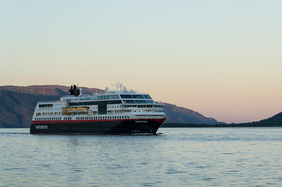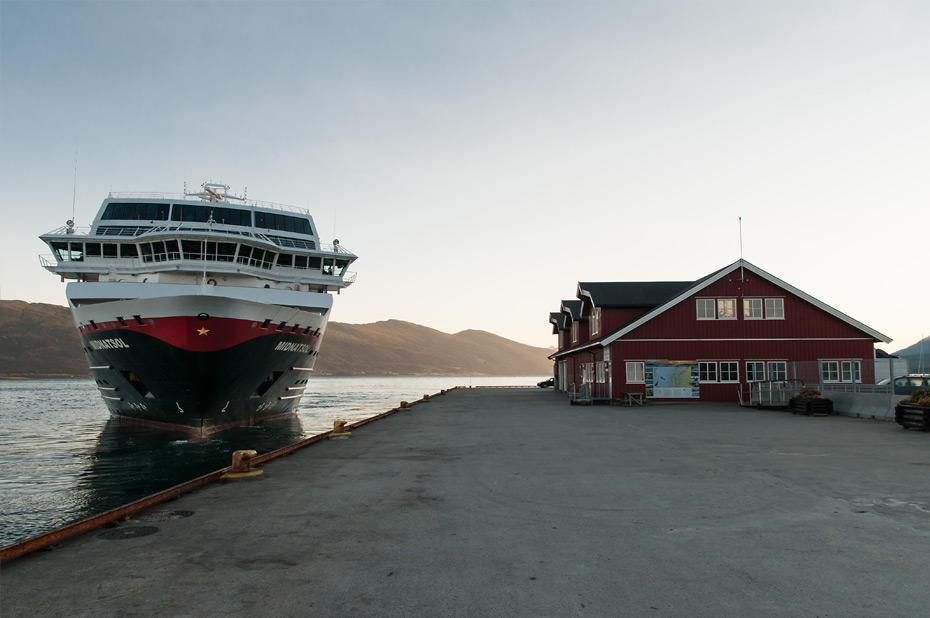 Der frühe Vogel fängt den Wurm, sagt man… Wir sind heut auch früh wach – Hurtigrute gucken. Um 5:25 Uhr legt das nordwärts fahrende Schiff in Nesna an. Die Midnatsol erscheint hinter dem Berg. Eine elegante Drehung und sie macht am Hafen fest. Dann geht alles schnell. Ausladen, einladen, aussteigen und einsteigen. Nach gut fünf Minuten setzt das Schiff seine Fahrt gen Norden fort.