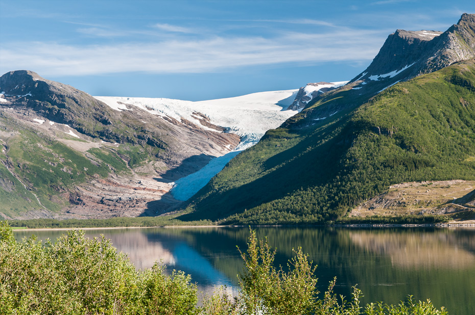 Auf der Fahrt zu unserer Unterkunft in Glomfjord sehen wir später noch eine weitere Gletscherzunge vom Svartisen, zu der wir morgen einen Ausflug geplant haben.