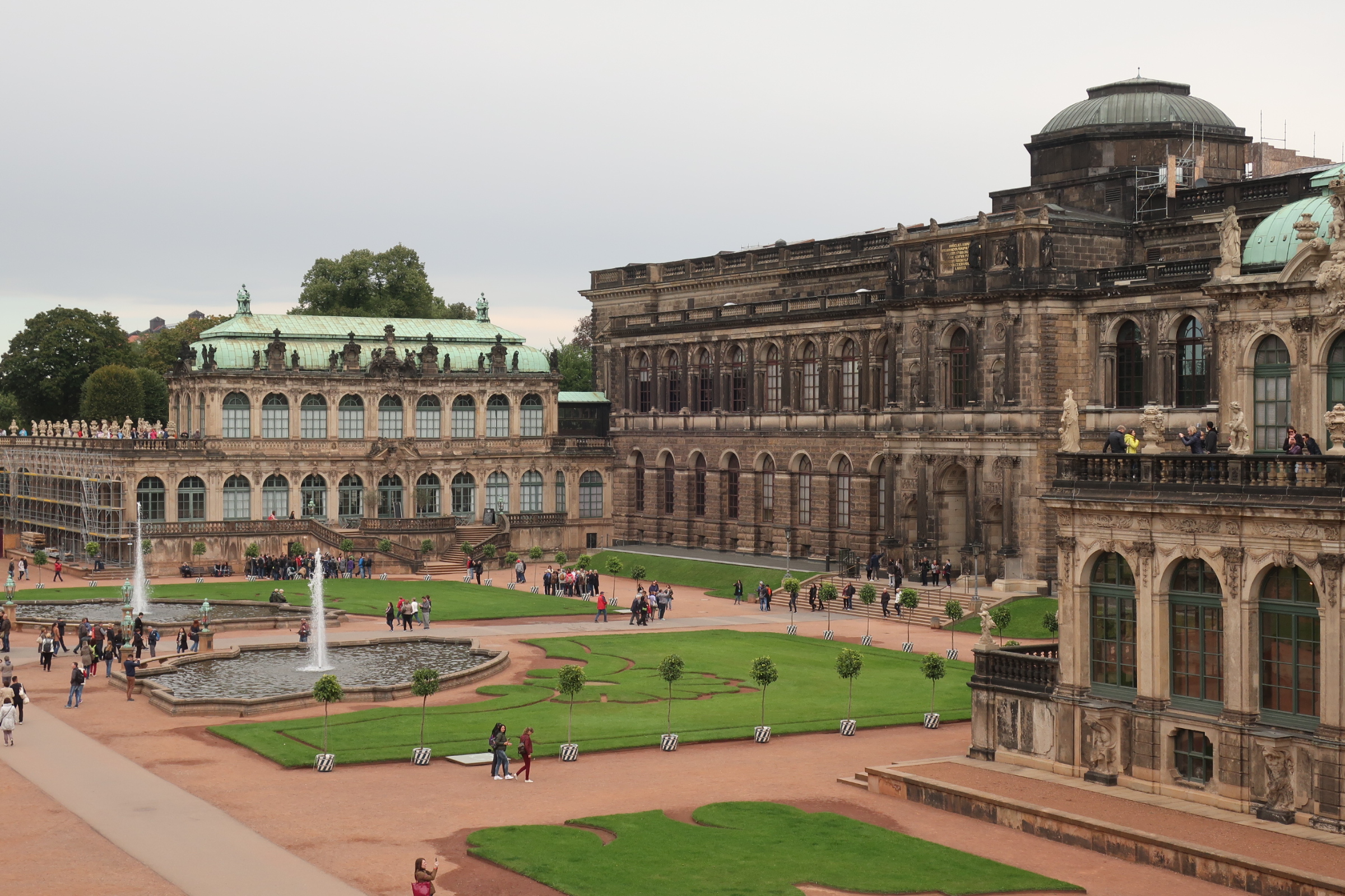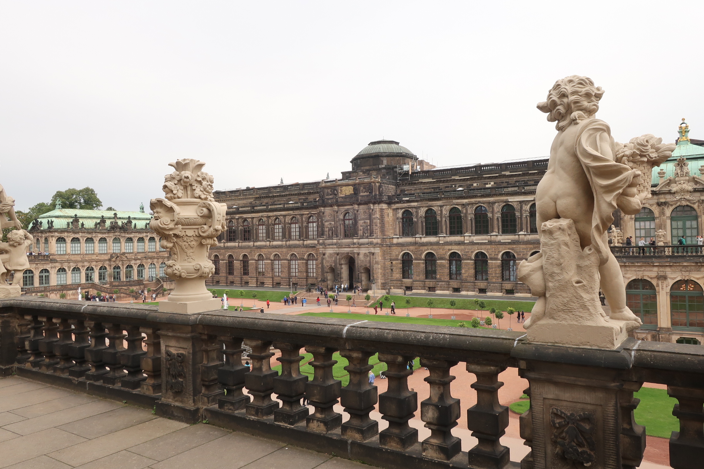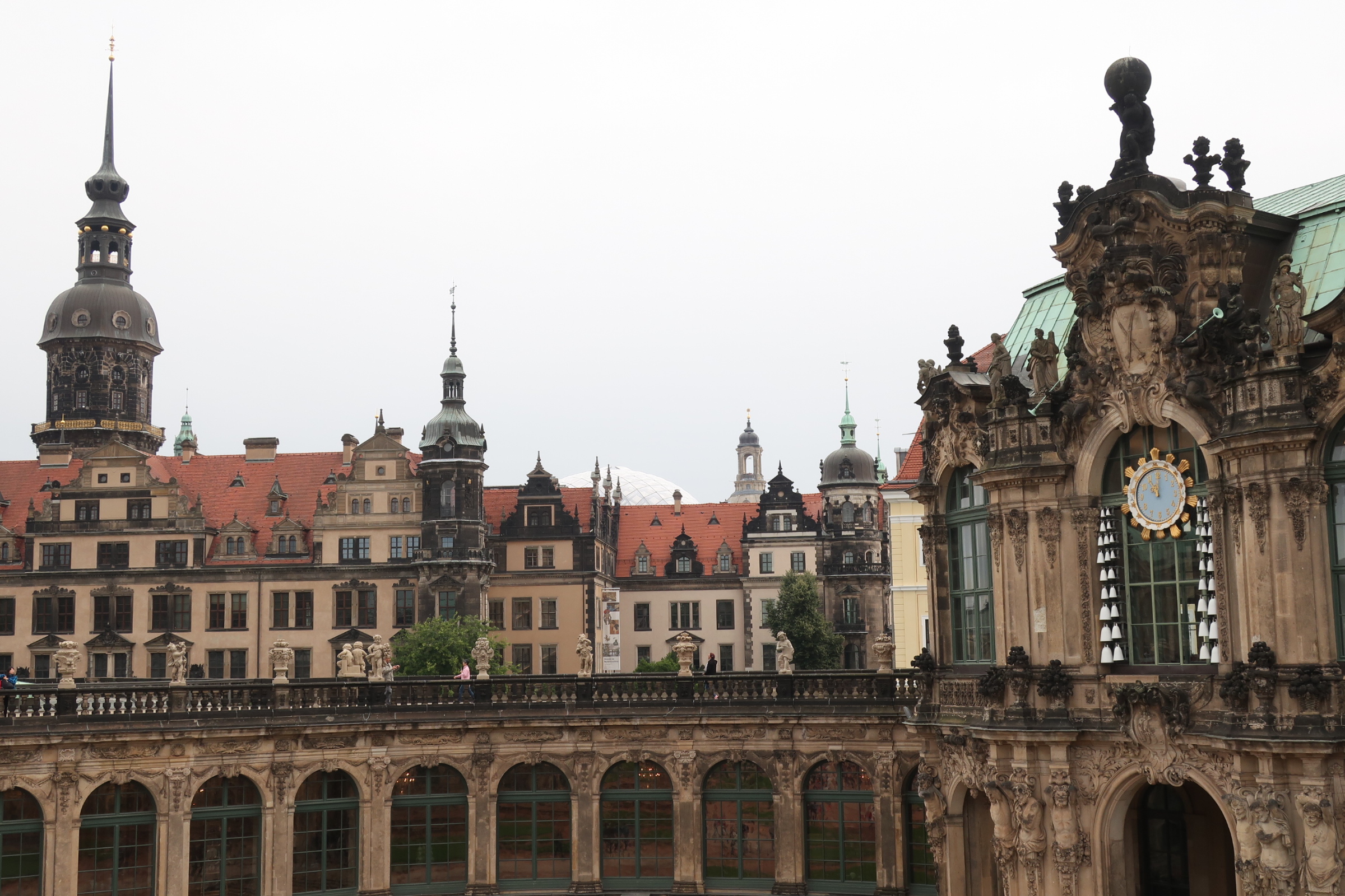Und weil wir schon mal da sind, biegen wir noch auf die Terasse ab und blicken auf den Innenhof des Zwingers, sowie die Türmchen der Altstadt dahinter.