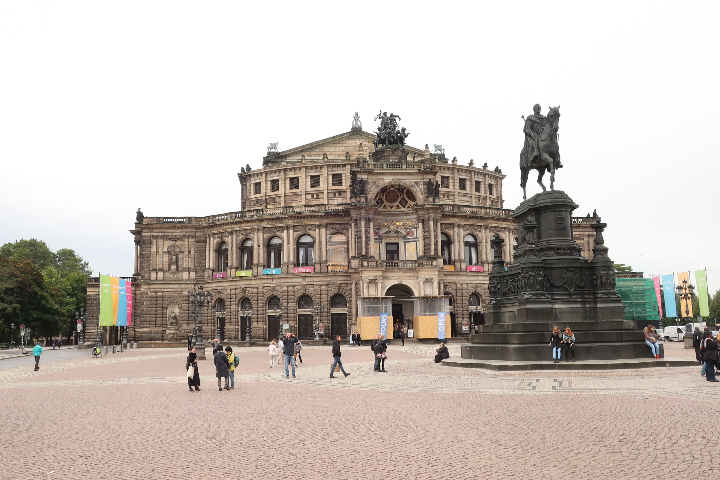 Es klart etwas auf. Wir haben eine Führung in der Semper Oper gebucht. Auf dem Platz hallt uns klassische Klavier Musik entgegen – live gespielt auf einem weißen Flügel. Eine schöne Einstimmung auf das edle Opernhaus.