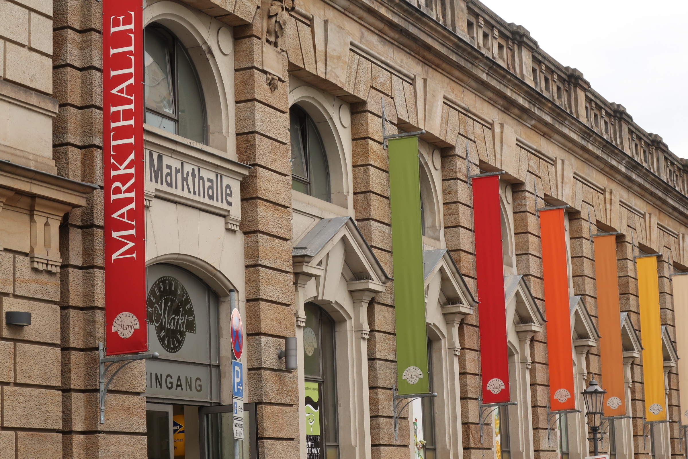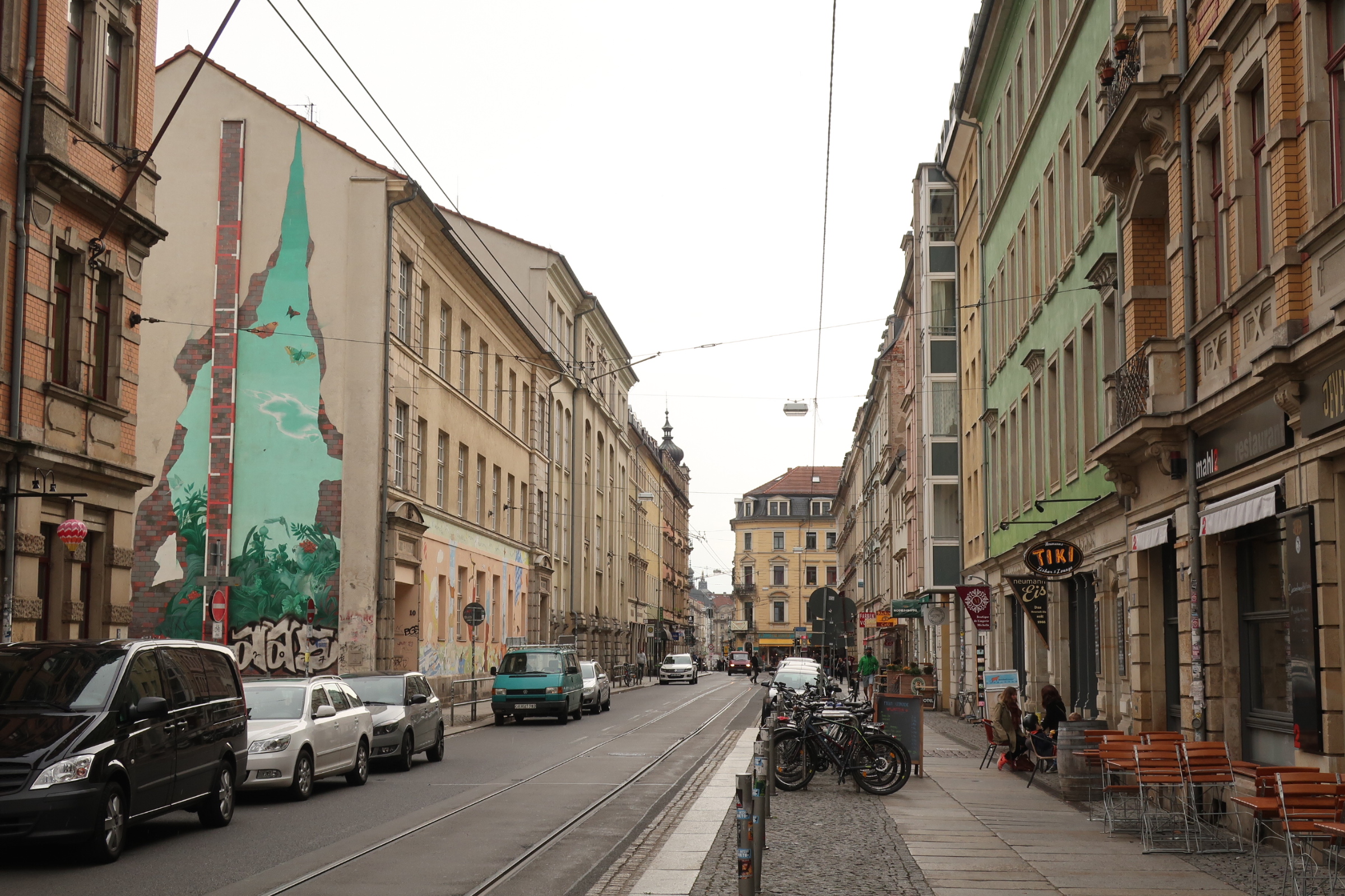 Nachmittags erkunden wir die Neustadt. Über die Augustus Brücke, dann vorbei an einigen Cafés und Läden. In die Markthalle sollte man unbedingt abbiegen und einen leckeren Cappuccino oder Espresso trinken. Vorbei an Wahlveranstaltungen verschiedener Parteien, über einen großen Platz, kommen wir zum “Szeneviertel”. Die Alaunstraße entlang gibt es viel zu entdecken. Mal sind ein paar Graffitisprayer bei ihrer Arbeit zu bewundern. Aus den kleinen bunten Cafés hört man Musik. Viele Menschen sind unterwegs und genießen den Samstag nachmittag. Immer wieder kleine Läden mit tollen Sachen.