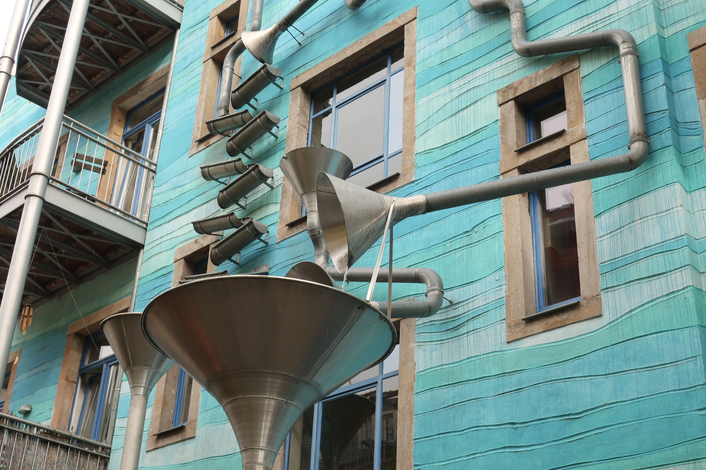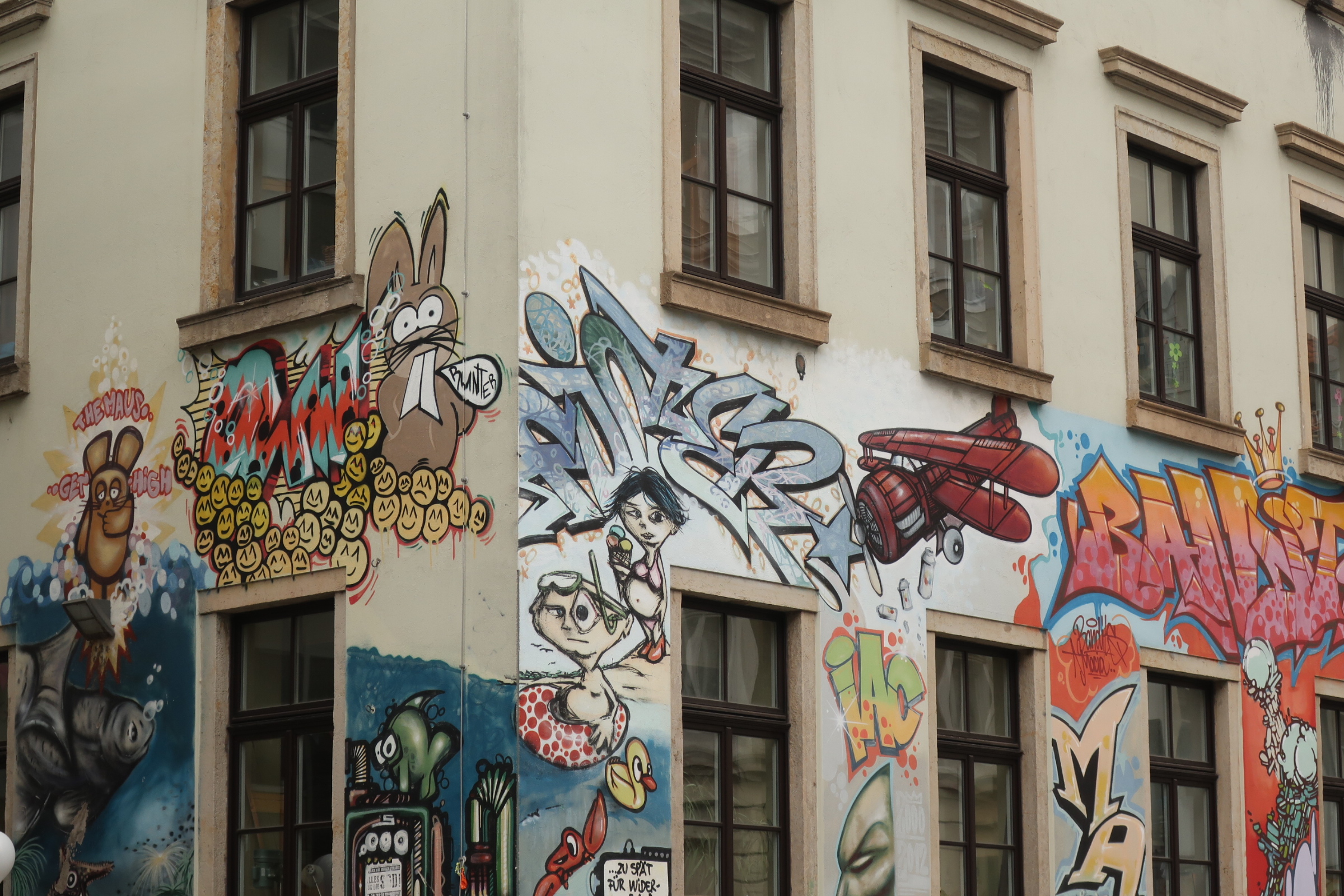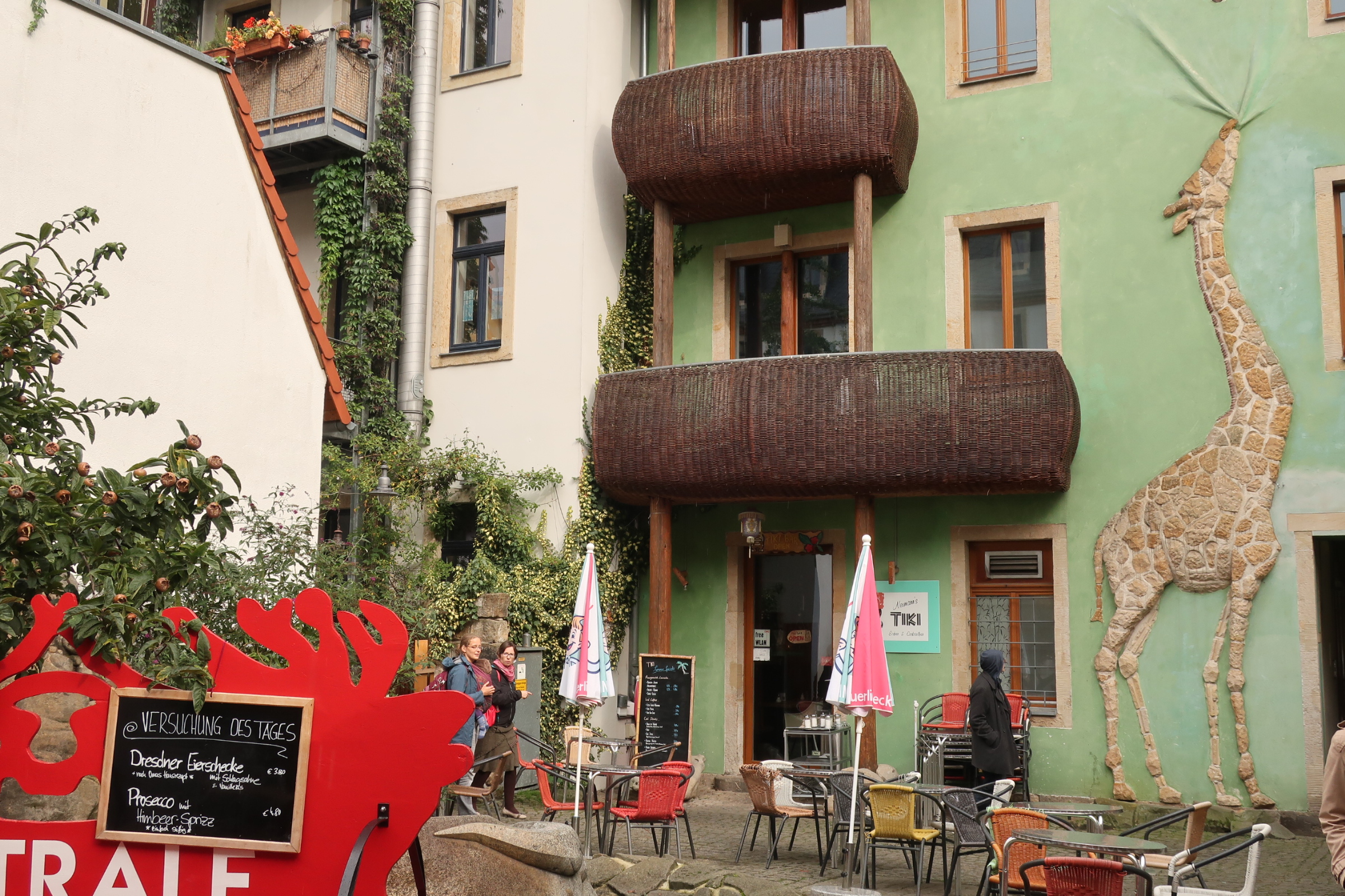 Rechts kommt die Kunsthof Passagen. Eine verwinkelte Häusergruppe mit Innenhöfen und netten Läden, die zum Entdecken einladen. Die Hauswände sind bunt bemalt und mit Kunst gestaltet. Eine moderne Regenrinne, Goldverzierungen oder auch mal eine Giraffe neben dem Balkon.