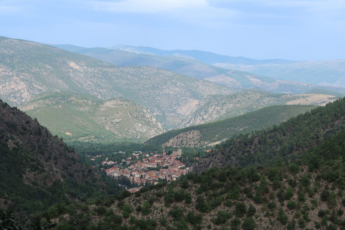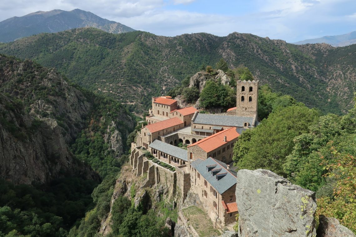 Vormittags laufen wir den gut ausgebauten (geteerten) Weg (ca. 300 Höhenmeter, 45 Minuten einfach) hinauf zur Abbaye Saint-Martin du Canigou. Der Weg ist Teil des berühmten Jakobswegs. Für die, denen der Aufstieg zu anstrengend ist, gibt es einen Fahrservice per Jeep, der sich über die engen Serpentinen die Straße hoch schlängelt. Die Abtei liegt malerisch eingebettet auf einem Felsvorsprung, umgeben von Bergen. Die Abtei kann man nur alle 2h mit einer Führung besichtigen (stand leider anders auf der Webseite). Ein Stück über einen felsigen Weg hoch hat man einen wunderbaren Blick.