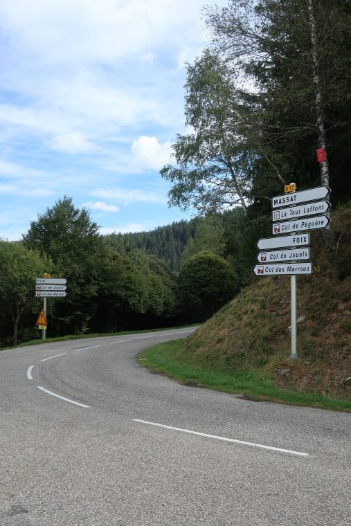 Der Col du Péguère ist der beeindruckendste Pass heute. Er führt über eine einspurige Straße mit 18% Steigung. Bergab merkt man der Gurt im Auto. Man möchte sich nicht vorstellen, wie hier die Radfahrer der Tour de France hinauf gearbeitet haben. Auf der Passhöhe gibt es mit dem Tour Laffont einen Aussichtspunkt. Rundherum blühen Herbstzeitlose, die wir irrtümlich erst einmal für Krokusse gehalten haben.