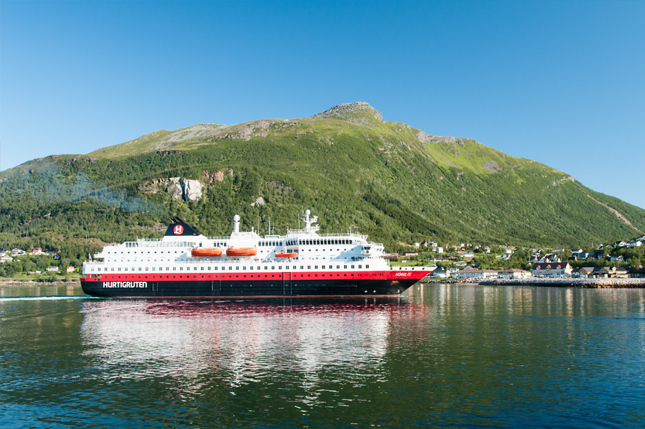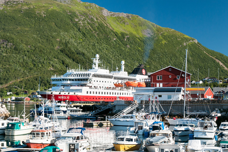 Die nordwärts fahrende Hurtigrute kommt um 9:15 Uhr in Ørnes vorbei. Ørnes ist ein kleines malerisches Örtchen an der Rv 17 gelegen. Und wir lassen uns natürlich nicht entgehen wie das Schiff in den kleinen Hafen einbiegt.