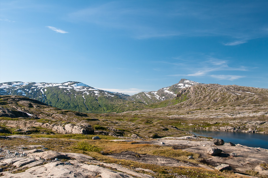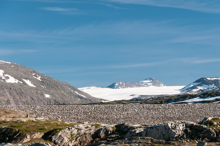 Abends fahren wir zu einem mächtigen Stausee hoch. Zunächst entlang des Fylkanvatn, dann durch zwei unbeleuchtete Tunnel. Der weitere Weg zum oberen Ende der Staumauer ist noch schneebedeckt. Bisher war hier zu wenig Sommer, um alles weg zu schmelzen. Wir gehen den gegenüber liegenden Berg ein Stück hinauf und genießen die Aussicht.