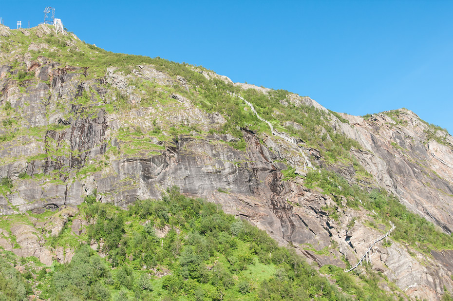 Auf dem Rückweg halten wir kurz an einer weiteren “Touristen-Attraktion” von Glomfjord: Die “Fykan Stairs”. 1127 Holzstufen, abenteuerlich in die Felswand gebaut. Die Aussicht vom Restaurant am oberen Ende der Treppe auf Fjord und Gletscher soll atemberaubend sein… Aber beim Anblick der Treppen und dem Blick auf die Uhr lassen wir die Aussicht Aussicht bleiben und fahren zurück in unsere Unterkunft.