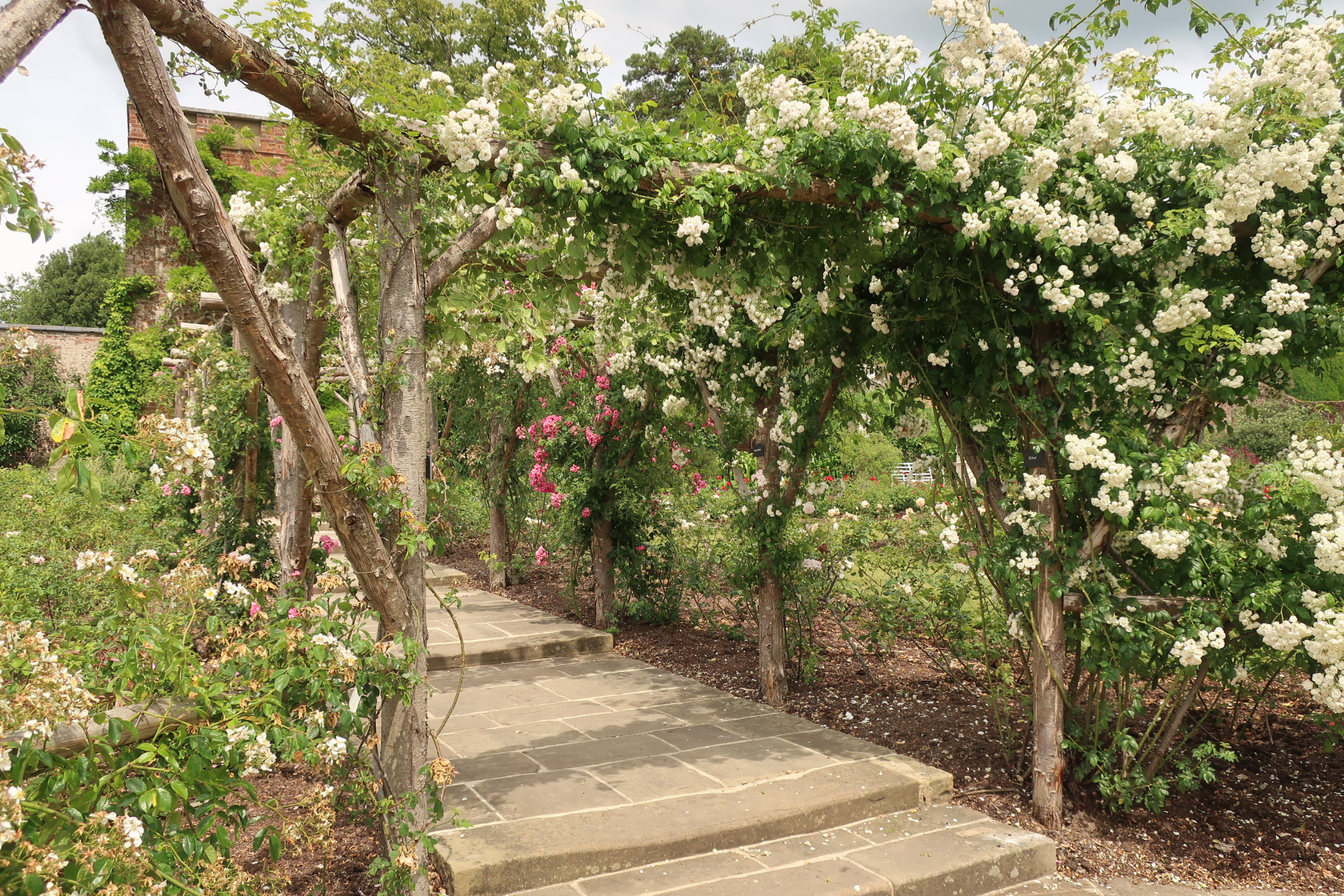 Der Garten übertrifft nochmal alles. Blühende Rosen soweit das Auge reicht. Alte und neue Sorten. Ganz kleine feine Röschen, dann wieder große, volle Köpfe. Alle Farben. Wunderbar auch die Ranken voll mit Blüten.