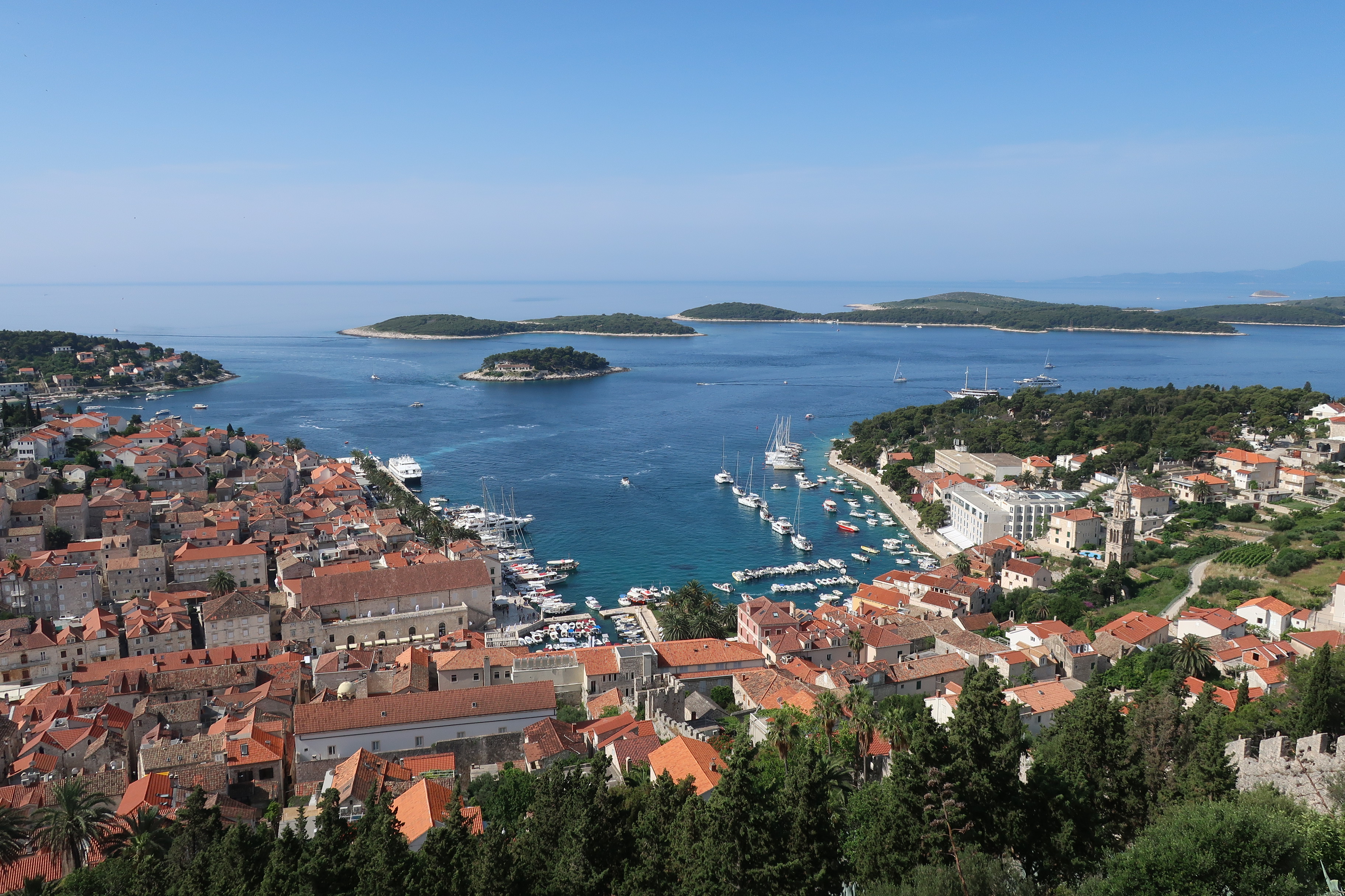 Gut gestärkt geht es hinauf zur Burg über der Stadt Hvar (mit dem Auto, war ja kurz nach dem Frühstück). Von hier oben sieht man nicht nur den Hafen von Hvar, sondern hat auch einen besonderen Blick auf die vorgelagerten Inseln. Es ist noch früh, aber auf dem Wasser ist schon viel Verkehr.