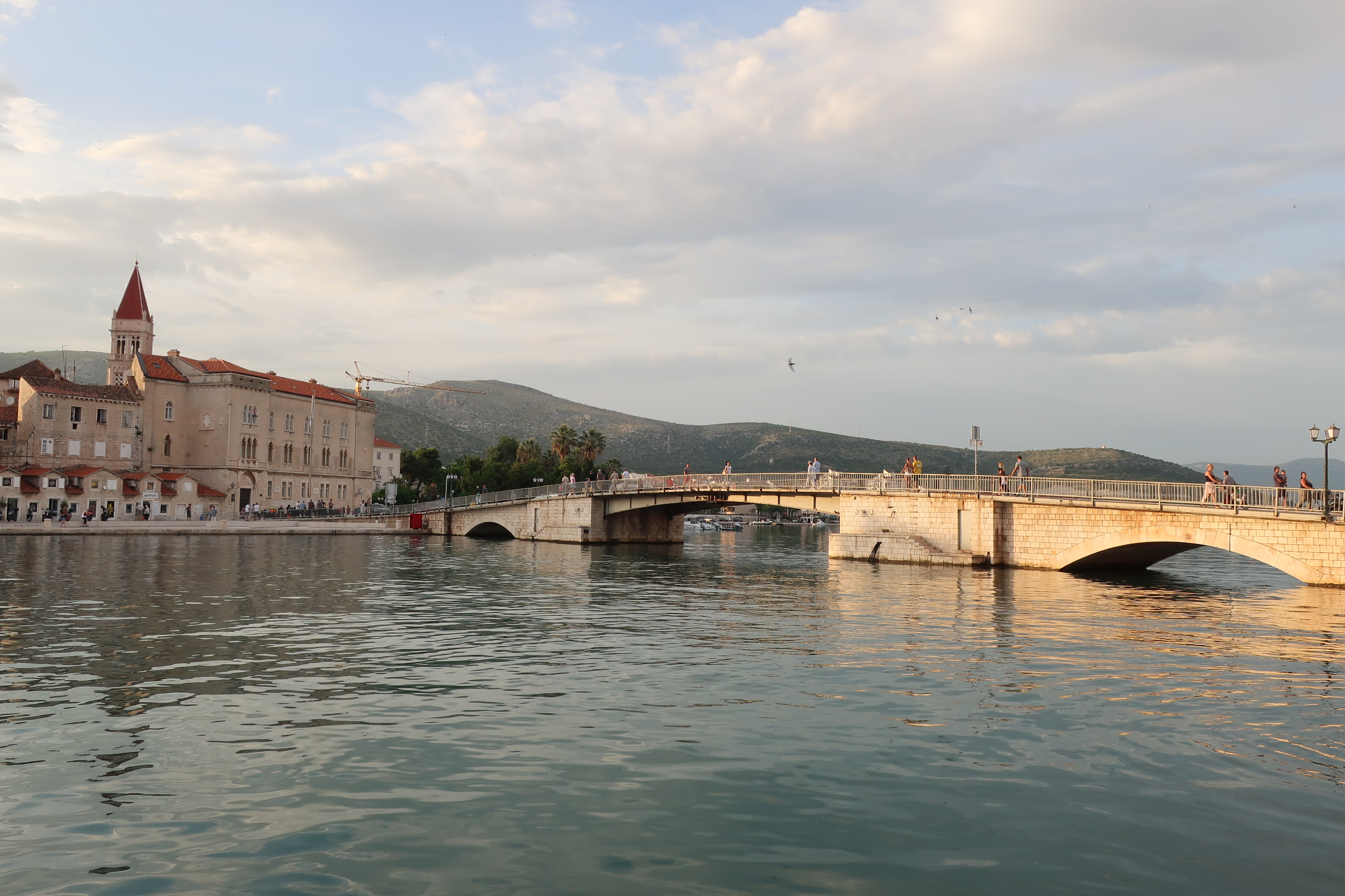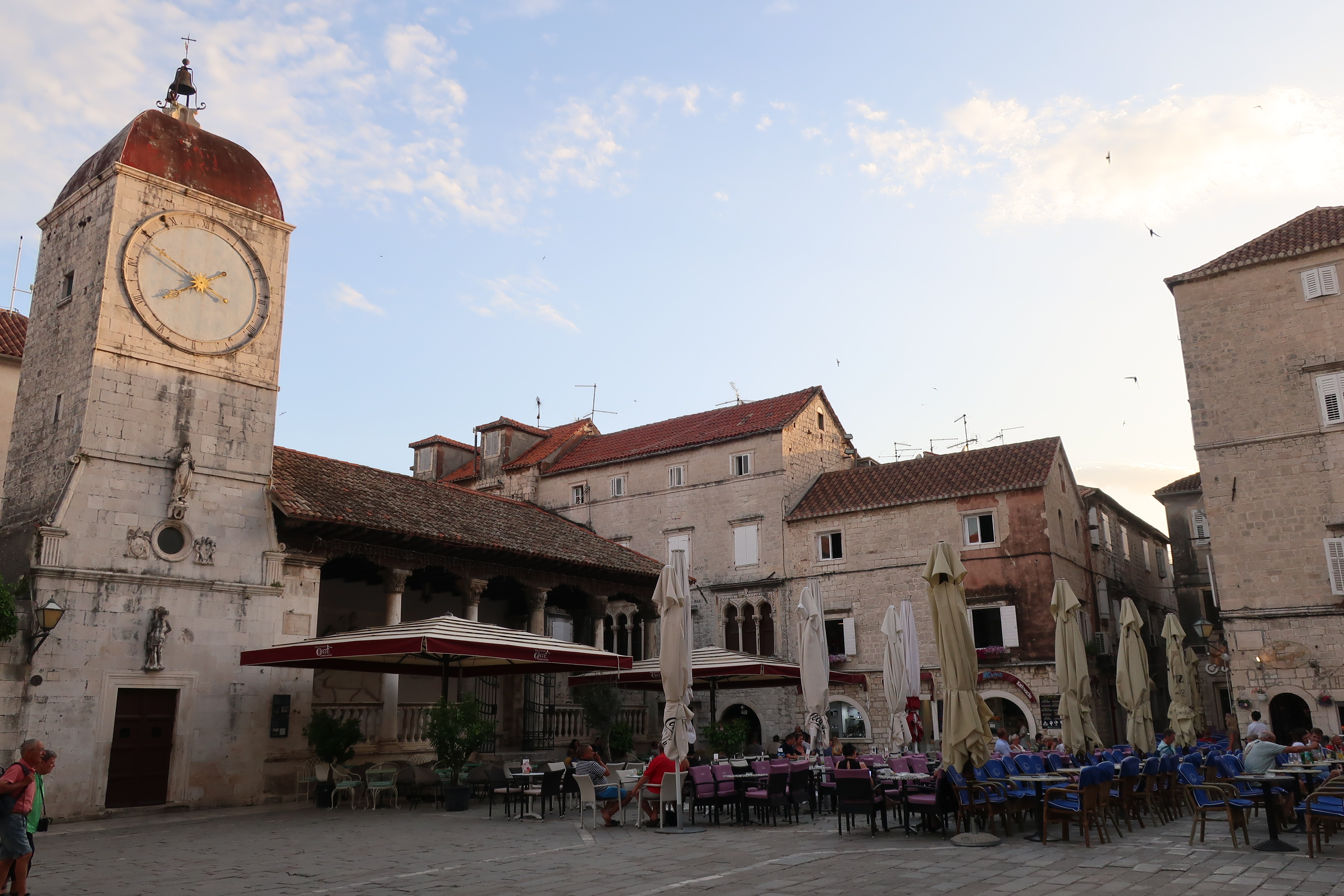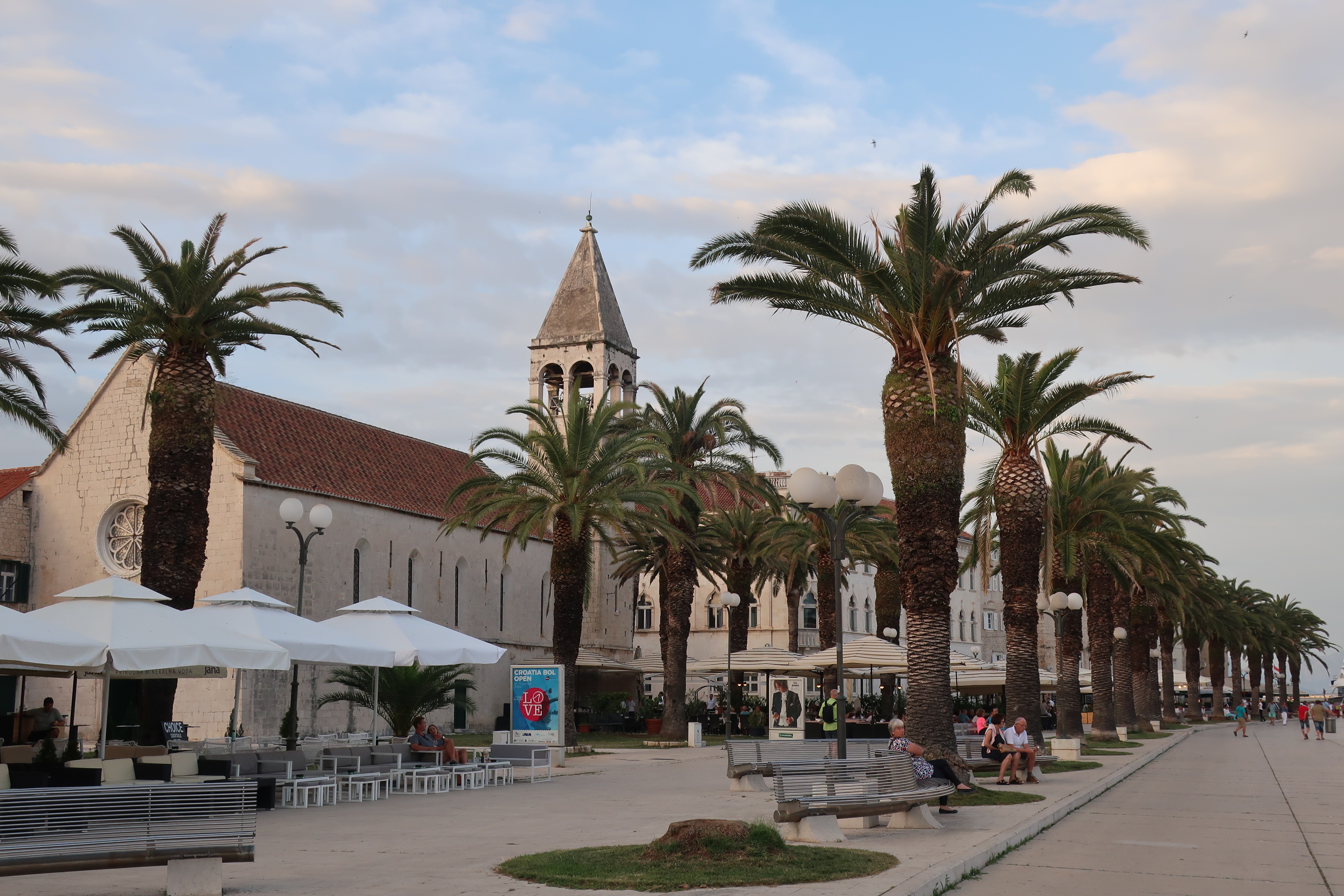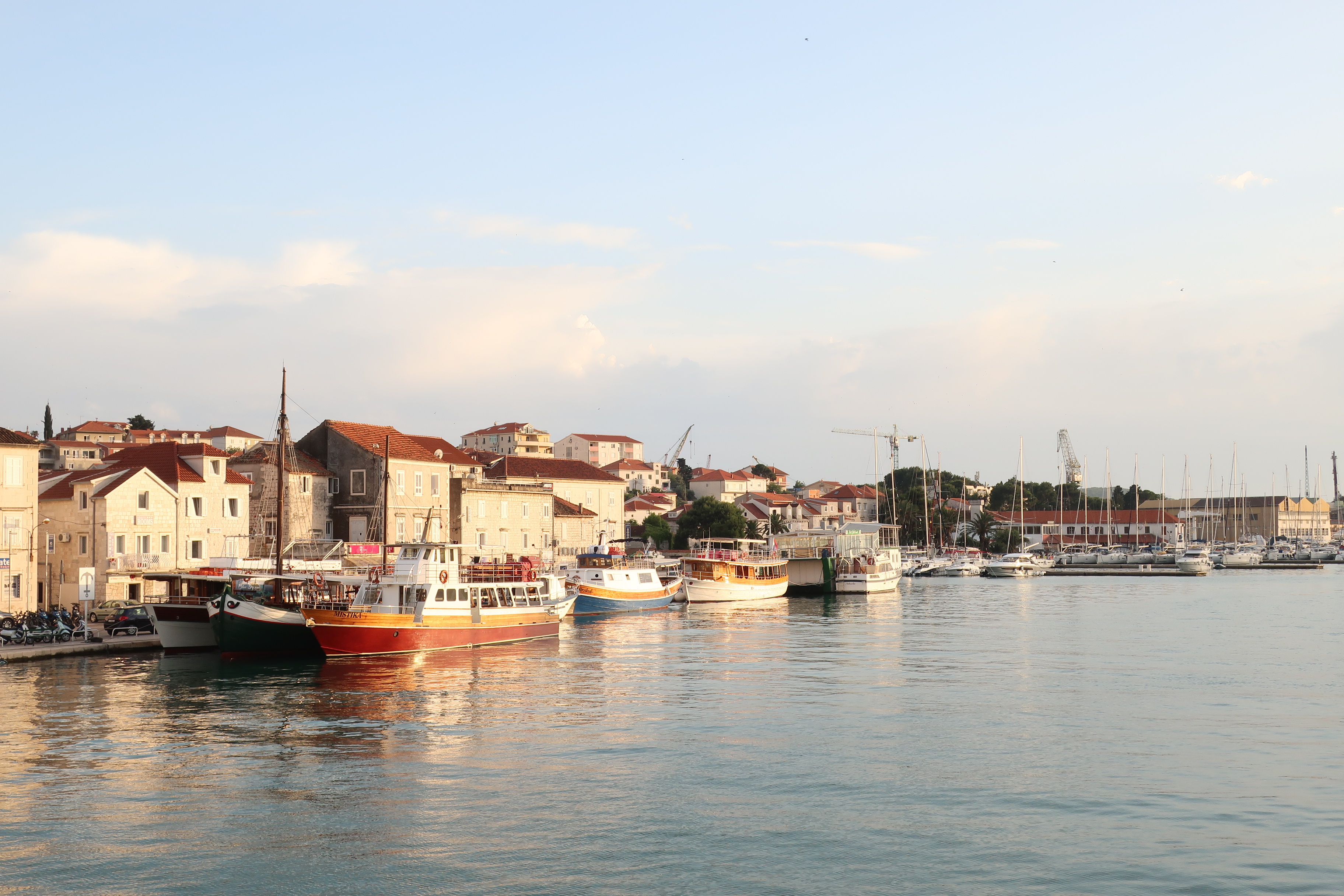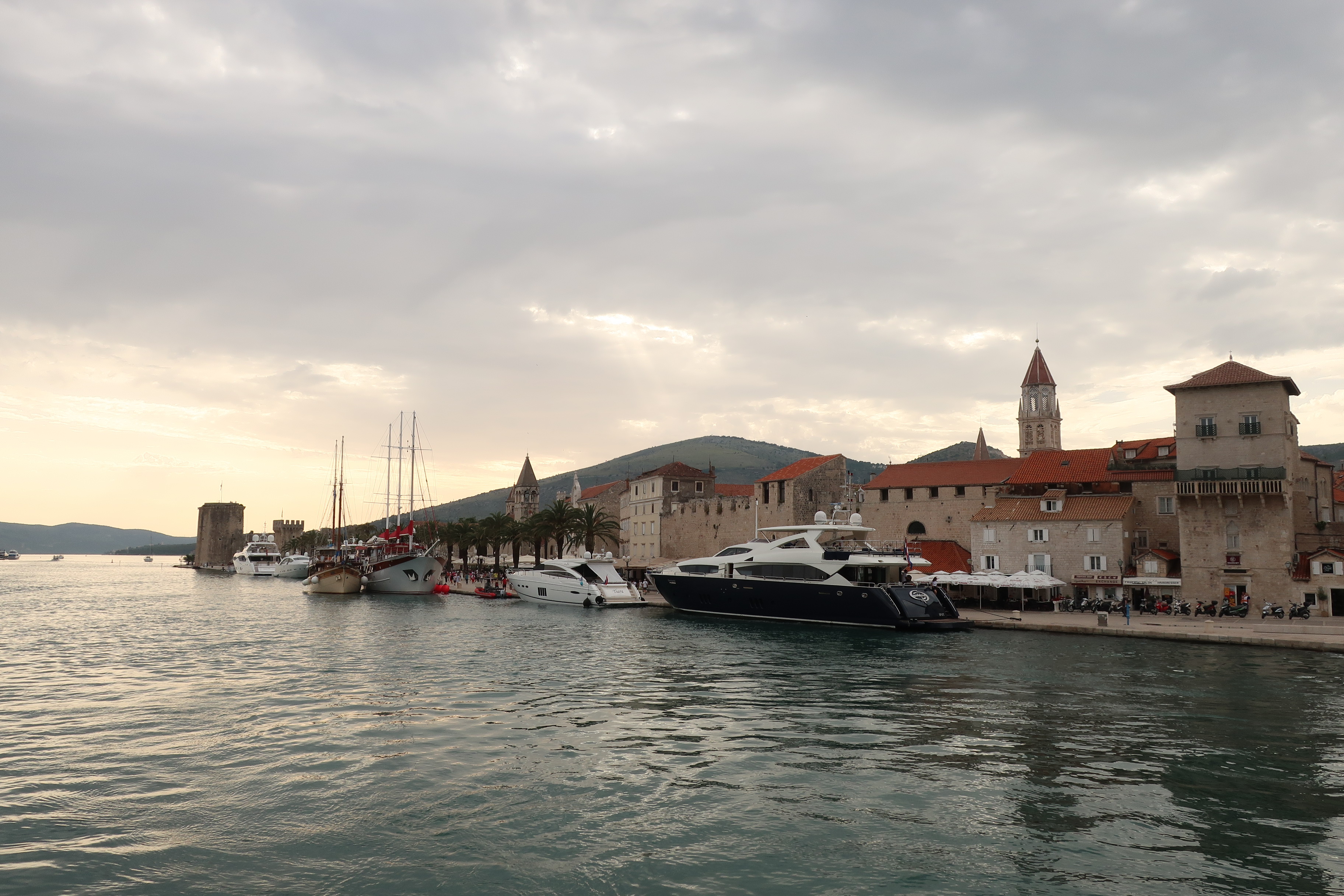 Dann zieht die Wolkendecke etwas zu und wir entscheiden uns weiter zu fahren. Unser Übernachtungsort heißt heute: Trogir. Das kleine Hafenörtchen liegt nördlich von Split auf einer kleinen Insel. Heute ist die Insel mit Brücken mit dem Festland verbunden. Gemütlich kann man hier abends durch die engen Gassen bummeln. Es gibt zahlreiche Restaurants und Bars. Die Uferpromenade ist beliebt bei großen Schiffen. Eine Yacht reiht sich an die nächste. Dann wieder ein Segelkreuzfahrtschiff dazwischen. Schon beeindruckend.