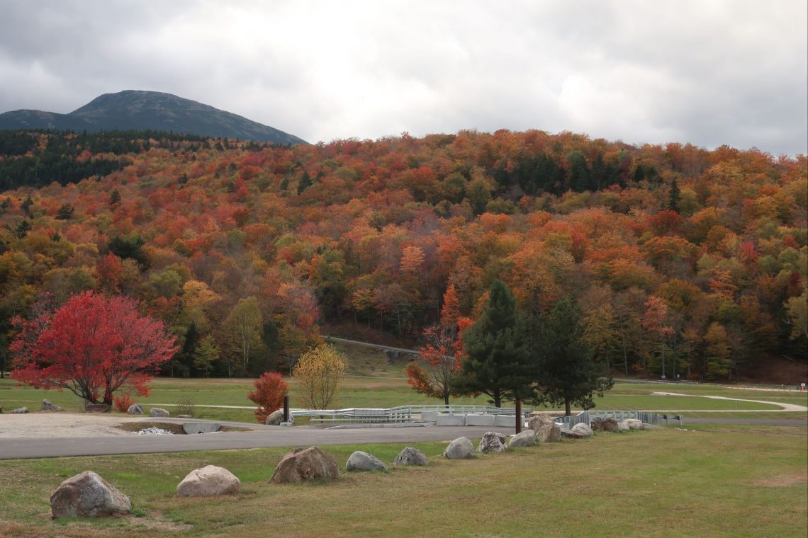Zum Abschluss halten wir in Bretton Woods – eine prunkvoll-protzige Hotelanlage. Weißes Gebäude mit Türmchen vor buntem Bergpanorama…