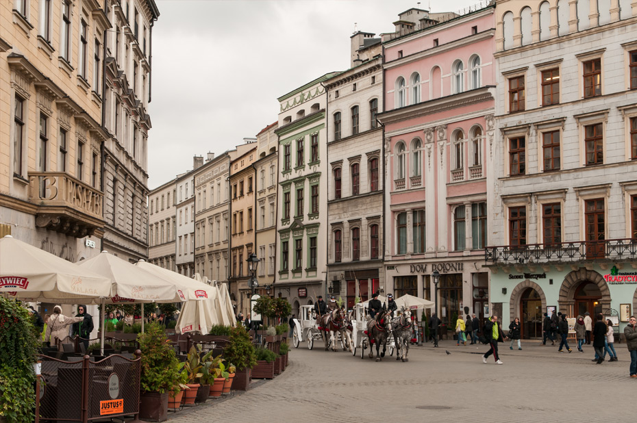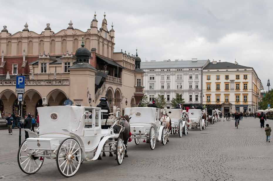 Unser erstes Ziel war der Rynek, der größte und zentralste Platz hier in Krakau. Und dementsprechend trubelig ging’s dort zu. Es war noch Markt. In weißen Fiaker fuhren Touristen durch die Gegend. Und unzählige Tauben segelten im Tiefflug über den Platz.