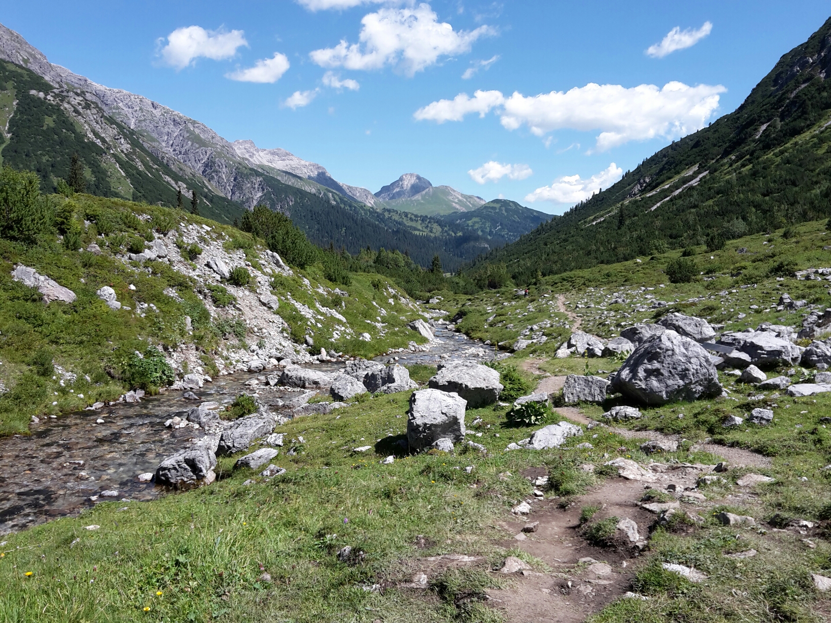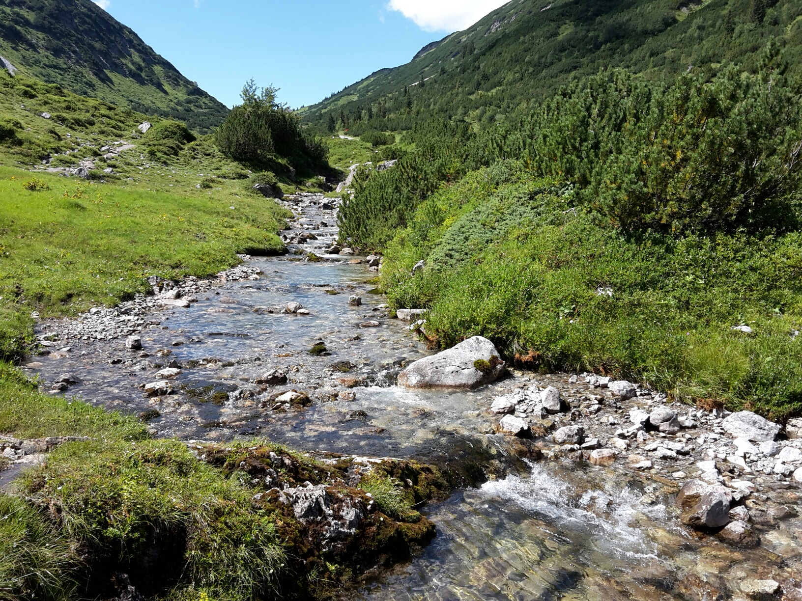 Die Sonne strahlt, kaum eine Wolke am Himmel. Herrlich sich so treiben zu lassen. Der Weg führt weiter talabwärts, mal breiter, mal schmäler. Das Tal wird immer breiter, das Wasser mehr. Wir genießen einfach den Tag. Die ideale Wanderung zum Entspannen.