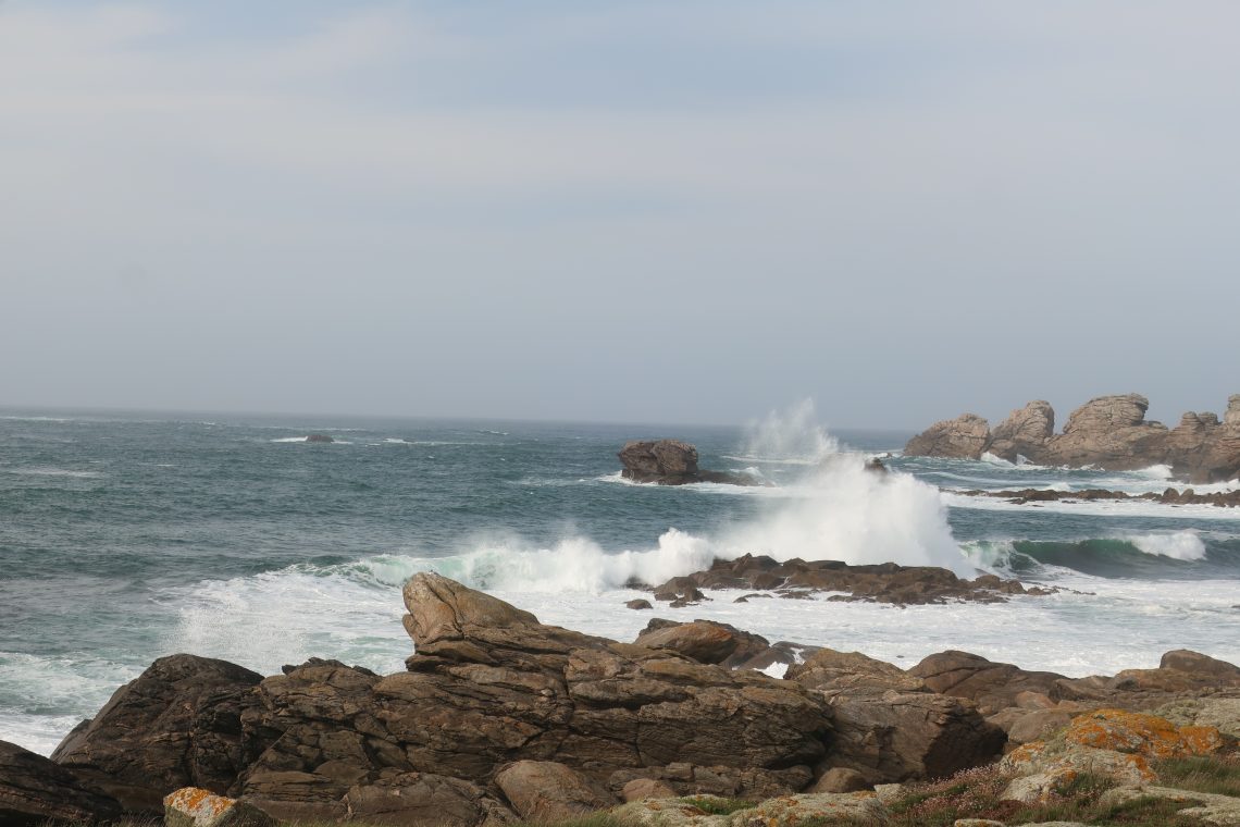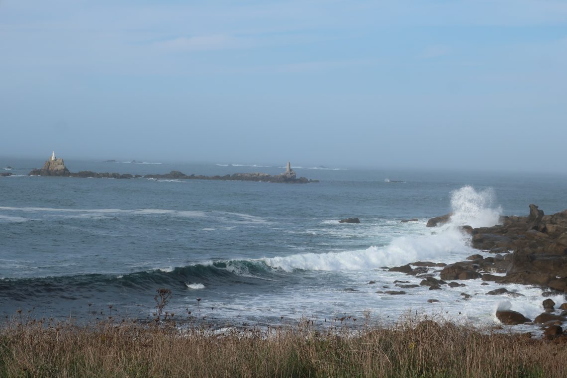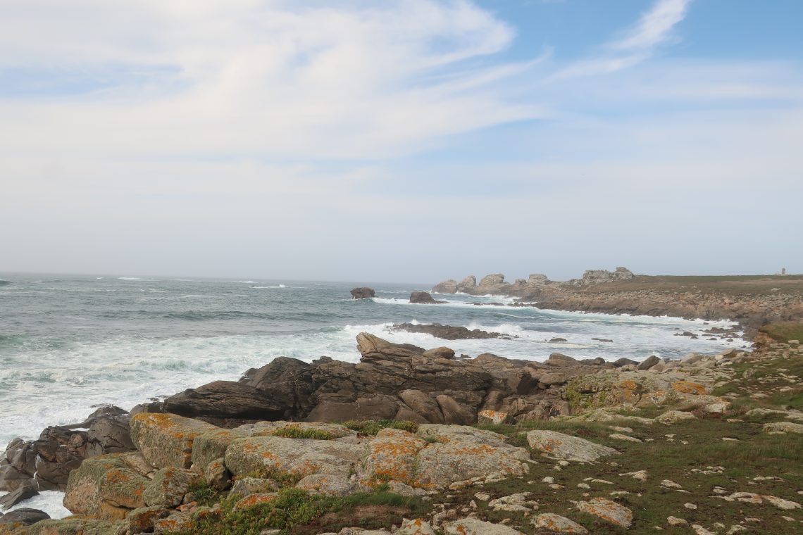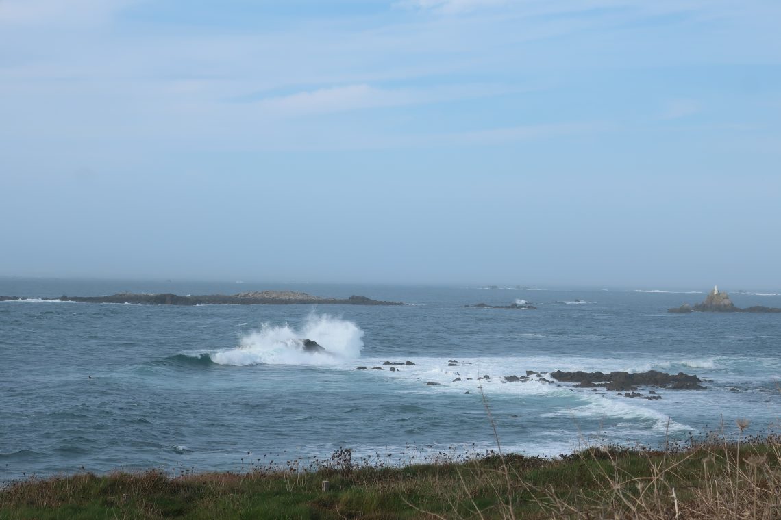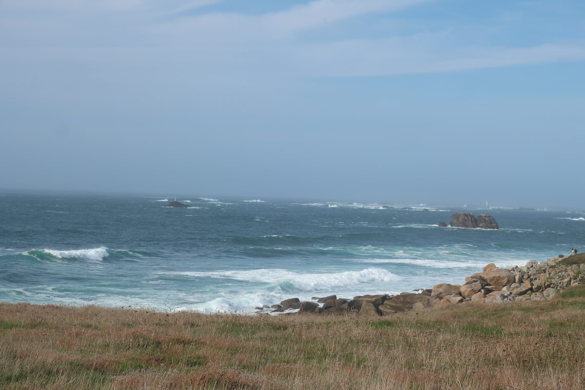 Weiter nördlich am Pointe de Corsen blickt man aufs Meer hinaus. In der Ferne sieht man große Schiffe, u.a. die Fähre nach England. Das Wetter heute lieblich, sonnig und windstill, doch vom Meer herein kommen große Wellen, die mit weißer Gischt an der felsigen Küste zerbersten. Etwas im Landesinneren sieht man noch den hiesigen Leuchtturm – Phare Trezien.