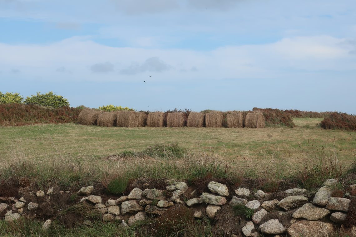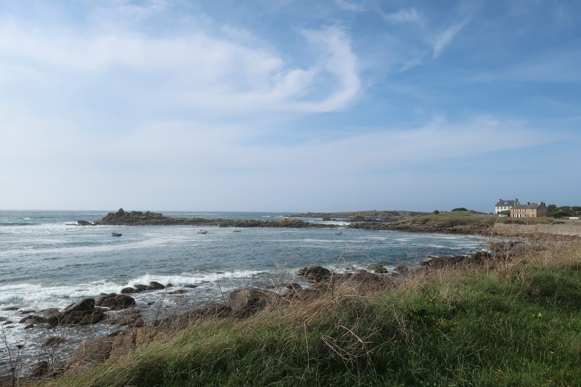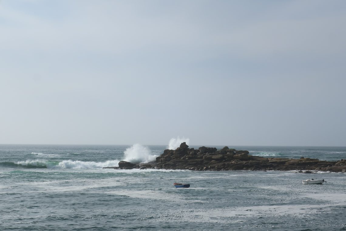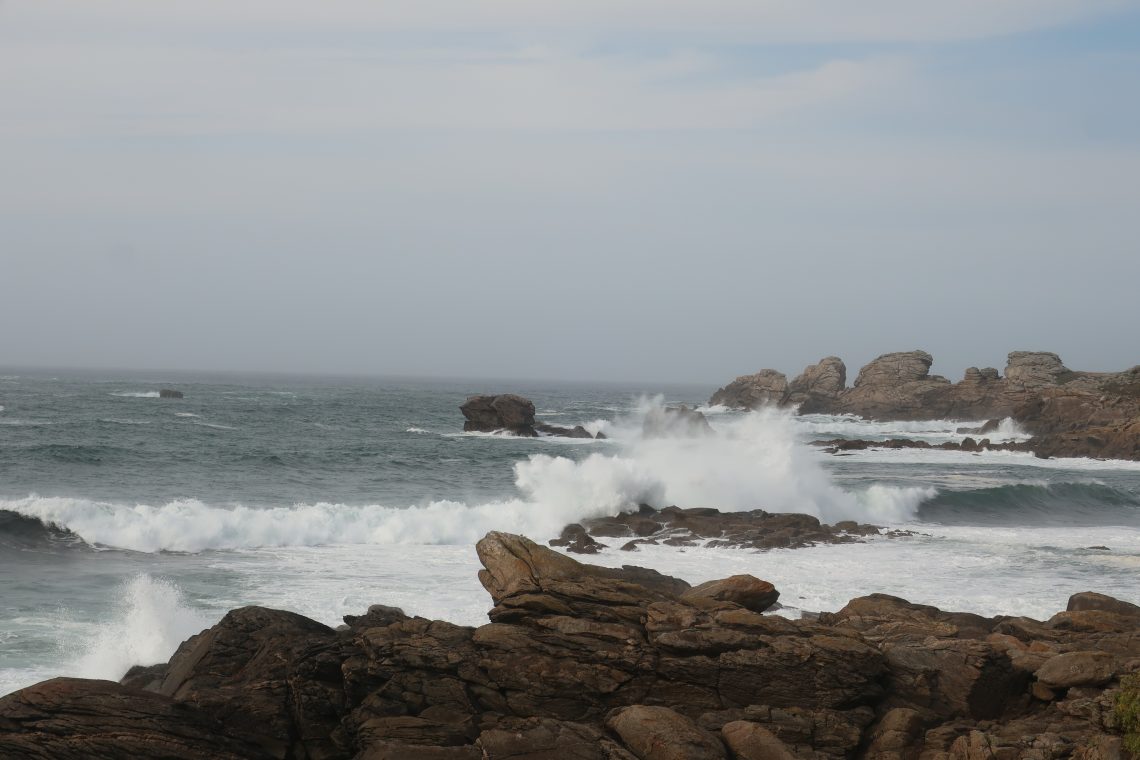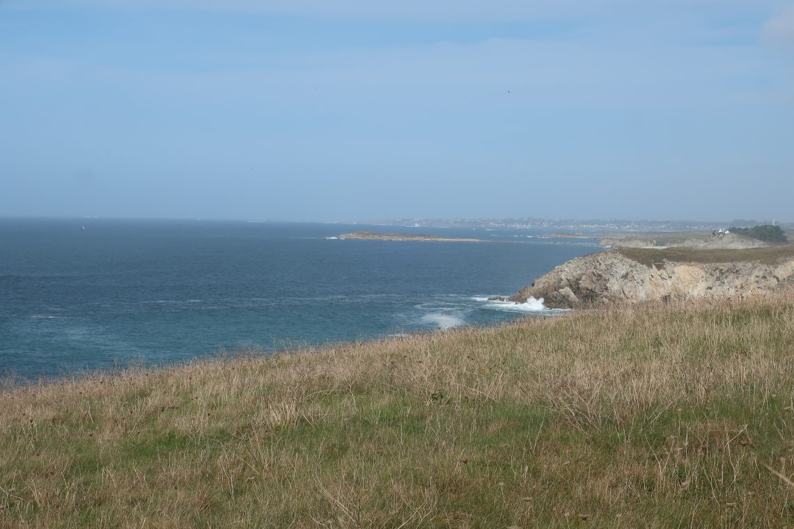 Weiter nördlich am Pointe de Corsen blickt man aufs Meer hinaus. In der Ferne sieht man große Schiffe, u.a. die Fähre nach England. Das Wetter heute lieblich, sonnig und windstill, doch vom Meer herein kommen große Wellen, die mit weißer Gischt an der felsigen Küste zerbersten. Etwas im Landesinneren sieht man noch den hiesigen Leuchtturm – Phare Trezien.