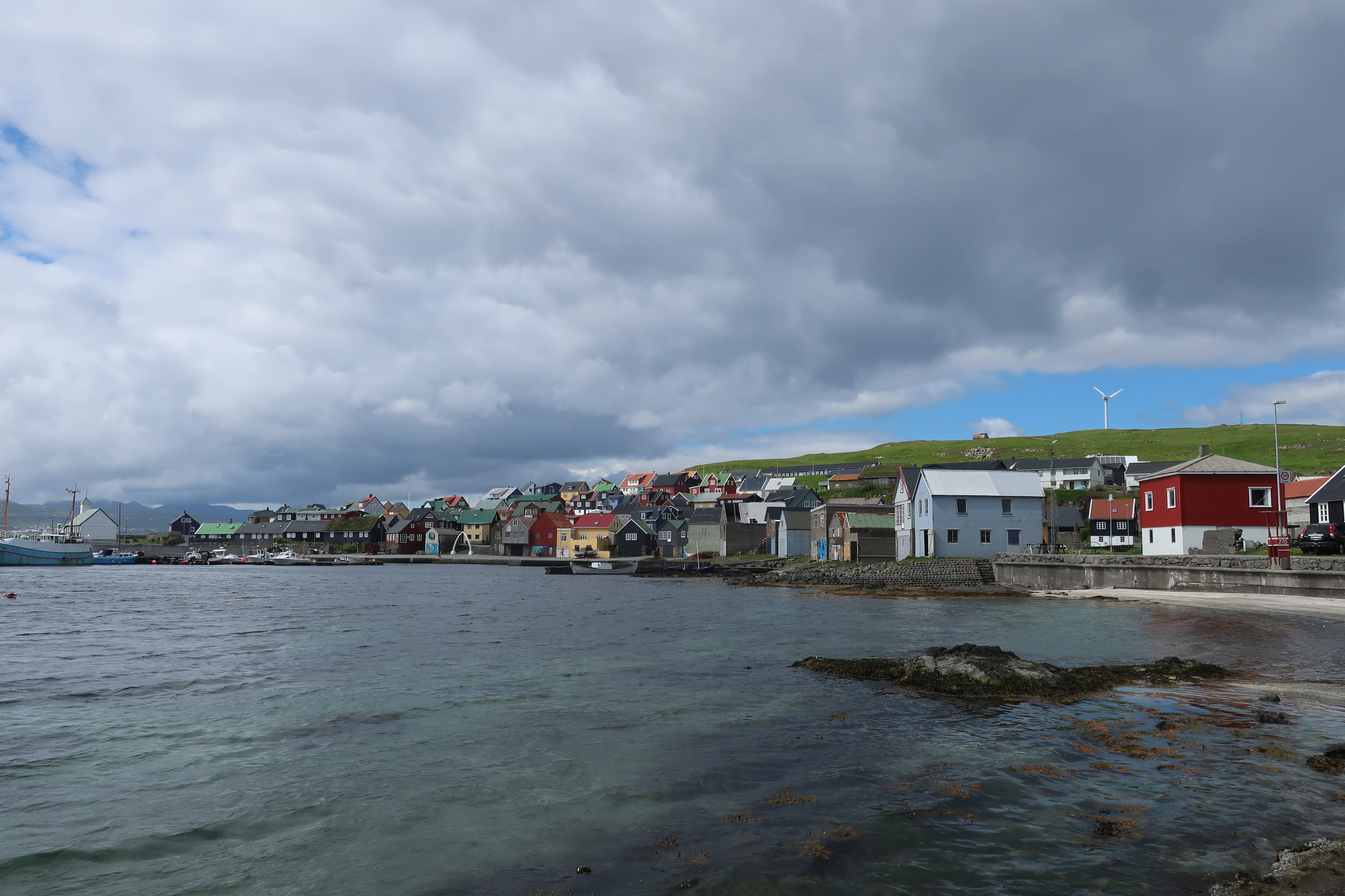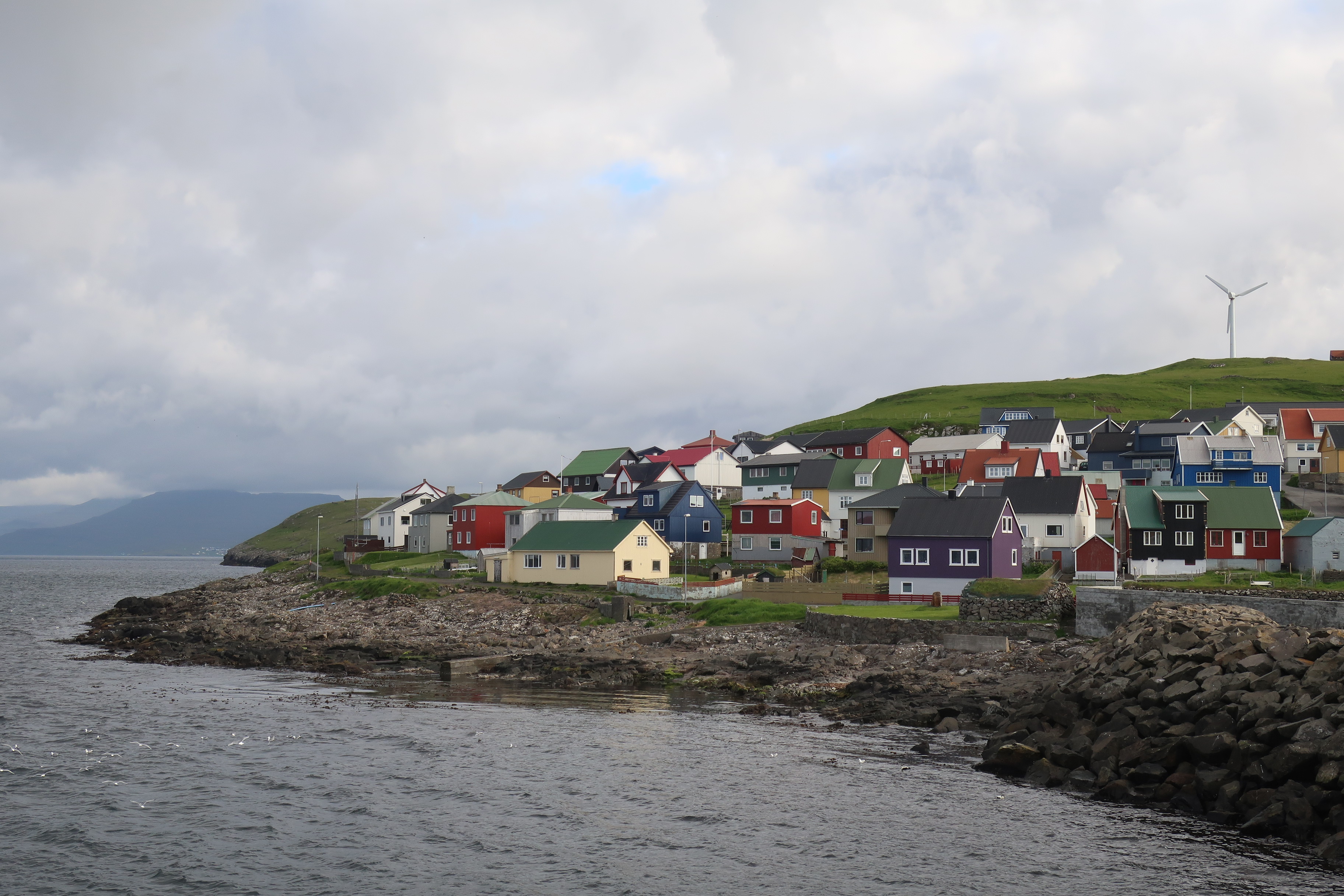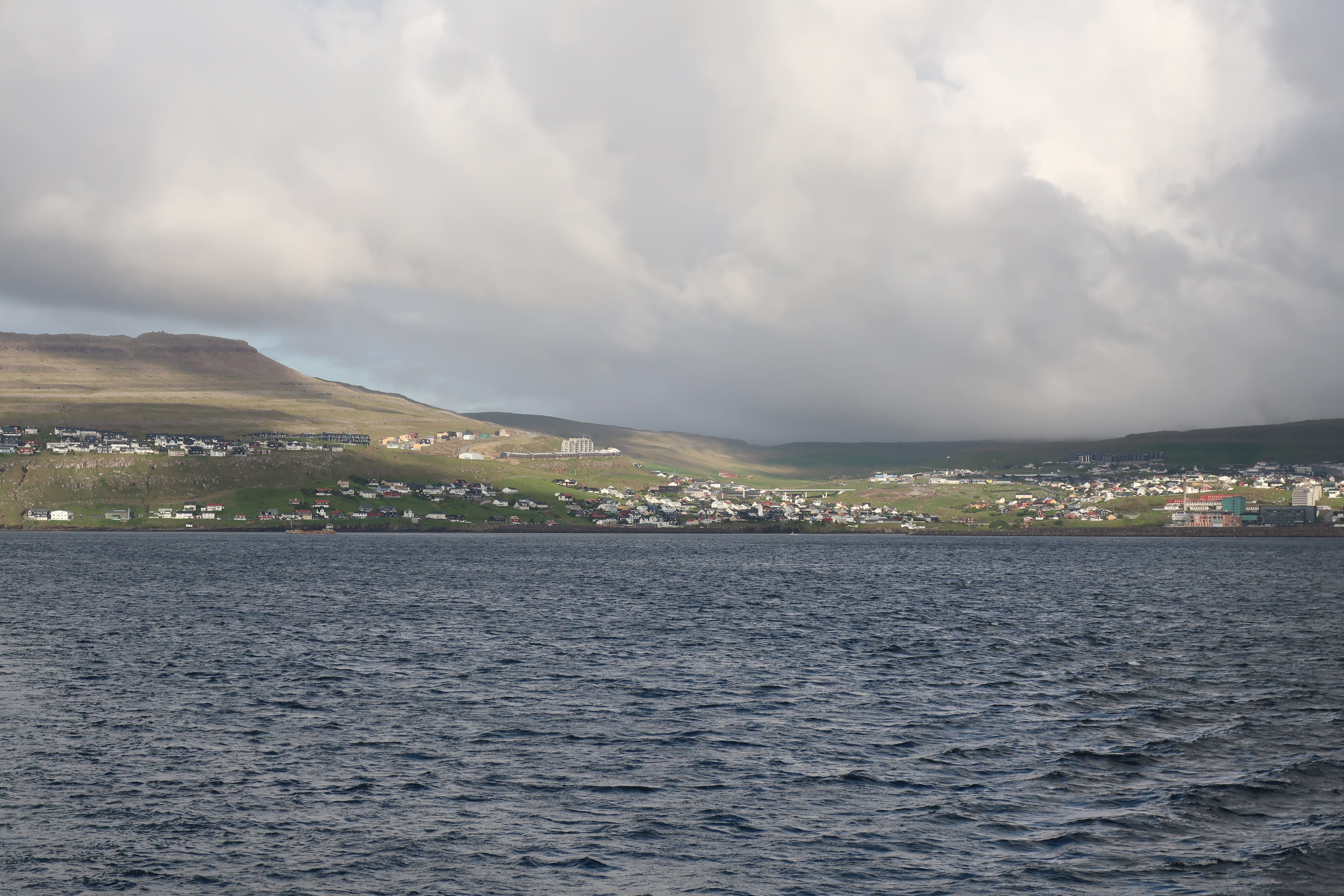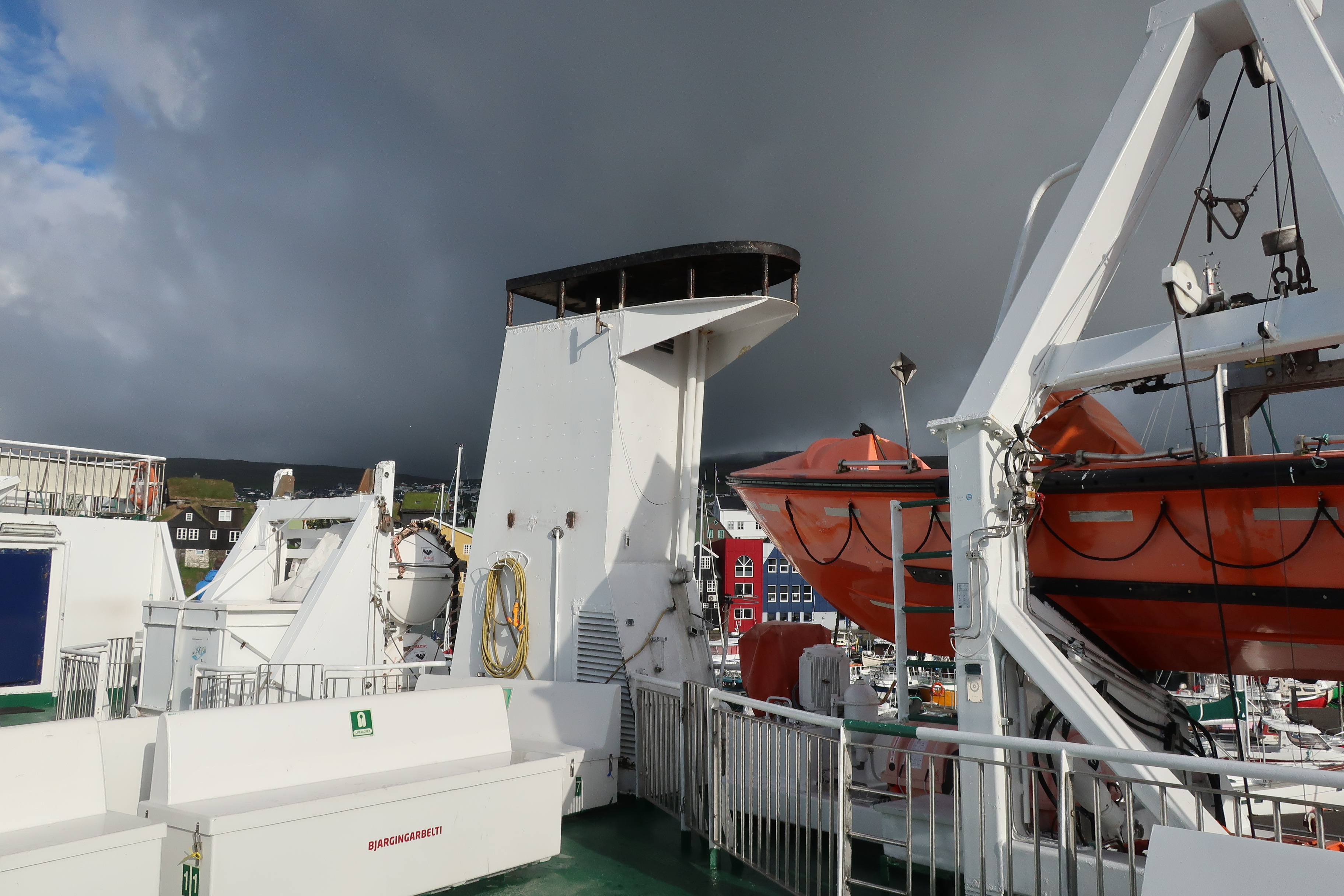 Mit der Fähre geht es heute auf die Insel Nolsoy. Die Insel liegt quer vor Torshavn und schützt damit die Stadt. Auf Nolsoy leben ca. 200 Menschen. Die Überfahrt von Torshavn dauert nur 20 Minuten. Als wir mit der Fähre ablegen hängen über Torshavn noch dunkle Wolken, in Richtung Nolsoy sieht es freundlicher aus. Und portal.fo hat uns einen sonnigen Tag versprochen.