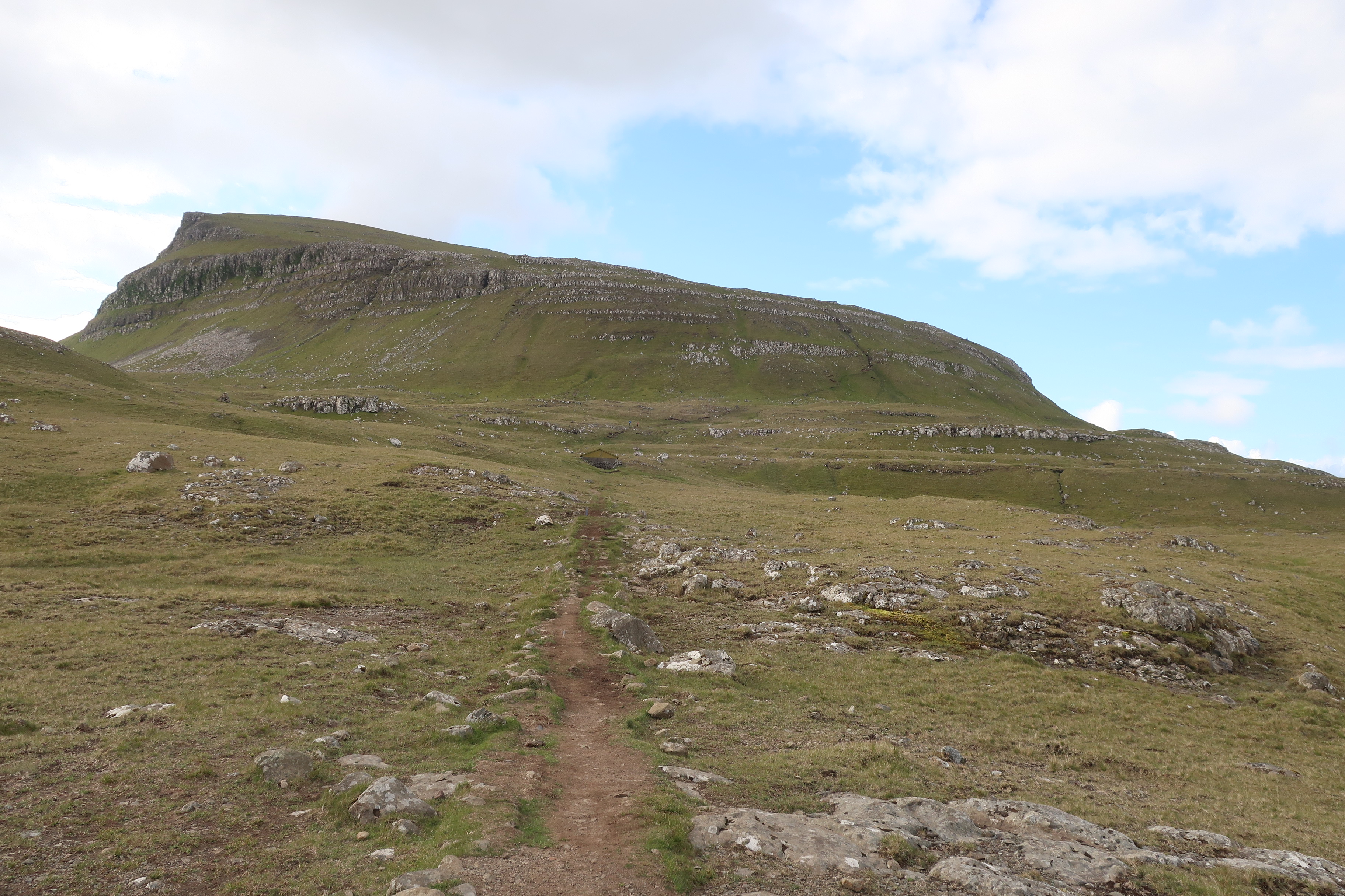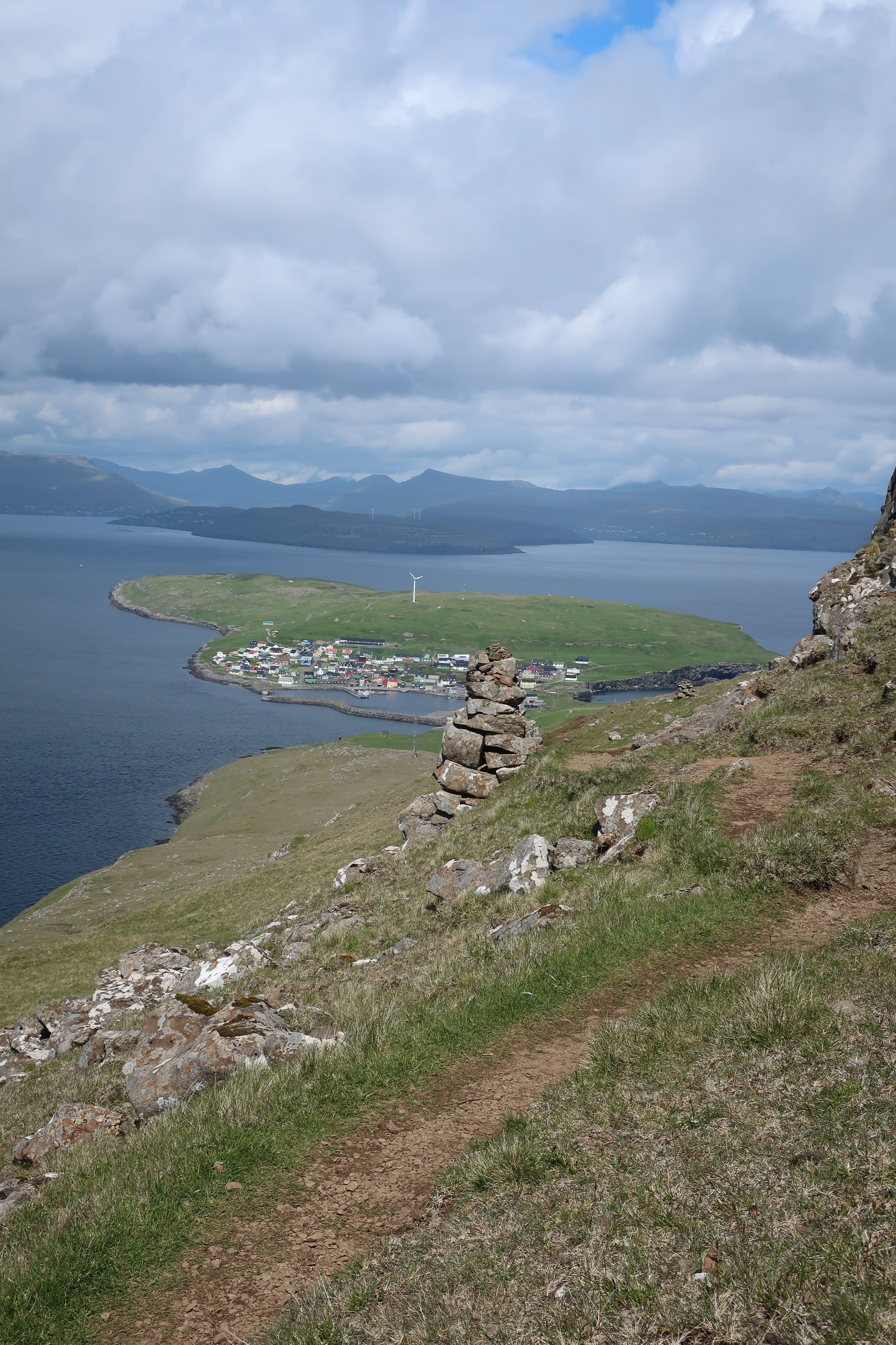 Auf Nolsoy angekommen laufen wir los zum Leuchtturm am Ende der Insel. Der Wanderweg ist mit blauen Stäben markiert und gut zu finden. Zu Beginn geht es leicht bergauf, stellenweise immer wieder kurze Steige, aber diese sind gut zu machen.