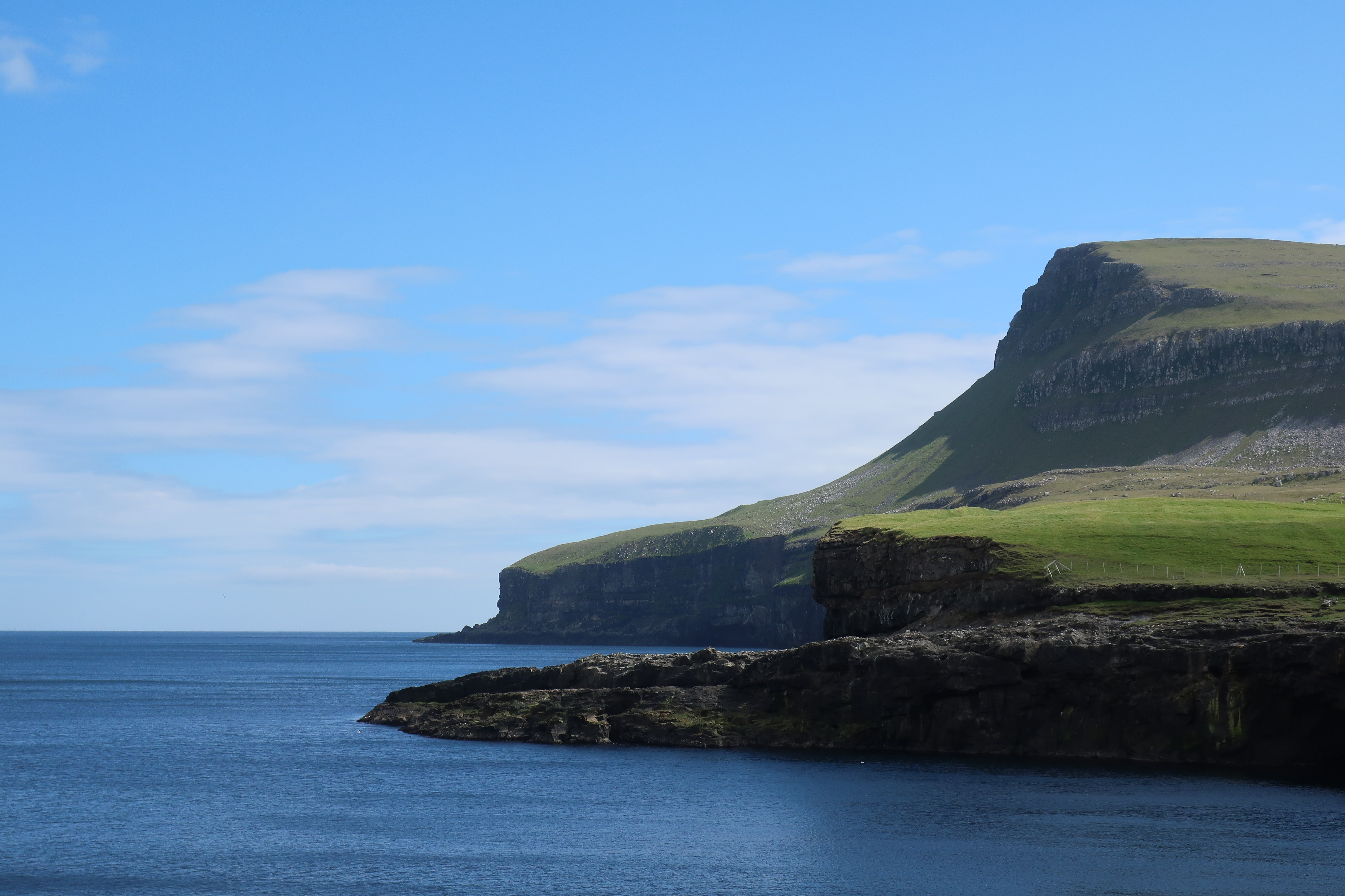 Im Ort gibt es einige kleine Cafés. Am Hafen kehren wir noch ein und genießen frisch gebackene Waffeln mit Rhabarber-Kompott und Sahne. Dazu gibt es Rhabarber-Spritz (mit frischen Rhabarber-Sirup). (Neben Kartoffeln ist Rhabarber das einzige was auf den Färöer Inseln wächst, dementsprechend gibt es ihn in allen erdenklichen Varianten.)