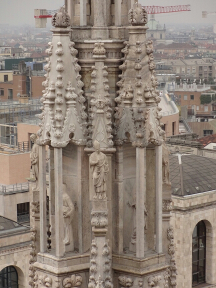 Das Wetter meint es gut mit uns und es lockert ein wenig auf. Wir nutzen das blaue Wolkenloch und steigen dem Dom auf das Dach. Von hier sieht man wie unglaublich filigran die Verzierungen sind.