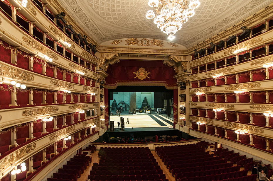 Am anderen Ende stehen wir vor der Mailänder Scala und biegen in das Museum ab. Wir haben Glück, es sind kaum Leute da. Wir haben die Mittagszeit erwischt. Vom Museum aus dürfen wir in eine der Logen des Saals blicken. Die Inneneinrichtung ist wirklich prunkvoll und man kann sich gut vorstellen, wie es sich hier anfühlt, eine Vorstellung zu erleben.