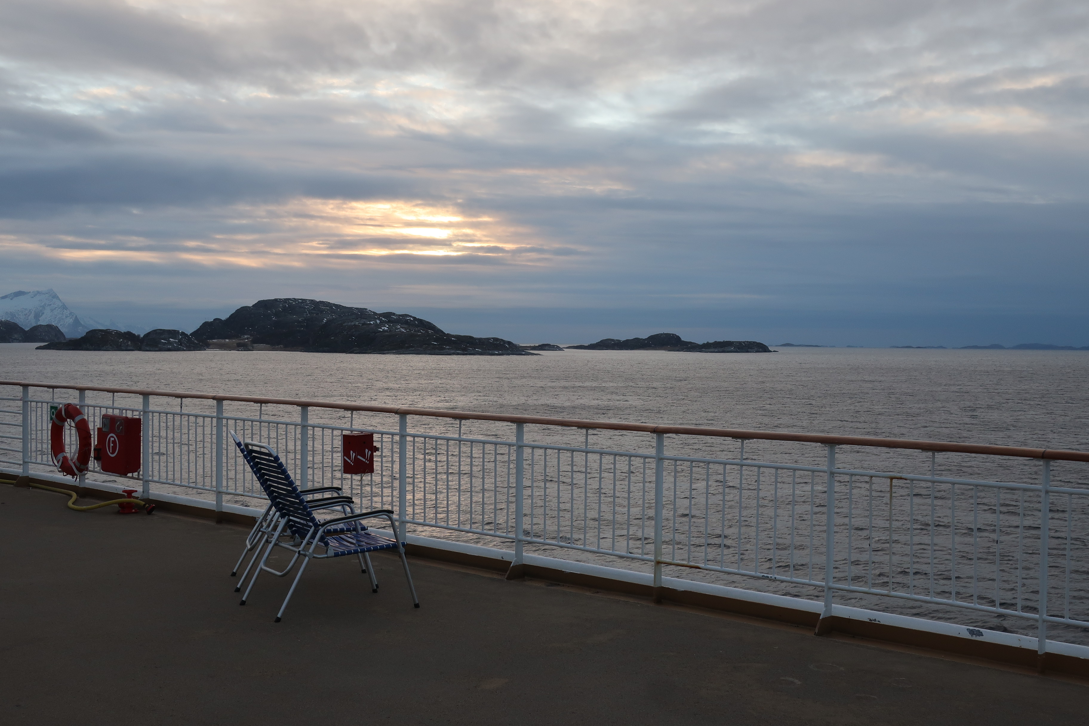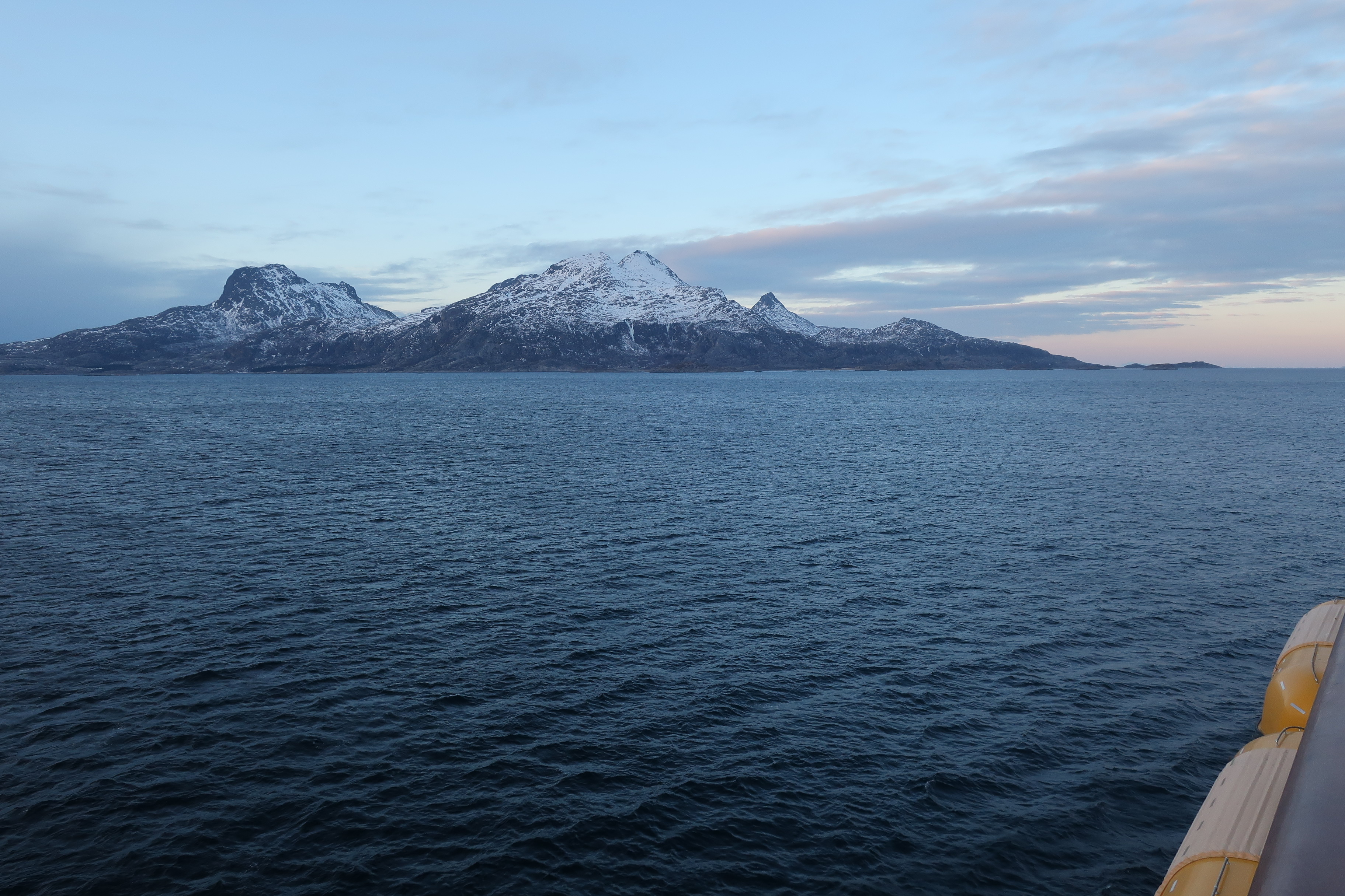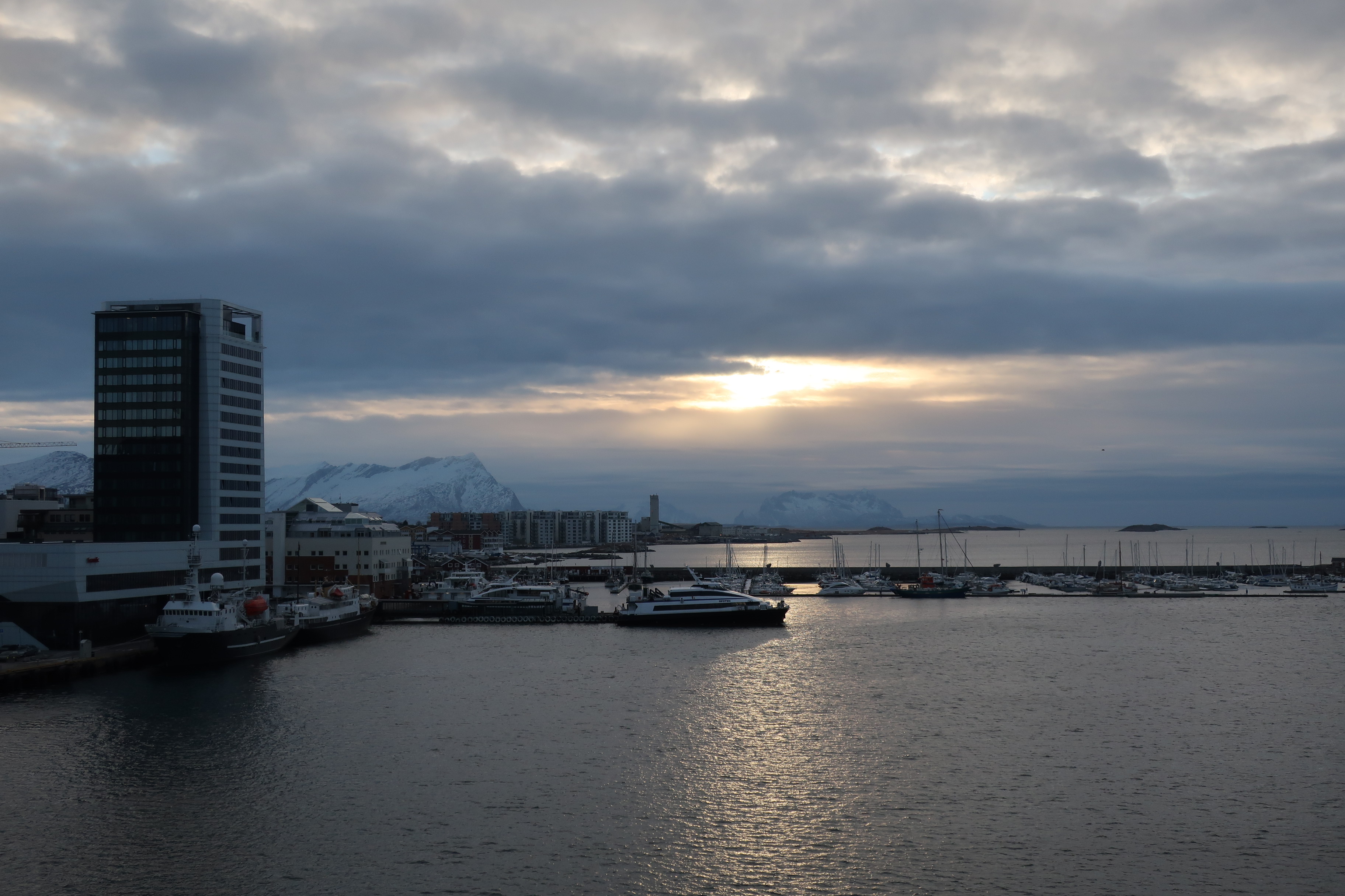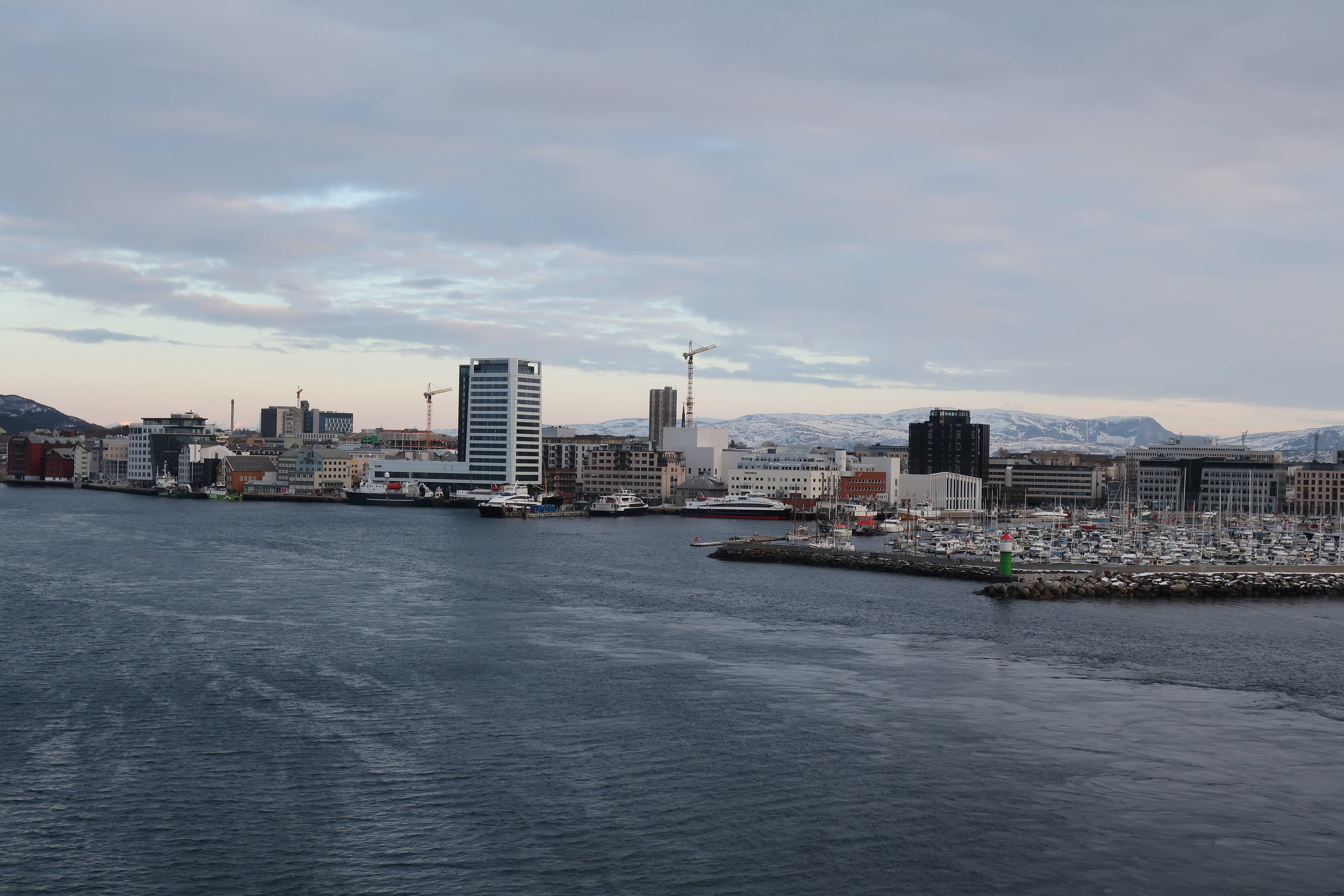 Nächste Etappe mit dem Flugzeug: Oslo – Bodø. Von dort setzen wir dann mit der MS Trollfjord über auf die Lofoten (wie praktisch, dass die Hurtigrute auch Autos mit nehmen kann). Kurz vor der Abenddämmerung laufen wir aus dem Hafen in Bodø aus.